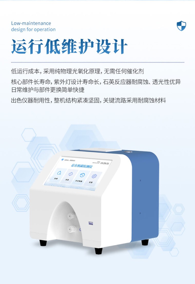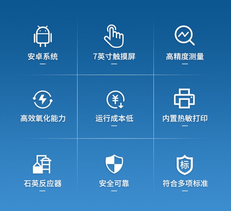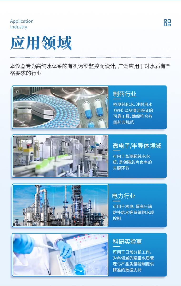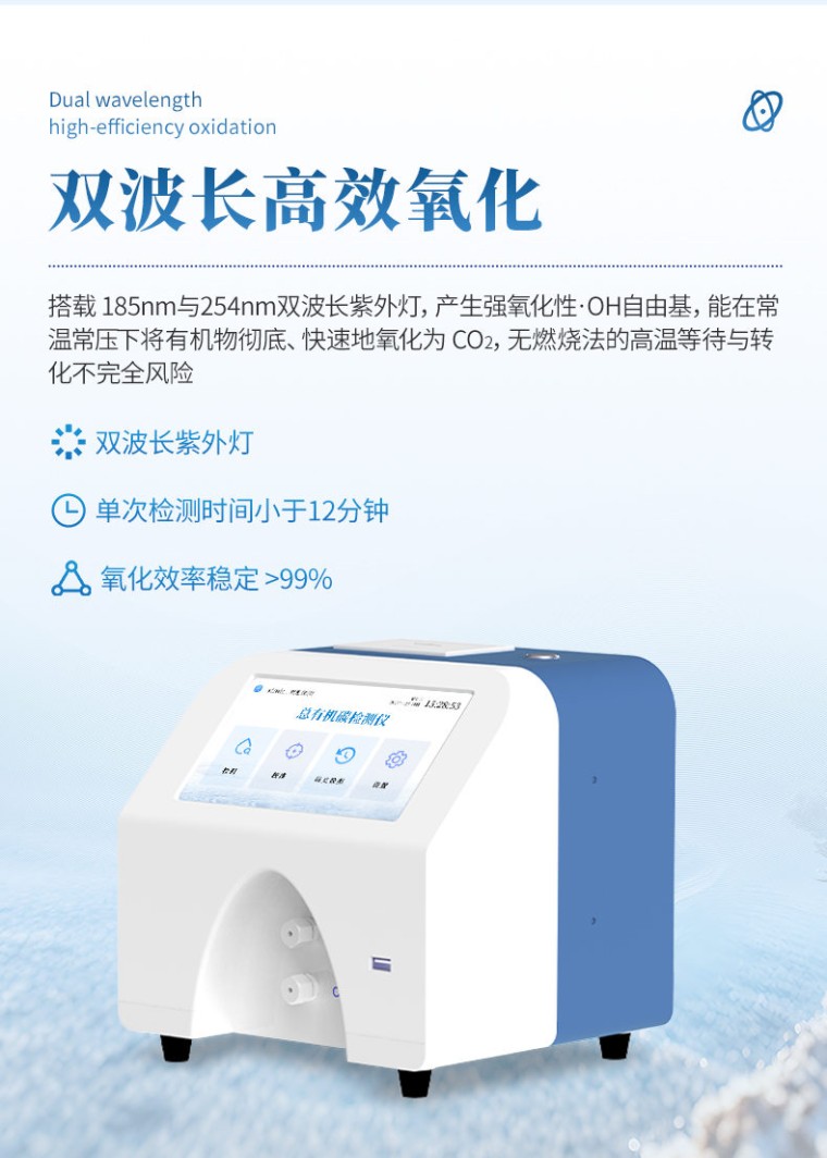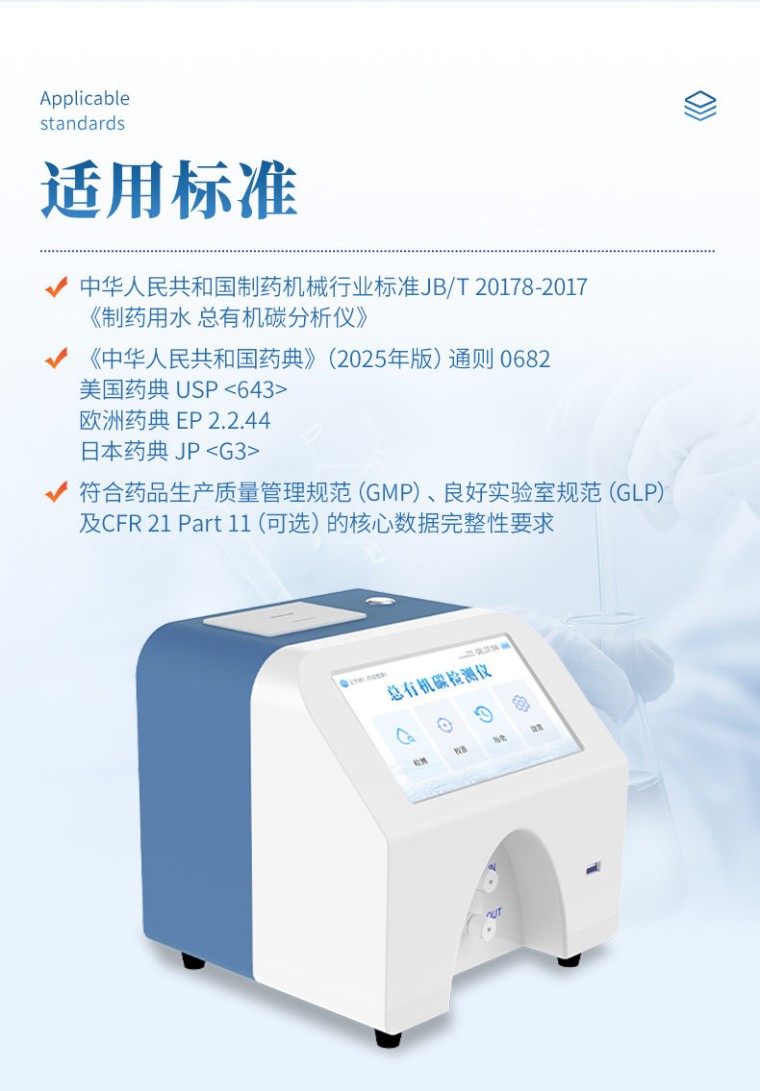 一、仪器简介 水中总有机碳分析仪(电导率法)专为高纯水水质检测而设计。仪器采用先进的差值电导率检测技术,通过紫外氧化将水样中的有机碳高效转化为二氧化碳,并精准测量其导致的电导率变化,从而实现对TOC含量的精确、快速分析。 产品具有检测限低、灵敏度高、响应速度快及稳定性好等特点,操作界面简洁,易于使用。可广泛应用于制药、微电子、电力等行业的生产用水、注射用水和纯化水的检测,是确保水质安全、满足药典及相关行业法规要求的可靠工具。 二、检测原理 水中总有机碳分析仪核心检测原理是基于差值电导率法,精准测量的关键在于光化学氧化技术。 仪器利用特定波长的紫外光直接照射水样,产生具有极强氧化性的自由基(如·OH羟基自由基)。这些高能自由基能迅速且彻底地将水中有机物分子氧化降解为二氧化碳(CO₂)。生成的CO₂溶于水后形成碳酸,引起水样电导率的显著变化。高精度电导率传感器通过精确捕捉氧化前后电导率的差值,并自动扣除无机碳等的本底干扰,最终经仪器内部的算法模型换算,即可专一、准确地得到水样中的总有机碳(TOC)含量。这种光化学氧化方式无需高温高压,反应快速完全,结合电导率检测的高灵敏度,使其特别适用于高纯水的精准监测。 三、适用标准 水中总有机碳分析仪设计、制造与性能符合以下国内外权威标准与规范的要求。 1、中华人民共和国制药机械行业标准 JB/T 20178-2017《制药用水 总有机碳分析仪》 2、各国药典通则 《中华人民共和国药典》(2025年版)通则 0682 美国药典 USP <643> 欧洲药典 EP 2.2.44 日本药典 JP 3、数据完整性规范 仪器软件系统支持审计追踪、用户分级权限管理及电子记录,符合药品生产质量管理规范(GMP)、良好实验室规范(GLP)及CFR 21 Part 11(可选)的核心数据完整性要求。 四、应用范围 本仪器专为高纯水体系的有机污染监控而设计,广泛应用于对水质有严格要求的行业。它是制药行业在线监测纯化水、注射用水(WFI)以及清洁验证的可靠工具,确保符合各国药典规范。在微电子及半导体领域,可用于监测超纯水水质,是保障芯片良率的关键环节。同时,也适用于电力行业中的核电、超高压锅炉补给水等系统的水质控制,以及科研实验室的日常分析工作,为各领域的精细水质管理与产品质量控制提供精准的数据支持。 五、仪器特点 本仪器基于先进的“紫外氧化-差示电导率法”原理匠心打造,集高灵敏检测、智能化操作、低耗维护与合规安全于一体,是针对制药、微电子、电力等行业高纯水 TOC 监测的理想解决方案。其核心优势体现在以下五个维度: 1.★精准可靠的检测性能 (1)Ppb 级超高灵敏度:采用高稳定性差分电导率检测系统与专属信号处理算法,可实现 0.001 mg/L(1 ppb) 的极低检出限,满足《中国药典》等对纯化水、注射用水的严苛要求。 (2)快速高效的氧化能力:搭载 185 nm 与 254 nm 双波长紫外灯,产生强氧化性·OH自由基,能在常温常压下将有机物彻底、快速地氧化为 CO₂,单次检测时间小于 12 分钟,氧化效率稳定 >99%,无燃烧法的高温等待与转化不完全风险。 (3)**的重复性与抗干扰性:仪器具备自动温度补偿、实时基线校正和本底扣除功能,对低浓度样品具有出色的重复性(RSD ≤2%),并能有效消除水中常见无机碳(IC)及离子干扰。 2、智能便捷的用户体验 (1)全触控智能操作系统:配备 7 英寸高清电容触摸屏,运行深度定制的 Android 系统。UI 界面直观友好,提供向导式操作流程,从开机、清洗、校准到检测,步步引导,极大降低操作人员培训门槛。 (2)灵活的检测与校准模式:支持离线单次、在线连续及定时间隔三种检测模式,适应实验室抽检与在线监控不同场景。校准流程智能化,支持多点自动拟合,并可在软件内一键查看历史校准曲线与拟合度(R²)。 (3)一键式智能维护:集成“一键清洗”“一键校准” 功能,简化日常操作。系统具备自诊断能力,可对紫外灯寿命、管路状态、传感器异常等进行预警。 3、完善合规的数据管理 (1)满足数据完整性要求:内置符合 GMP/GLP规范 的审计追踪(Audit Trail)系统,自动记录所有关键操作(登录、检测、校准、设置修改等)、操作者及时间戳。支持三级用户权限管理(管理员、操作员、观察员),确保数据不可篡改与可追溯。 (2)多重数据互通渠道:内置 Wi-Fi 与以太网接口,检测数据可实时或批量自动上传至企业 LIMS 系统或专属云平台,实现远程监控与集中管理。同时配备 USB 端口,方便本地数据导出。 (3)即时报告输出:内置高速热敏打印机,可自动或手动打印包含检测结果、曲线图谱、样品信息及二维码的完整报告,方便数据归档与现场记录。 4、经济高效的低维护设计 (1)极低的运行成本:采用纯物理光氧化原理,无需任何催化剂、燃烧管、载气(如高纯氧气)等昂贵消耗品,相较于传统燃烧法,年均使用成本可降低 60%以上。 (2)核心部件长寿命:关键部件如紫外灯设计寿命长达 8,000小时,石英反应器耐腐蚀、透光性优异。模块化设计使得日常维护与部件更换简单快捷,无需专业人员即可完成。 (3)出色的仪器耐用性:整机结构紧凑坚固,关键流路采用耐腐蚀材料,适应实验室及在线安装的复杂环境,故障率低,有效保障生产与检测的连续性。 5、安全可靠的设计保障 (1)本质安全,绿色环保:整个检测过程在常温常压下进行,无高温高压风险,无需使用易燃易爆气体,无