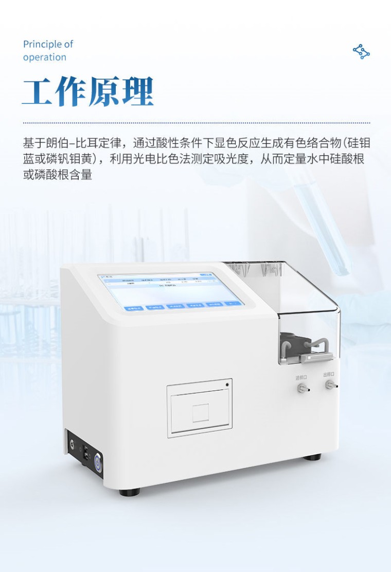 一、产品简介 实验室硅酸根分析仪适用于检测样水中常量硅酸根离子的含量。广泛应用于发电厂、化工化肥、冶金、环保、制药、化纤、半导体等行业,适用于除盐水、蒸汽冷凝水、炉水等水中可溶性硅酸根含量的检测分析;参考《GB/T12149-2017工业循环冷却水和锅炉用水中硅的测定》标准设计制造。 二、工作原理 硅酸根分析仪利用光电比色原理进行测量。在pH为1.1~1.3条件下,水中的可溶硅与钼酸铵生成黄色硅钼络合物,用硫酸亚铁铵溶液把硅钼络合物还原成硅钼蓝,用硅酸根分析仪测定其硅含量,根据朗伯-比耳定律:当一束单色平行光通过有色的溶液时,一部分光能被溶液吸收,若液层厚度不变,光能被吸收的程度(吸光度A)与溶液中有色物质的浓度成正比。 三、产品特点 1、*7英寸彩色触摸屏,Android智能操作系统,操作交互性体验更好,使用更流畅; 2、*采用蠕动泵连续自动进样,流式检测不受样品数限制,可连续多样品测试,并且节省试剂耗材; 3、*具有wifi联网功能,可将检测数据快速无线上传; 4、定制波长高稳定性LED冷光源,检测数据更稳定,功耗低,寿命长; 5、*专业的防尘盖设计,有效的保护了蠕动泵及软管工作; 6、智能恒流稳压,光强自动调节与校准,长时间连续工作光源无温漂现象; 7、内置高速热敏打印机,检测完成可自动打印检测报告; 8、*高容量16G存储容量,检测结果存储容量500万条。 9、*配置数据云平台,检测结果可长期存储,进行长短期查看分析,辅助管理。 10、同时支持U盘直接拷贝数据,标准USB接口,免驱动插拔。 11、*具有自清洗功能,检测完成可自动清洗管路。 12、可选配内置锂电池供电。 四、技术指标 1、测量范围:0.05~10mg/L; 2、含量分辨率:0.001mg/L; 3、吸光度分辨率:0.001 4、显示方式:7寸彩色触摸屏; 5、基本误差:±2%F.S; 6、重复性误差:±1%F.S; 7、稳定性:±1%F.S/24h; 8、被测水样:20~35℃; 9.*数据储存:500万条; 10、打印功能:内置热敏打印机; 11.*进样方式:蠕动泵,自动进样(非手动加样); 12.*输出方式:WIFI无线上传、USB; 13、工作电源:AC220V@50Hz; 14、功耗:≤7W; 15、外形尺寸:320*190*250mm(长*宽*高); 16、工作条件:环境温度:(5~45)℃,相对湿度:≤85%RH(无冷凝); 17、重量:3.8KG; 18、仪器包装尺寸:410*330*390mm 19、包装重量:5.3kg;