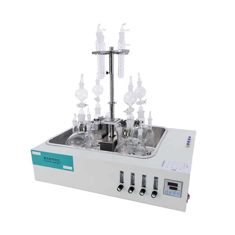 产品说明 1、产品原理 水样中的硫化物经酸化,生成的硫化氢随载气(氮气)进入吸收瓶/吸收显色管中被吸收溶液(乙酸锌-乙酸钠溶液或2%氢氧化钠溶液)吸收,选择相应的分析方法对吸收瓶/吸收显色管中吸收的硫离子进行分析测定。 2、产品用途 水质硫化物酸化吹气仪根据水质硫化物的测定-亚甲基蓝分光光度法(碘量法)标准开发生产的。满足水质硫化物测定的样品前处理需要。 3、产品执行标准 2022年新国标HJ1226-2021《水质硫化物的测定--亚甲基蓝分光光度法 产品特点 1、大容量反应瓶,可同时处理多个样品。 2、盐酸口、气体进口、出口三口一体且相互独立,操作会不干扰。 3、恒温水浴加热,具有快速自动恒温控制系统,加热温度可以手动设定。 4、由升降位置固定旋钮调节样品架及配气系统的升降旋转样品架,正面安装样品,操作方便。 5、每个样品的氮气流量独立控制调节或关闭,针阀气体流量计准确控制和显示气体总消耗量。 产品参数 1、样品数:4位 2、加热方式:自动控温恒温水浴 3、加热功率:l000W,加热均匀 4、氮气流量计控制:0-3L/min 5、温度范围:室温-99.9℃ 6、显示方式:数字显示 7、控温精度:±1℃ 8、氮气入口压力:0.1Mpa 9、氮气流量支路:0-0.6L/min 10、工作电源:AC(220±22)V,50HZ 11、环境温度:(5-35)℃ 12、环境湿度:(0-95)%RH 随机组件