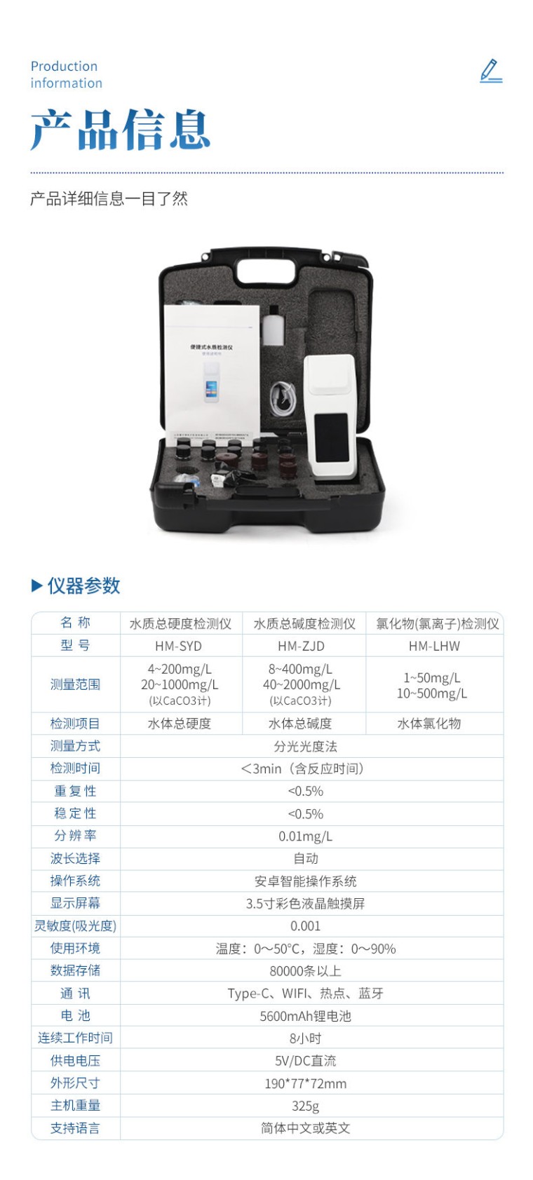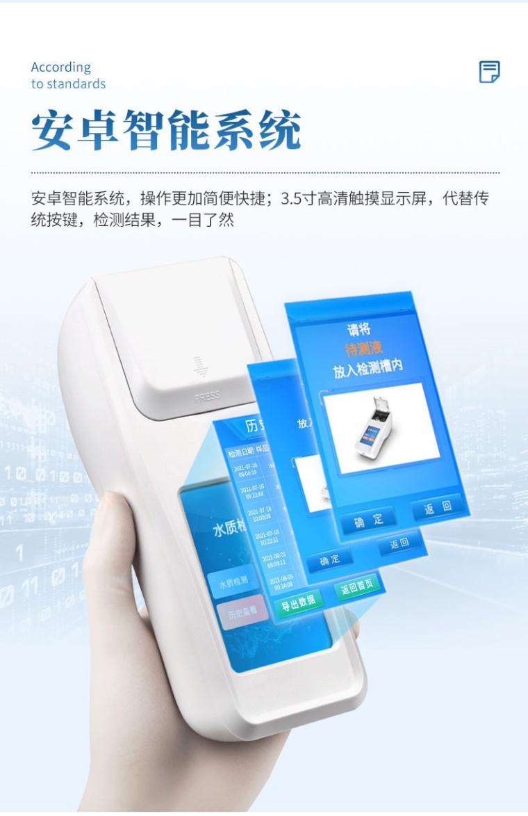 产品概述: 水质总碱度检测仪可简单快速测试水质中总碱度浓度值。利用比色法原理配合总碱度检测试剂快速准确测试水中总碱度含量。 应用行业: 可以广泛应用于工业用水、纯净水厂、自来水厂、生活饮用水、环保监测、锅炉用水、水产养殖、泳池水质管理等行业。 仪器特点: ①安卓智能系统,操作更佳简便快捷; ②配置云监控平台,检测结果可直接无线传至平台,进行水质长短期分析,辅助管理。 ③内置操作流程、操作简单、无需培训、直接上手; ④检测速度更快,现场读取数据; ⑥便携式体积小,重量轻,方便户外检测; ⑦外形小巧美观,工作稳定免维护,具有较好的性价比; ⑧采用进口冷光源,光学性能稳定,寿命长达10万小时; ⑨交直流两用,内置充电锂电池,环保耐用可支持连续室内外工作。 参数指标: 检测项目:水体总碱度; 测量范围:8~400mg/L(以CaCO3计),40~2000mg/L(以CaCO3计); 测量方式:分光光度法; 检测时间:<3min(含反应时间); 重复性:<0.5%; 稳定性:<0.5%; 分辨率:0.01mg/L; 波长选择:自动; 操作系统:安卓智能操作系统; 显示屏幕:3.5寸彩色液晶触摸屏; 灵敏度(吸光度):0.001; 使用环境:温度0~50℃,湿度0~90%; 数据存储:80000条以上; 通讯:Type-C、WIFI、热点、蓝牙; 电池:5600mAh锂电池; 连续工作时间:8小时; 供电电压:5V/DC直流; 外形尺寸:190*77*72mm 主机重量:325g 支持语言:简体中文或英文;