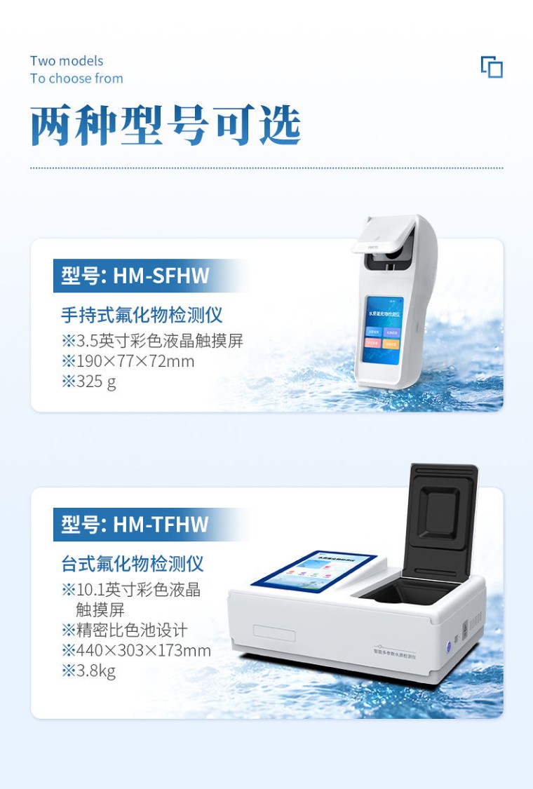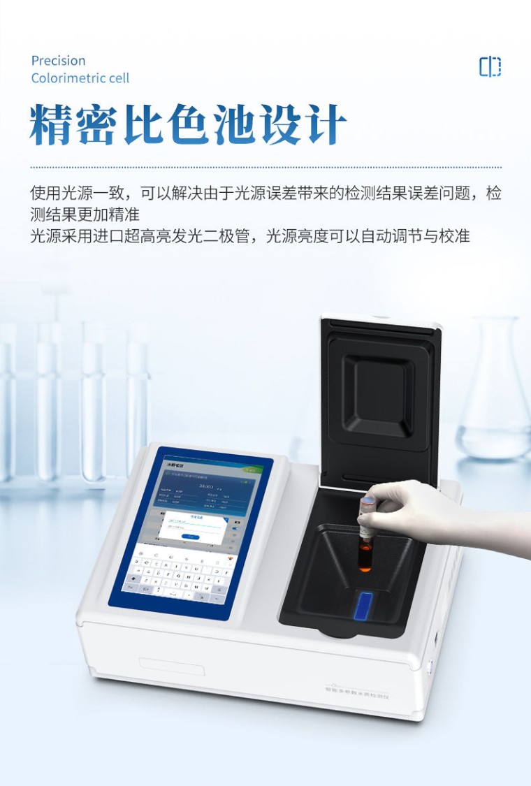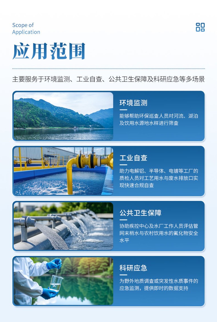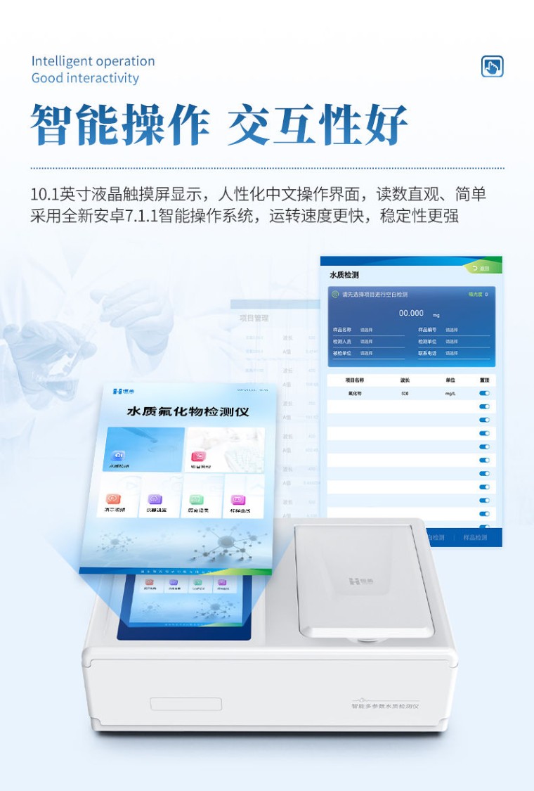 一、仪器简介 水质氟化物检测仪是一款基于氟试剂分光光度法开发的专业设备,专为快速、准确评估水质安全而设计。 氟化物是关乎健康与安全的“双面指标”:饮用水中适量氟有益牙齿,但过量则会导致氟斑牙、氟骨症,并危害生态环境、腐蚀工业设备。本仪器通过检测经专用试剂显色的水样吸光度,自动依据内置标准曲线计算浓度,精准区分安全与危害。 仪器将复杂的实验室分析流程集成机身中,操作简捷,其性能符合国家标准方法要求,适用于饮用水安全筛查、环境水体巡查、工业废水排放监控及应急检测等多种场景,是保障用水安全、实现高效现场管控的得力工具。 二、 检测原理 本仪器采用氟试剂分光光度法(国标方法原理)。水样中的氟离子在特定酸度下,与氟试剂及硝酸镧反应,生成稳定的蓝色三元络合物,其颜色深度与氟离子浓度成正比。仪器内的精密光学系统会测量该溶液的特定波长吸光度,并自动依据预先内置的校准曲线,直接计算出水中氟化物的准确浓度值(mg/L)。该方法抗干扰能力强,结果准确可靠。 三、 应用范围 本仪器是快速检测水中氟化物的专业工具,主要服务于环境监测、工业自查、公共卫生保障及科研应急等多类场景。它能够帮助环保巡查人员对河流、湖泊及饮用水源地水样进行筛查;助力电解铝、半导体、电镀等工厂的质检人员对工艺用水与废水排放口实现快速合规自查;协助疾控中心及水厂工作人员评估管网末梢水与农村饮用水的氟化物安全水平;同时也为野外地质调查或突发性水质事件的应急监测,提供即时的数据支持。 四、产品特点 1、采用全新安卓7.1.1智能操作系统,人性化中文操作界面,运转速度更快,稳定性更强; 2.10英寸液晶触摸屏显示,人性化中文操作界面,读数直观、简单; 3、采用精密比色池设计,使用光源一致,可以解决由于光源误差带来的检测结果误差问题,检测结果更加精准; 4、光源采用进口超高亮发光二极管,光源亮度可以自动调节与校准; 5、具有无线通讯功能,支持Wi-Fi、RJ45、手机热点联网传输,检测数据亦可通过U盘导出; 6、多功能样品管理,可对样品进行中英文命名,方便样品记录和数据存储; 7、仪器可**存储800万组数据,为方便大量数据查找,可通过时间检索,并随意选择分析; 8、仪器带有监管云平台,数据可通过局域网和互联网上传,亦可对接上传至环境监管部门平台。 9、内置热敏行式打印机,打印纸上的内容可自由选择(包括二维码打印); 10、可选配6 ah大容量充电锂电池,方便户外流动测试; 11、内置教学演示视频,用户可一边看仪器内操作视频,一边进行实验操作,更易上手; 12、后期产品固件可升级。 五、技术参数 1、性能参数 (1)示值误差:≤ ± 5% (2)仪器重复性:<0.5% (3)仪器稳定性:<0.5% (4)存储数据:800万组 (5)支持波长:620 nm (6)光化学稳定性:20 min内数值漂移小于0.005 A 2、物理参数 (1)操作系统:Android 7.1.1 智能操作系统 (2)显示屏:10.1英寸高清晰度彩色液晶触摸屏 (3)网络接口:Wi-Fi、热点、RJ45 (4)操作界面:中文/英文(出厂可选) (5)比色方式:比色管 (6)打印机:热敏行式打印机 (7)通讯接口:USB2.0 (8)供电方式:12V直流电源适配器,可选配大容量充电锂电池 (9)数据导出格式:Excel表格 (10)云平台:仪器带有监管平台,连接网络,检测结果直接传至环境安全监管平台 (11)仪器尺寸:440 mm × 303 mm × 173 mm (12)仪器重量:3.8 kg(不含适配器或充电器及电池) 3、工作环境参数 (1)环境温度:(5 ~ 40)℃ (2)环境湿度:相对湿度<85%(无冷凝) (3)工作电源:220V AC转12V DC适配器(可选配锂电池供电) (4)功耗:25 W
