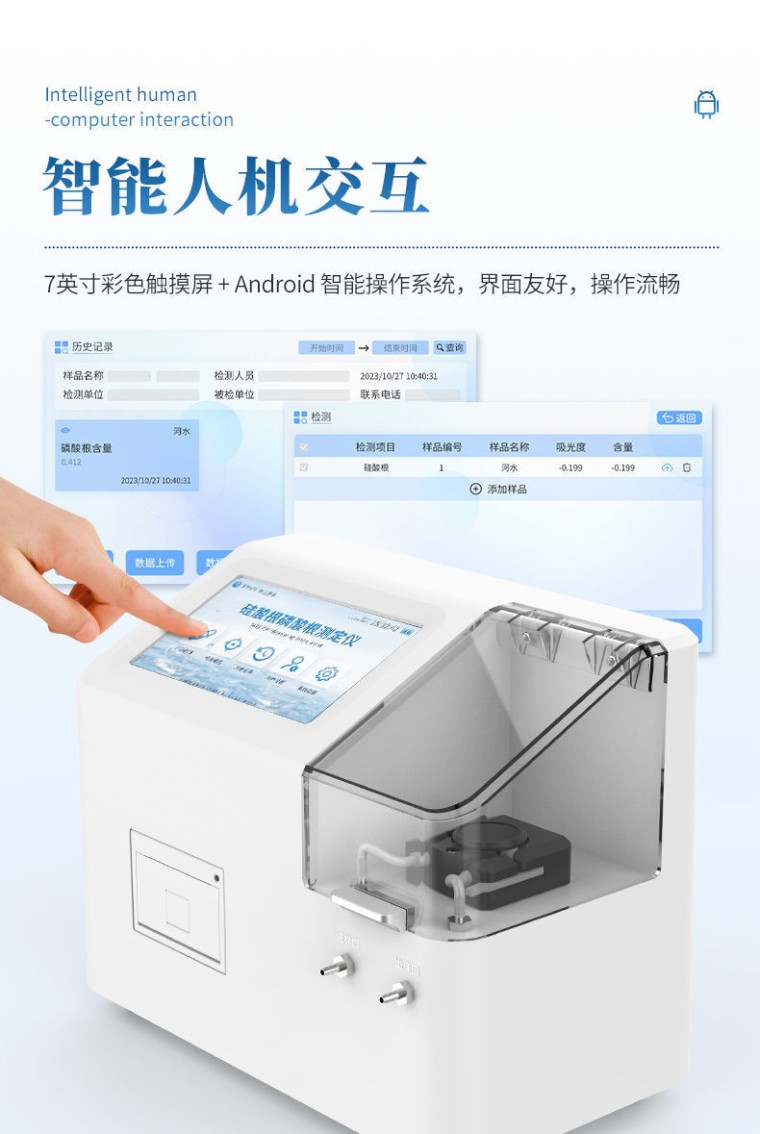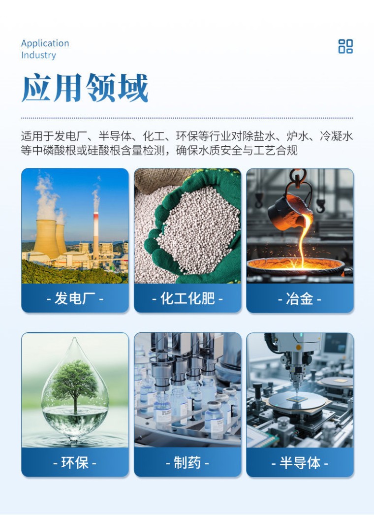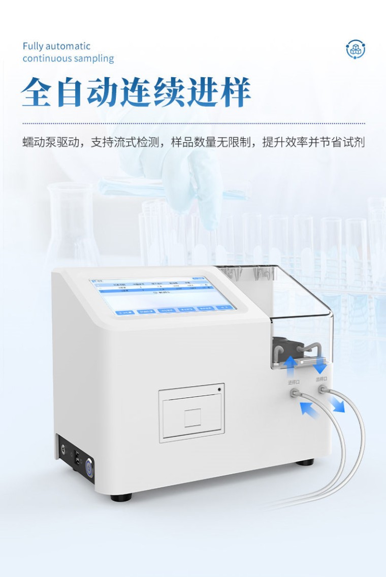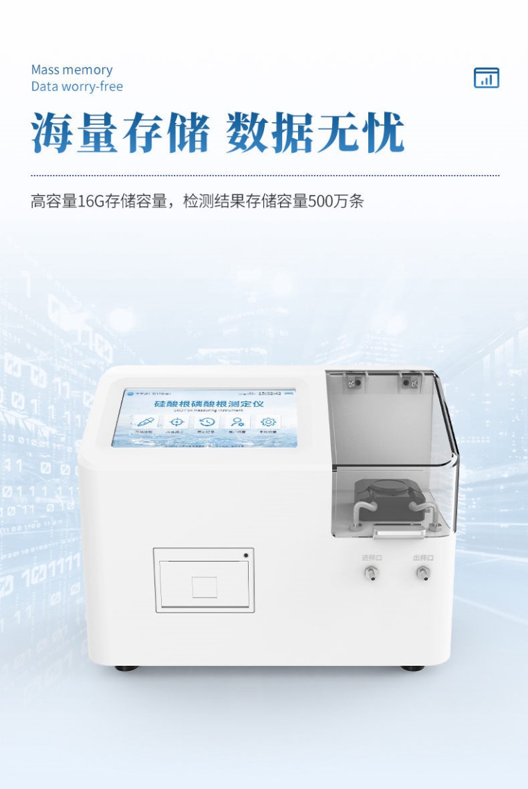 一、产品简介: 实验室磷酸根分析仪集自动进样技术和光电检测技术于一体的快速分析设备。仪器通过对显色完成的反应液进行比色定量,根据仪器内置的标准曲线,获得对应的磷酸盐含量。本仪器适用发电厂、化工化肥、冶金、环保、制药、化纤、半导体等行业,适用于除盐水、蒸汽冷凝水、炉水等水中可溶性磷酸根离子含量的检测分析。参考标准《GB/T 6913-2023 锅炉用水和冷却水分析方法 磷酸盐的测定》设计制造。 二、工作原理: 实验室磷酸根分析仪利用光电比色原理进行测量。在酸性介质水样中的磷酸盐与钒钼酸生成黄色的磷钒钼酸混合物,然后用磷酸根分析仪通过光电比色原理测定其磷酸根离子含量。根据朗伯-比耳定律:当一束单色平行光通过有色的溶液时,一部分光能被溶液吸收,若液层厚度不变,光能被吸收的程度(吸光度A)与溶液中有色物质的浓度成正比。 三、产品特点: 1、7英寸彩色触摸屏,Android7.1.1智能操作系统,操作交互性体验更好,使用更流畅; 2、采用蠕动泵连续自动进样,流式检测不受样品数限制,可连续多样品测试,并且节省试剂耗材; 3、具有wifi联网功能,可将检测数据快速无线上传; 4、定制波长高稳定性LED冷光源,检测数据更稳定,功耗低,寿命长; 5、专业的防尘盖设计,有效的保护了蠕动泵及软管工作; 6、智能恒流稳压,光强自动调节与校准,长时间连续工作光源无温漂现象; 7、内置高速热敏打印机,检测完成可自动打印检测报告; 8、高容量16G存储容量,检测结果存储容量500万条。 9、配置数据云平台,检测结果可长期存储,进行长短期查看分析,辅助管理。 10、同时支持U盘直接拷贝数据,标准USB接口,免驱动插拔。 11、具有自清洗功能,检测完成可自动清洗管路。 四、技术参数: 1、检测参数:磷酸盐 2、测量范围:0~5mg/L,0~50mg/L(分段可选); 3、分辨率:0.01mg/L; 4、显示方式:7寸彩色触摸屏; 5、基本误差:±2%F.S; 6、重复性误差:±0.5%F.S; 7、稳定性:±1%F.S/24h; 8、被测水样:20~35℃; 9、数据储存:500万条; 10、打印功能:内置热敏打印机; 11、进样方式:蠕动泵,自动进样(非手动加样); 12、输出方式:WIFI无线上传、USB; 13、工作电源:AC220V@50Hz; 14、功耗:≤7W; 15、外形尺寸:315*180*250mm(长*宽*高); 16、工作条件:环境温度:(5~45)℃,相对湿度:≤85%RH(无冷凝); 17、重量:3.8KG; 18、仪器包装尺寸:410*330*390mm 19、包装重量:5.3kg