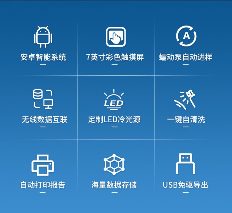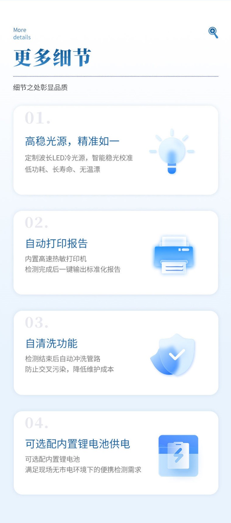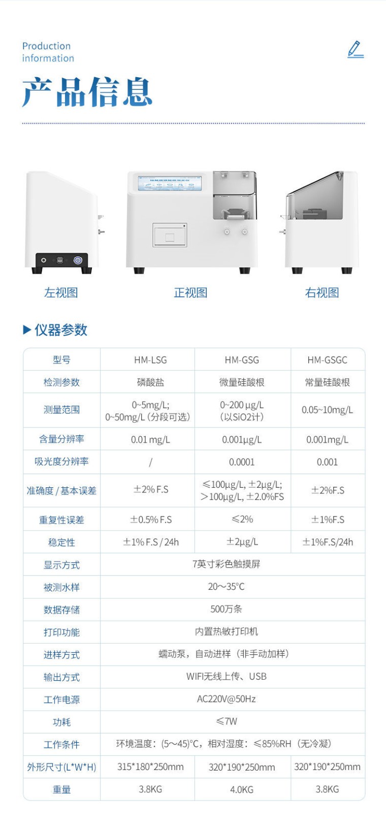 一、产品简介: 实验室磷酸根分析仪集自动进样技术和光电检测技术于一体的快速分析设备。仪器通过对显色完成的反应液进行比色定量,根据仪器内置的标准曲线,获得对应的磷酸盐含量。本仪器适用发电厂、化工化肥、冶金、环保、制药、化纤、半导体等行业,适用于除盐水、蒸汽冷凝水、炉水等水中可溶性磷酸根离子含量的检测分析。参考标准《GB/T 6913-2023 锅炉用水和冷却水分析方法 磷酸盐的测定》设计制造。 二、工作原理: 实验室磷酸根分析仪利用光电比色原理进行测量。在酸性介质水样中的磷酸盐与钒钼酸生成黄色的磷钒钼酸混合物,然后用磷酸根分析仪通过光电比色原理测定其磷酸根离子含量。根据朗伯-比耳定律:当一束单色平行光通过有色的溶液时,一部分光能被溶液吸收,若液层厚度不变,光能被吸收的程度(吸光度A)与溶液中有色物质的浓度成正比。 三、产品特点: 1、7英寸彩色触摸屏,Android7.1.1智能操作系统,操作交互性体验更好,使用更流畅; 2、采用蠕动泵连续自动进样,流式检测不受样品数限制,可连续多样品测试,并且节省试剂耗材; 3、具有wifi联网功能,可将检测数据快速无线上传; 4、定制波长高稳定性LED冷光源,检测数据更稳定,功耗低,寿命长; 5、专业的防尘盖设计,有效的保护了蠕动泵及软管工作; 6、智能恒流稳压,光强自动调节与校准,长时间连续工作光源无温漂现象; 7、内置高速热敏打印机,检测完成可自动打印检测报告; 8、高容量16G存储容量,检测结果存储容量500万条。 9、配置数据云平台,检测结果可长期存储,进行长短期查看分析,辅助管理。 10、同时支持U盘直接拷贝数据,标准USB接口,免驱动插拔。 11、具有自清洗功能,检测完成可自动清洗管路。 四、技术参数: 1、检测参数:磷酸盐 2、测量范围:0~5mg/L,0~50mg/L(分段可选); 3、分辨率:0.01mg/L; 4、显示方式:7寸彩色触摸屏; 5、基本误差:±2%F.S; 6、重复性误差:±0.5%F.S; 7、稳定性:±1%F.S/24h; 8、被测水样:20~35℃; 9、数据储存:500万条; 10、打印功能:内置热敏打印机; 11、进样方式:蠕动泵,自动进样(非手动加样); 12、输出方式:WIFI无线上传、USB; 13、工作电源:AC220V@50Hz; 14、功耗:≤7W; 15、外形尺寸:315*180*250mm(长*宽*高); 16、工作条件:环境温度:(5~45)℃,相对湿度:≤85%RH(无冷凝); 17、重量:3.8KG; 18、仪器包装尺寸:410*330*390mm 19、包装重量:5.3kg