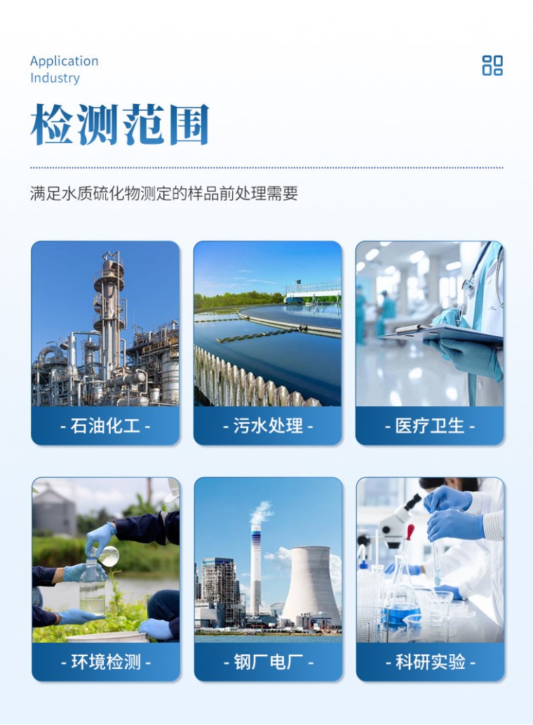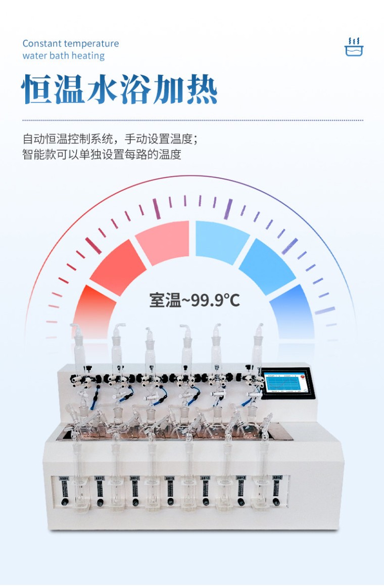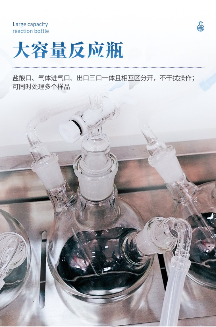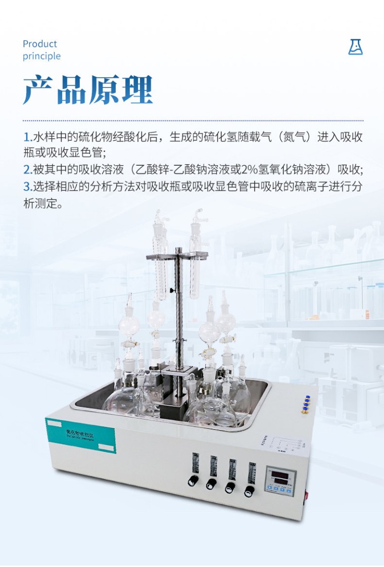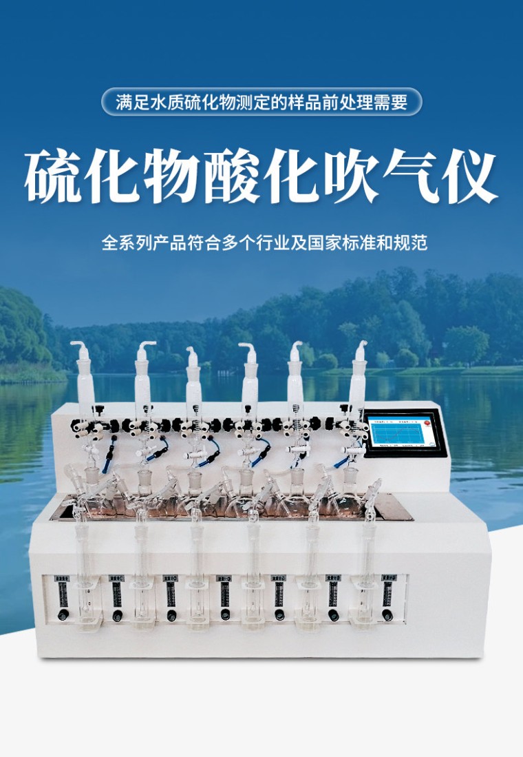 产品说明PRODUCT DESCRIPTION 水样中的硫化物经酸化,生成的硫化氢随载气(氮气)进入吸收瓶/吸收显色管中被吸收溶液(乙酸锌-乙酸钠溶液或2%氢氧化钠溶液)吸收,选择相应的分析方法对吸收瓶/吸收显色管中吸收的硫离子进行分析测定。水质硫化物酸化吹气仪根据2022年新国标水质硫化物的测定-亚甲基蓝分光光度法(典量法)标准开发生产的。水质硫化物测定的样品前处理需要。 产品特点: 1、大容量反应瓶,可同时处理多个样品。 2、恒温水浴加热,具有快速自动恒温控制系统,加热温度可以手动设定。 3、每个样品的氮气流量独立控制调节或关闭,针阀气体流量计准确控制和显示气体总消耗量。 4、由升降位置固定旋钮调节样品架及配气系统,旋转样品架的升降,正面安装样品,操作方便。 5、盐酸口、气体进气口、出口三口一体且相互区分开,不干扰操作。 1、原理和用途 2、产品执行标准 2022年新国标HJ1226-2021《水质硫化物的测定--亚甲基蓝分光光度法》 产品参数: *样品数:6位 *反应瓶:500ml*6个 *吸收管:100ml*6个 *控制方式:7寸大液晶触摸屏控制 *加热方式:自动控温恒温水浴 *加热功率:l000W,加热均匀 *氮气流量计控制:0-3L/min *温度范围:室温-99.9℃ *显示方式:数字显示 *控温精度:±0.5℃ *氮气入口压力:0.1Mpa *氮气流量支路:0-1L/min,单独可调 *工作电源:AC220V,50HZ *环境温度:(5-35)℃ *环境湿度:(0-95)%RH