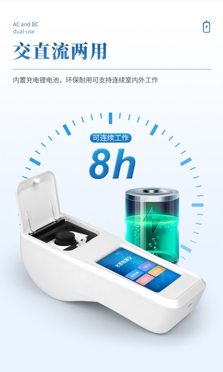 水质总硬度总碱度检测仪可简单快速测试水质中总硬度、总碱度浓度值。利用比色法原理配合总硬度、总碱度检测试剂快速准确测试水中总硬度总碱度含量。 应用行业: 可以广泛应用于锅炉水、工业用水、自来水厂、生活饮用水、石油化工、农业灌溉、饮料食品制造业等行业。 仪器特点: ①安卓智能系统,操作更佳简便快捷; ②配置云监控平台,检测结果可直接无线传至平台,进行水质长短期分析,辅助管理。 ③内置操作流程、操作简单、无需培训、直接上手; ④检测速度更快,现场读取数据; ⑥便携式体积小,重量轻,方便户外检测; ⑦外形小巧美观,工作稳定免维护,具有较好的性价比; ⑧采用进口冷光源,光学性能稳定,寿命长达10万小时; ⑨交直流两用,内置充电锂电池,环保耐用可支持连续室内外工作。 参数指标: 检测项目:水体总硬度,水体总碱度; 测量范围:4~1000mg/L(以CaCO3计),8~2000mg/L(以CaCO3计); 测量方式:分光光度法; 检测时间:<3min(含反应时间); 重复性:<0.5%; 稳定性:<0.5%; 分辨率:0.01mg/L; 波长选择:自动; 操作系统:安卓智能操作系统; 显示屏幕:3.5寸彩色液晶触摸屏; 灵敏度(吸光度):0.001; 使用环境:温度0~50℃,湿度0~90%; 数据存储:80000条以上; 通讯:Type-C、WIFI、热点、蓝牙; 电池:5600mAh锂电池; 连续工作时间:8小时; 供电电压:5V/DC直流; 外形尺寸:190*77*72mm 主机重量:325g 支持语言:简体中文或英文;