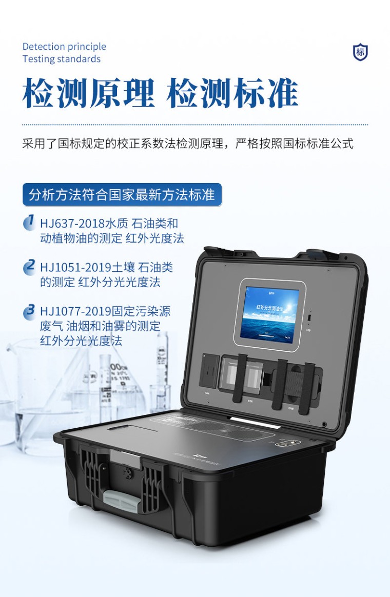 本产品分析方法符合国家**方法标准: “HJ637-2018水质 石油类和动植物油的测定 红外光度法”“HJ1051-2019土壤 石油类的测定 红外分光光度法” “HJ1077-2019固定污染源废气 油烟和油雾的测定 红外分光光度法” 概述 1.1行业介绍 油类物质是一种粘稠的液体,难溶于水,选择性溶解于有机溶剂,相对密度一般都小于 1,分为石油类和动植物油类。石油类是一种由许多分子大小不同的烃类化合物所组成的复杂混合物,含有少量硫、氮、氧的有机化合物。各地的石油成分不一,没有确定的化学成分和物理常数。碳、氢占**优势,总量达 95%~99%,主要以烃类形式存在,是组成石油的主体。烃类由烷烃、环烷烃、芳香烃构成。氧、硫、氮含量占 1%~4%,主要以化合物形式存在,含硫、含氮、含氧的化合物大多富集于渣油或胶质、沥青之中。 油类由CH、CH2、CH3组成的各种碳氢化合物,这是各种油品中固有的特征。由CH、CH2、CH3组成的各种化合物代表整体油类。由于采用四氯乙烯替代四氯化碳的原因,有的定义需要更改成:“扣除四氯乙烯的红外背景吸收值,能被四氯乙烯溶解,并在波数(3030cm-1、2930cm-1、2960cm-1)处有特征吸收的物质称作油”。 波数(3030cm-1、2930cm-1、2960cm-1)分别是CH、CH2、CH3的红外特征吸收。CH、CH2、CH3是全球各种油品中固有的特征,只要能测量样品中CH、CH2、CH3的键能(吸光度),就能测量出油品中的含油量。红外分光测油仪就是依靠油的这类特点在三个波数(3030cm-1、2930cm-1、2960-1)对油进行吸光度检测,从而进行定量分析。 1.2主要用途 可用于:地表水、地下水、生活污水、工业废水、土壤中的矿物油和动植物油及废气中油烟和油雾的排放检测; 适用于:环境监测站、水文站、石油化工、机械、汽车飞机制造等企事业单位。医药、农业科技、海洋运输等行业。 性能及工作参数 2.1基本工作原理 石油类物质的成分非常复杂,其组成也因产地而异,石油的主要成分是烃类(烷烃、环烷烃和芳香烃)。在红外吸收光谱中,由于不同产地的石油类物质,或多或少地存在着亚甲基CH2基团与甲基CH3基团及Ar-H芳香烃之间的比值变化,所以求出各自的校正系数:X为亚甲基CH2基团系数,Y为甲基CH3基团系数,Z为Ar-H芳香烃系数,再求出亚甲基CH2的波数2930cm-1与3030cm-1的比值为F。求出F、X、Y、Z值后,再测定各种石油类,使之达到测定石油类物质不受石油产地变化影响的目的。 定性分析:一定频率的红外线经过分子时,如果分子中某一个键的振动频率和它一样,这个键就吸收红外线而增加能量,振动就会加强;如果分子中没有同样频率的键红外线就不会被吸收。若连续改变红外线的频率照射样品时,则通过样品吸收池的红外线,有些区域较强,有些区域较弱,从而产生了红外吸收光谱。 定量分析:当某波长的光通过被测溶液时,其能量就会被吸收。光强被吸收的强弱与被测物质的浓度成比例 2.2性能指标 仪器检 出 限 DL≤0.04mg/L(四氯乙烯空白液测定11次的3倍SD) 方法检 出 限 0.06mg/L;当样品体积为500ml,萃取液体积为50ml时(HJ637-2018标准) 最低检出浓度 0.003mg/L 样品测量范围 0~100%油(富集和稀释) 基本测量范围 0.0-800mg/L 重 复 性 RSD ≤ 0.6%(30-80mg/L 油样测定 11 次 ) 准确 度 误差 ≤2% 相关 系 数 r>0.999 扫描 速度 全谱扫描,快速模式45 秒钟/次,精密模式3分钟/次 波数 范围 3100cm-1 ~ 2800cm-1 (即 3200nm ~ 3570nm ) 吸光度 范围 0.0000 ~ 2.0000AU (即透过率 100 ~ 1%T ) 分光 精度 2nm 温湿度范围 1 ℃ - 40 ℃,湿度≤ 90% 主机 尺寸 500mm × 350mm × 200m (长宽高) 使用 电源 100~240V、 (50 ± 1)Hz 、 50VA 2.3仪器特点 1)本产品采用了国标规定的校正系数法检测原理,严格按照国标标准公式,使用20mg/L正十六烷,20mg/L异辛烷,100mg/L苯进行校准,最终带入校准公式算出仪器校正系数进行测量样品(也可以使用标准曲线法进行检测); 2)使用主流安卓7.1系统加8寸彩色大屏模式进行仪器操作,通过触屏即可进行仪器所有操作,方便快捷,像操作手机一样轻松上手; 3)内置无线网络功能,可外接WIFI,实现联网上传功能; 4)内部16G存储用量,可存储100W+条数据,可USB直接通过U盘导出数据; 5)自动同步网络时间,避免了由于使用仪器时间过长后,导致本地时间不准确影响输出凭证时间的准确性; 6)强大的后台数据支持,用户检测完样品后,不但可以通过打印机打印结果和保存在本地,还可以通过WIFI或4G连接互联网上传到云平台数据库中; 7)不仅具有检测功能设置,曲线分析,历史数据等基本功能,还可以进行谱图放大缩小,让用户可以无限细化谱图,更清晰的观察低浓度时的曲线; 8)高自动化程序应用,用户可以通过安卓系统进行仪器所有功能的单独测试,波长自动扫描,自动修正等功能,让数据检测更加准确; 9)一键化程序升级功能,无需工程师现场下载,可以通过插入U盘的方式对APP进行程序升级; 10)采用电调制光源,既降低了光源发热强度以利于系统散热,同时由于减少机械切光运动器件从而简化仪器结构、提高仪器可靠性; 11)实时自动调零,仪器既采集光源发光时的信号,又采集光源熄灭时的信号,实现零点实时自动调整,从而简化操作并且提高信号的长期稳定性; 12)可拆卸一体化光学系统,使仪器体积小、光程短、能量大,光路符合红外光谱特点要求,稳定性好、信噪比高; 发货配件 名称 参数 单位 数量 比色皿 4CM测油仪专用 盒 1 标准物质 四氯乙烯中石油类1000ug/ml 瓶 2 说明书 份 1