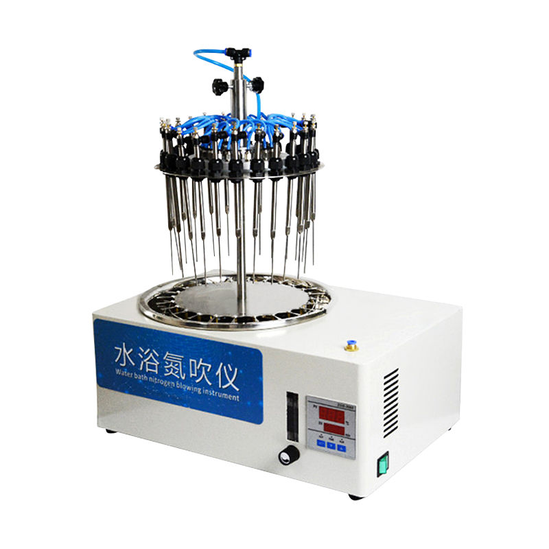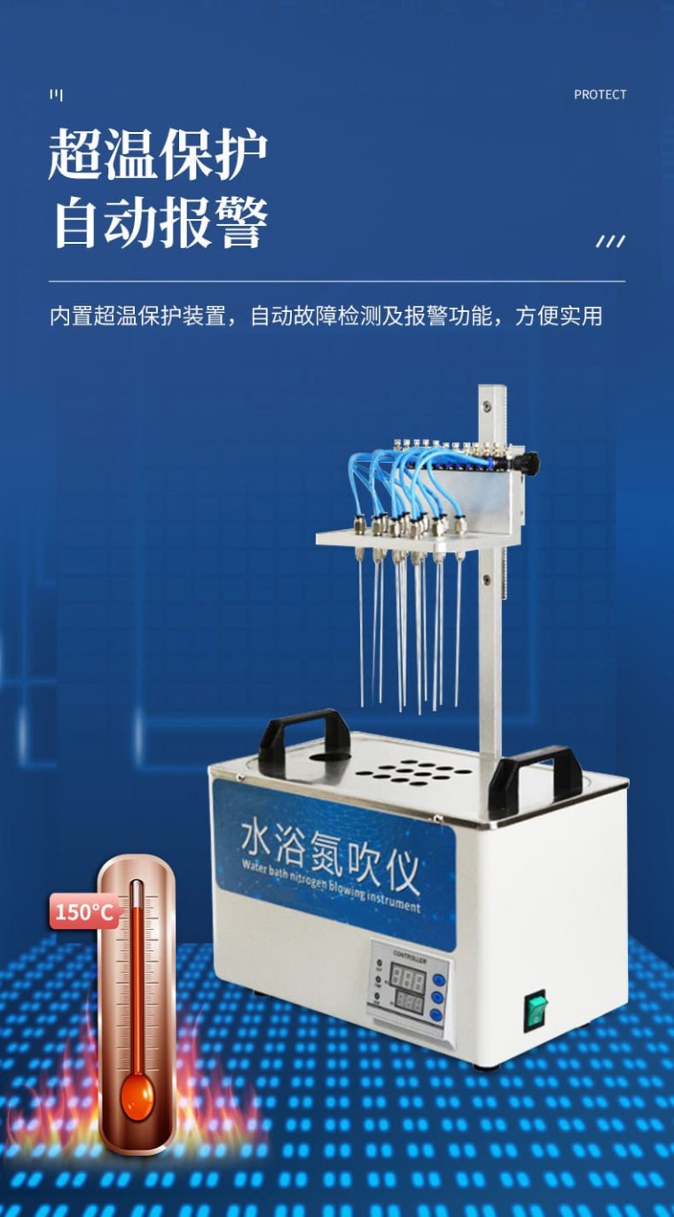 24位 圆形水浴氮气吹干仪 氮气吹扫装置360度旋转自由升降 产品说明: 圆形水浴氮气吹干仪利用吹扫捕集技术,同时可对样品进行控温加热,通过氮气等惰性气体快速、可控、连续地吹到样品表面来达到样品溶液快速无氧浓缩。该方法具有省时、便捷、准确的特点。广泛用于食品安全、医药、农药残留检测、临床药代等领域。 主要特征: 1、 圆形水浴氮气吹干仪适用于试管、锥形瓶、离心管等不同规格的容器。 2、样品位数:12位/24位,弹簧试管夹的样品架固定定位,每个样品都有数字编号。 3、试管通过带弹簧的试管夹和支撑盘来固定位置,可任意调节高度方向。 4、自由升降的针型阀管,根据试管大小和溶剂多少,各导气管可独立升降至合适的高度,同时可调的针型阀能管控制气体流量。 5、圆形结构,转动自如,方便样品支架进出水浴,操作方便。 6、智能数字温控器,可定时,双数字显示,调节采用PID技术并可实现超温报警及防干烧。 7、圆形氮吹仪的所有部件均匀不锈钢制造,可耐酸碱等有机溶剂。 8、调节阀:保证良好的气密性,经久耐用。 9、在浓缩有毒溶剂时,整个系统可置于通风柜中。 技术参数: