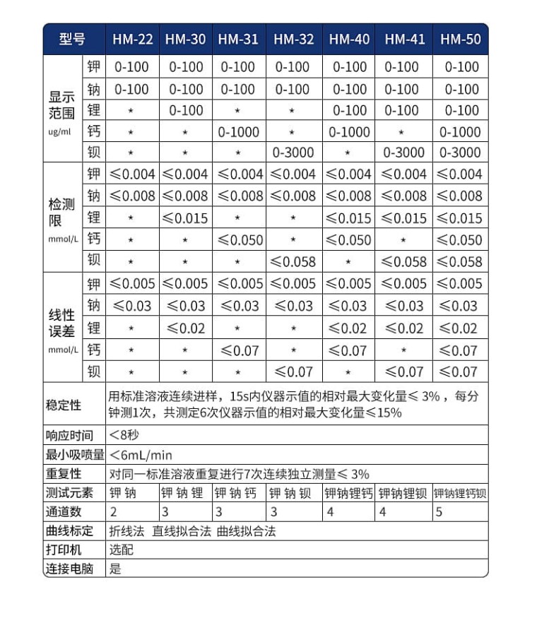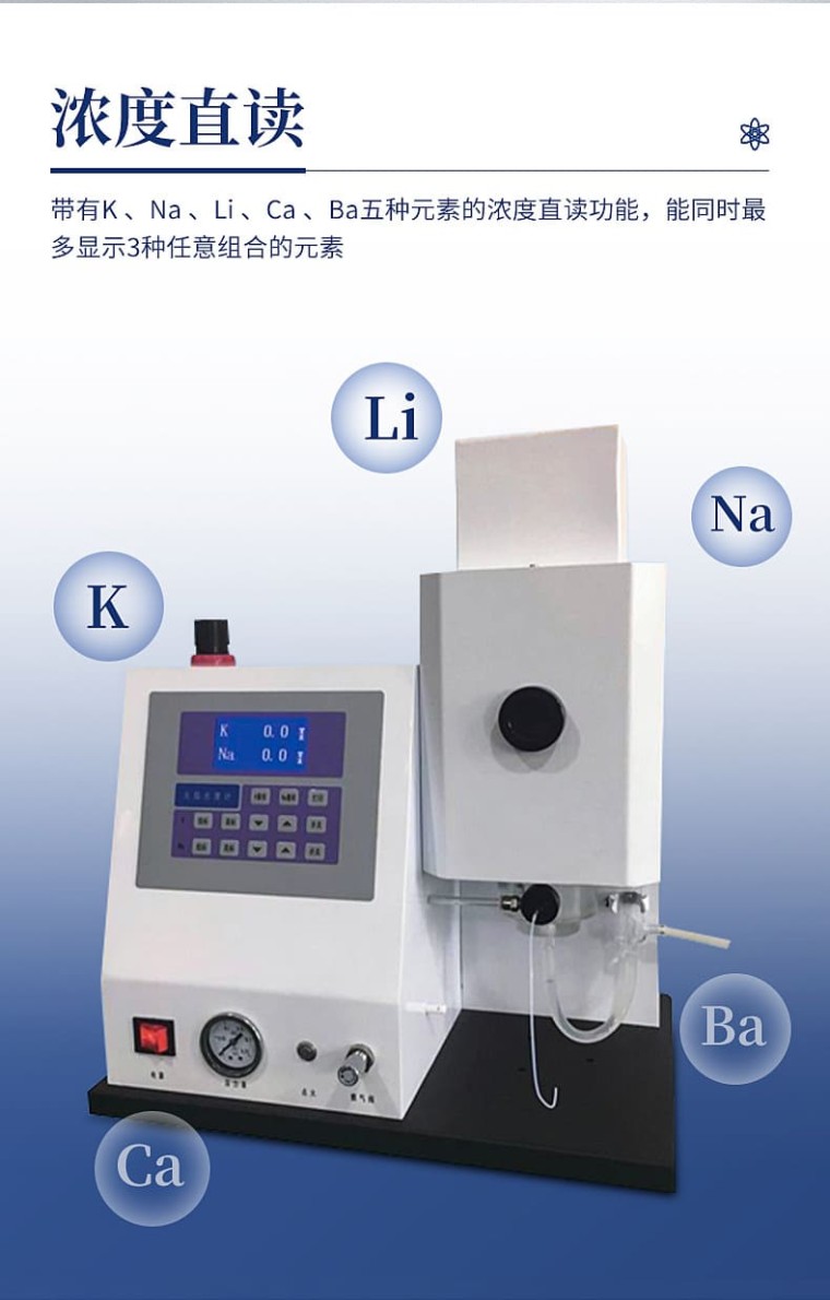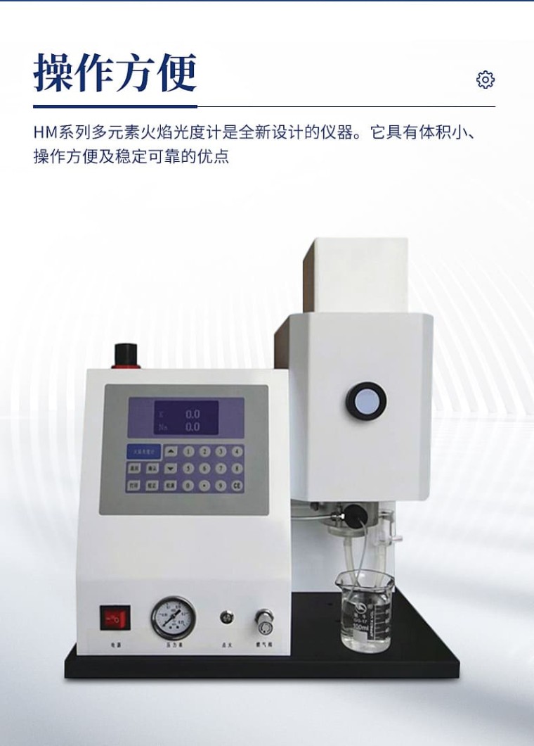产品简述: HM-20、HM-21是按照发射光谱的基本原理而设计制造的分析仪器,广泛应用于农业肥料、土壤、水泥、陶瓷等行业及硅酸工业的分析和测定;医疗卫生的病理研究。火焰光度计使用液化气为燃气。 产品特点: 1) K 、Na 同时显示; 2)采用轻触按键方便操作; 3)带有火焰大小预先选定功能; 4)带有熄火保护装置; 5)带有RS232接口,可连接打印机和电脑PC软件; 6)带有湿气分离器。 技术参数:
