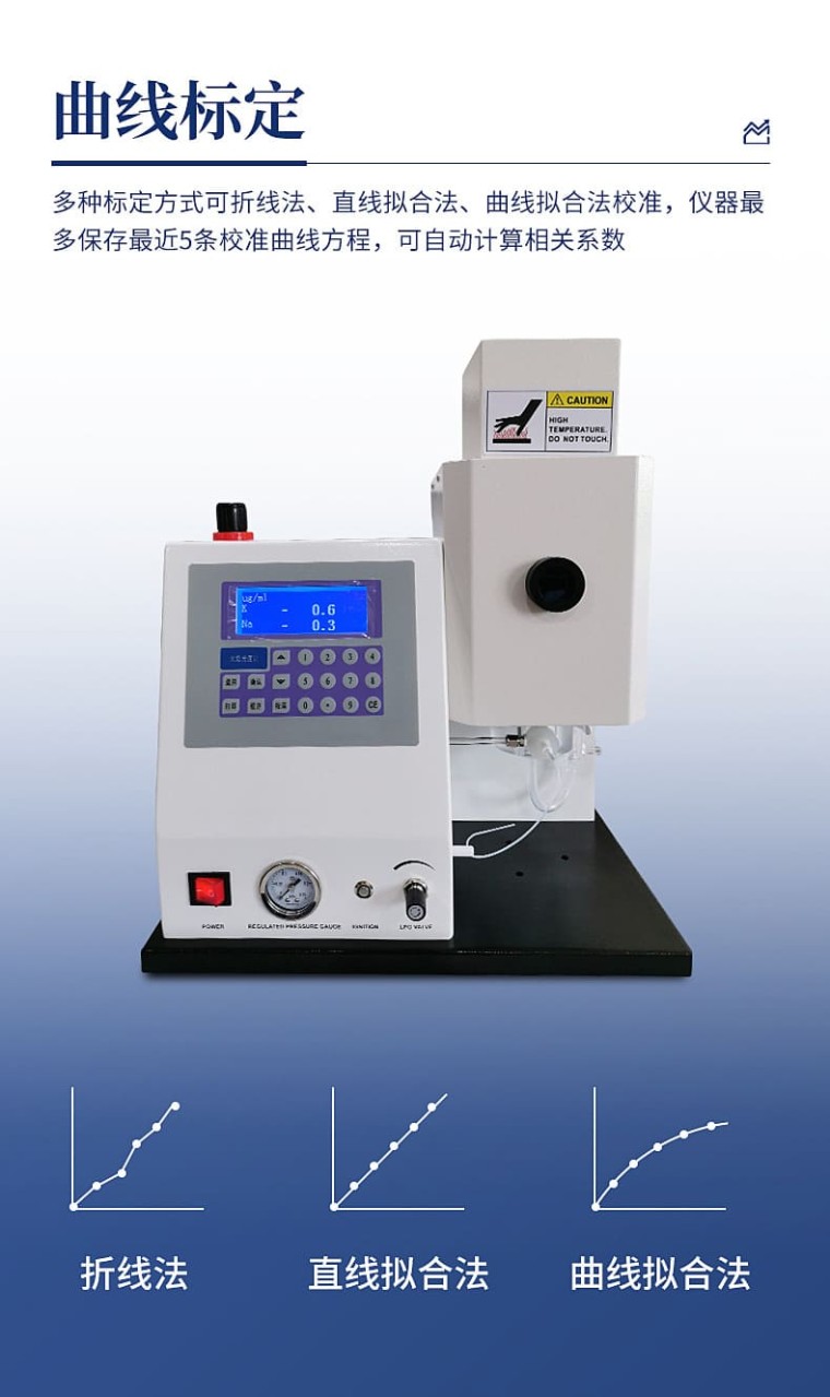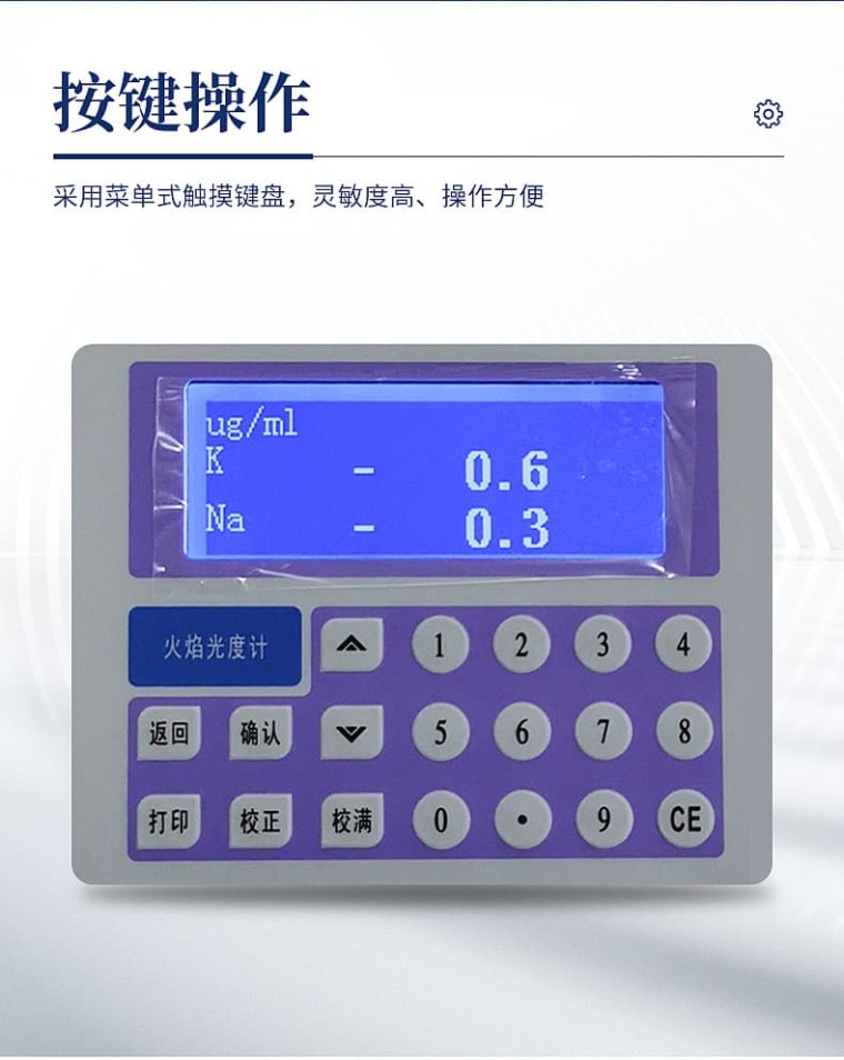 产品简述: HM-20、HM-21是按照发射光谱的基本原理而设计制造的分析仪器,广泛应用于农业肥料、土壤、水泥、陶瓷等行业及硅酸工业的分析和测定;医疗卫生的病理研究。火焰光度计使用液化气为燃气。 仪器特点: 1) K 、Na 同时显示; 2)采用轻触按键方便操作; 3)带有火焰大小预先选定功能; 4)带有熄火保护装置; 5)带有RS232接口,可连接打印机和电脑PC软件; 6)带有湿气分离器。 技术参数:
