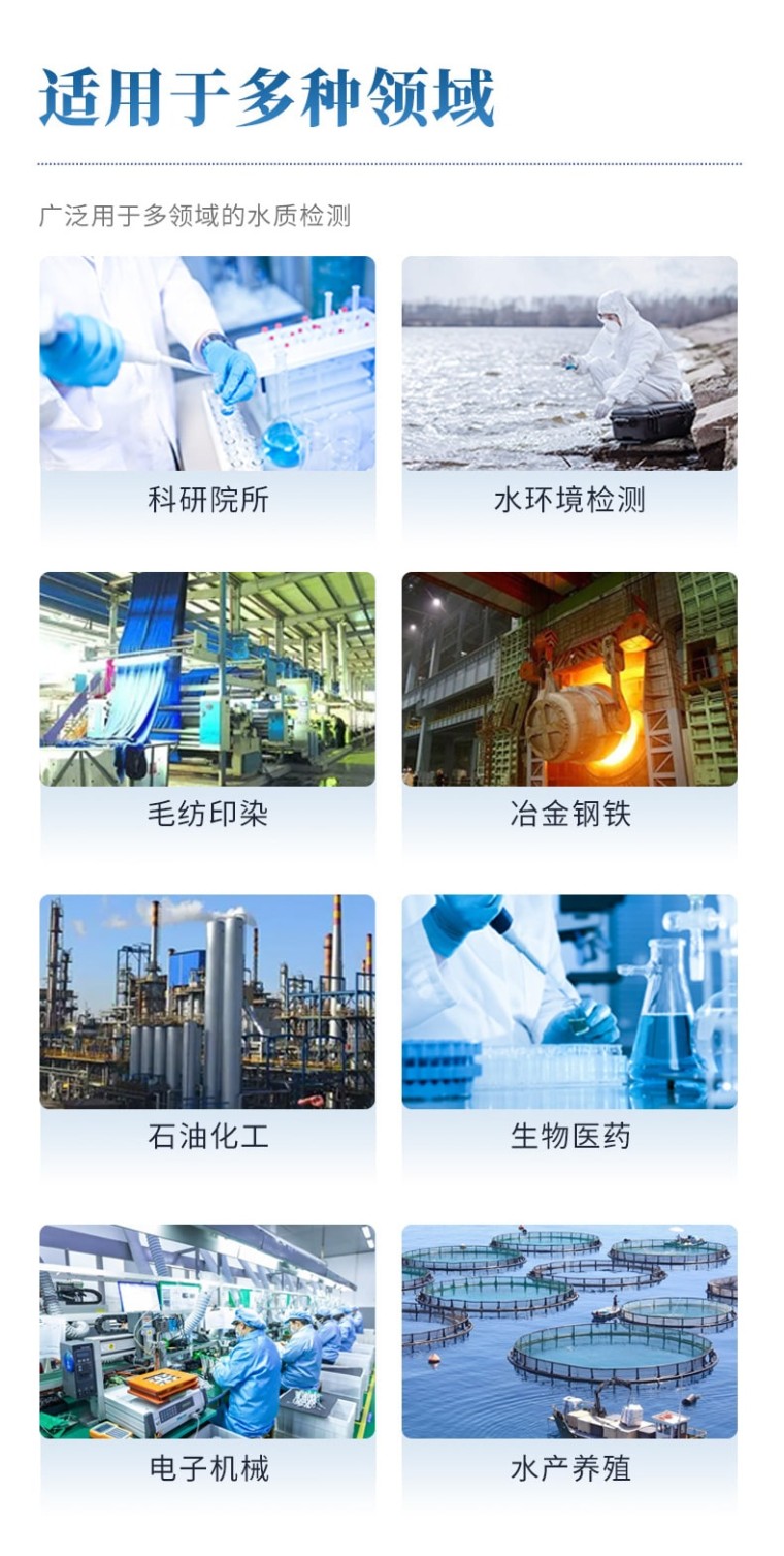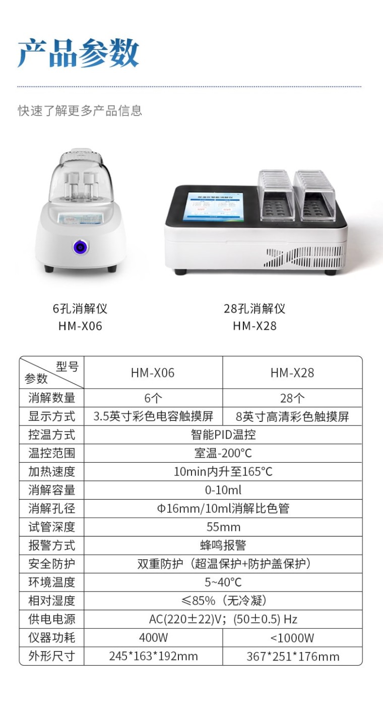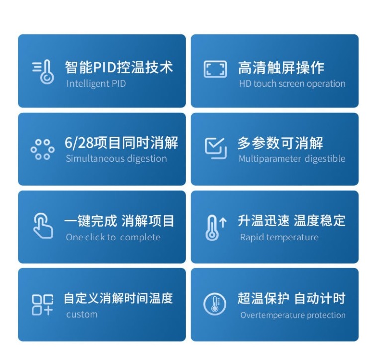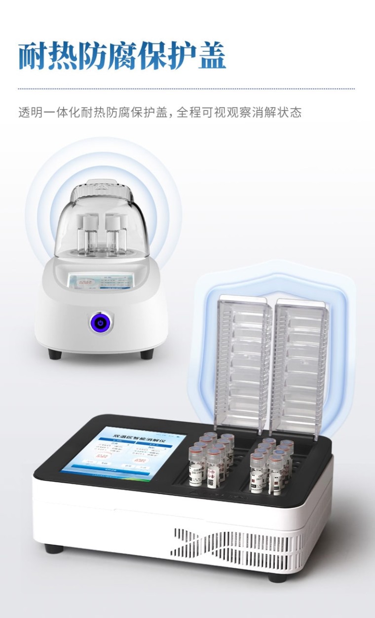 水质消解仪是一款依据环保行业标准《HJ/T399-2007》研发的新款多功能快速消解仪,搭载3.5寸电容触屏操作,智能安全,升温速度快,温度均匀稳定,可对多种检测参数如:COD、总磷、总氮等项目进行一键消解。 应用领域 水质消解仪可广泛应用于科研院所、污水工程、水环境检测、石油化工、冶金钢铁、生物医药、食品乳业、毛纺印染、电子机械、水产养殖、光伏、皮革、造纸等领域的水质检测。 功能特点 1、3.5英寸彩色液晶触摸显示屏,显示内容清晰直观; 2、具有透明且通风的防消解液飞溅的防护盖,直观消解状态,安全可靠; 3、具有恒温加热、超温保护、自动计时、蜂鸣提示等功能; 4、预存4种消解程序,一键消解,无需修改,直接使用; 5、当温度上升至设定消解温度后自动开始计时; 6、可自定义消解时间、消解温度; 技术指标 消解数量:6支; 加热速度:10min内升至165℃; 消解容量:0-10ml; 控温模式:智能PID控温; 温控精度:±0.5℃; 消解温度:室温-200℃; 时间设定:0-200min; 消解孔径:Φ16mm/10ml消解比色管; 试管深度:55mm; 屏幕显示:3.5英寸彩色电容触摸屏; 仪器功耗:400W; 特色功能:一键消解、超温保护、蜂鸣提示、自定义设置、倒计时功能; 外形尺寸:245X163X192mm(长×宽x高); 仪器重量:<2.5kg; 设备语言:中文/英文; 环境温度:5~40℃; 相对湿度:≤85%(无冷凝); 供电电源: AC(220±22)V;(50±0.5)Hz;