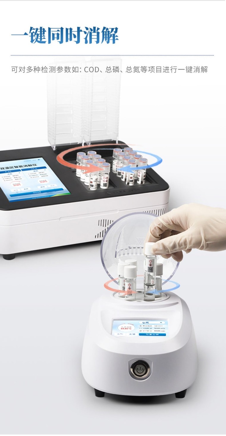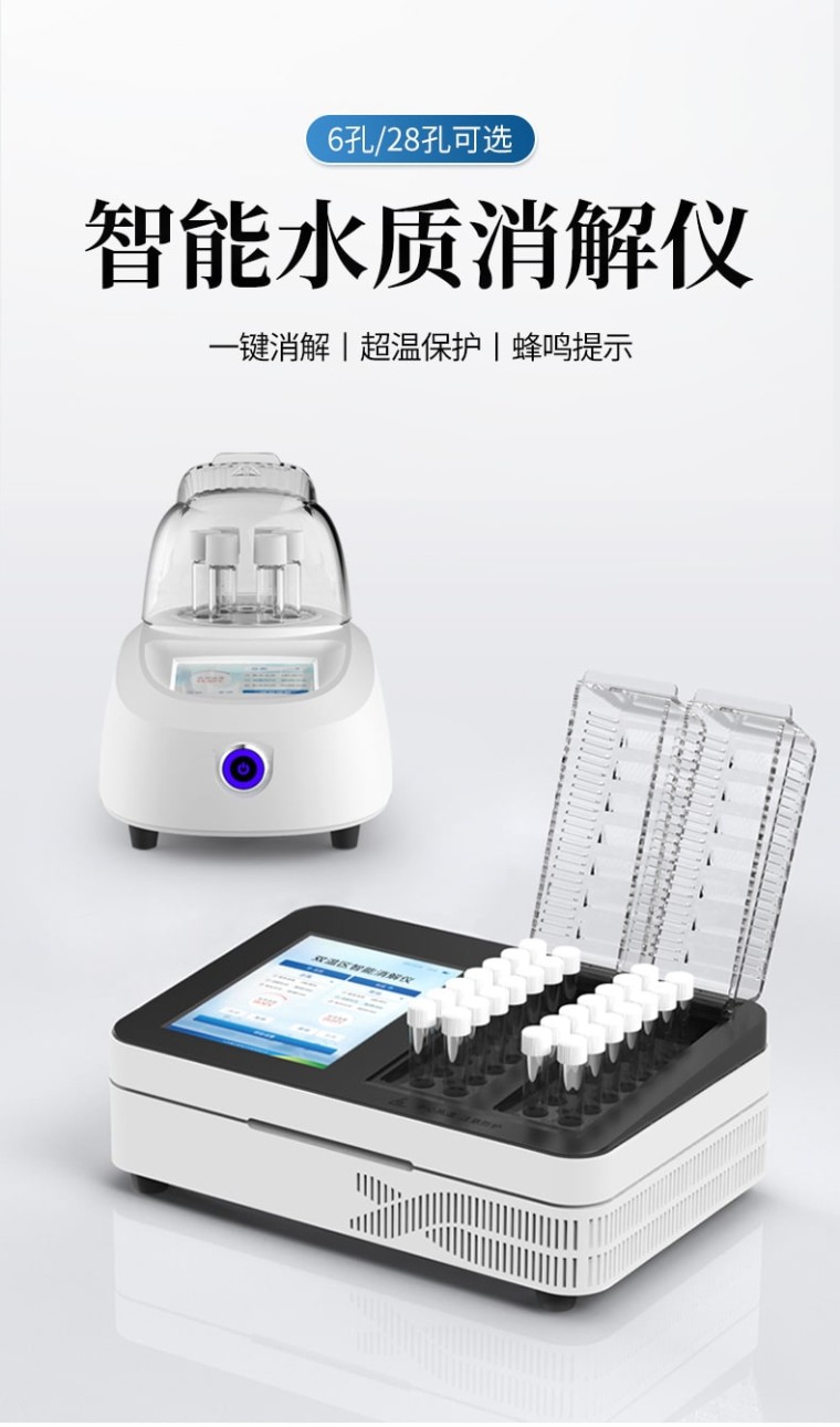 多功能水质消解仪是恒美电子独立自主研发的一款双温区控制消解系统,每个温区独立工作,互不干涉,采用智能PID精密算法具有升温速度快、控温准确、温度均匀等特点;适用于水质检测COD、总磷、总氮、总铬等项目的加热快速消解。 产品特点: 1、采用8英寸高清彩色触摸屏,操作平台符合人体工程学,菜单设计智能简洁; 2、具有2个独立加热温区,可同时或分别消解2种指标不同温度的水样; 3、采用智能PID 温度控制技术,加热均匀、升温速度快; 4、消解温度与时间可根据所需检测的样品需求进行设定,具有预设温度和保存功能; 5、具有延时保护、升温完成警报提示和仪器过热保护功能; 6、内置COD、总磷、总氮、5个自定义消解指标,可直接使用,实现一键启动消解; 7、透明一体化耐热防腐保护盖,全程可视观察消解状态; 8、实时显示当前温度、最高温度、消解时间、剩余时间等信息; 技术参数: 仪器型号:HM-X28型; 显示方式:8英寸高清彩色触摸屏; 消解数量:28个(双温区/每个温区14个样品,独立加热); 控温方式:智能PID温控; 温控范围:室温-200℃可调; 加热速度:10min内升至165℃; 消解容量:0-10ml; 消解孔径:Φ16mm/10ml消解比色管; 试管深度:55mm; 控温精度:±0.5℃; 温控时间:0-999分钟(自行设置); 预设消解模式:COD、氨氮、总磷; 自定义模式:5条; 恒温提示:支持; 消解完成提示:支持; 报警方式:蜂鸣报警; 安全防护:双重防护(超温保护+防护盖保护); 仪器功耗:<1000W; 环境温度:(5~40)℃; 相对湿度:≤85%(无冷凝); 外形尺寸:(367*251*176)mm(长*宽*高); 仪器重量:<5.7kg; 供电电源: AC(220±22)V,(50±0.5)Hz;