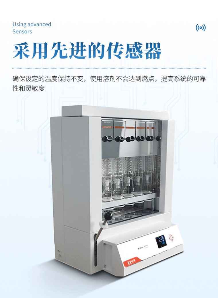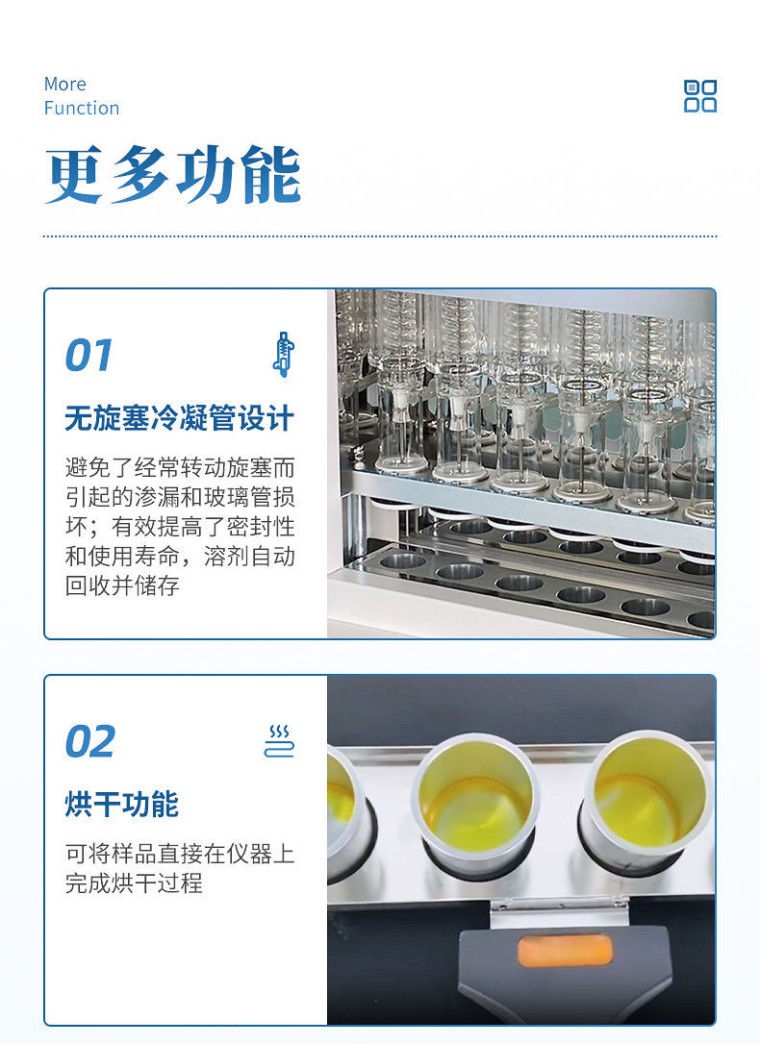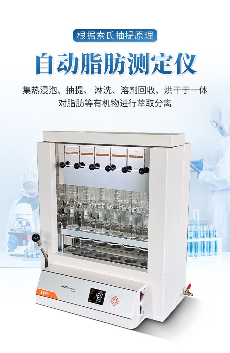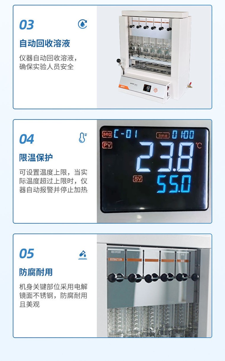 全自动脂肪测定仪(索氏提取仪)是根据索氏抽提原理,集热浸泡、抽提、 淋洗、溶剂回收、烘干于一体,对脂肪等有机物进行萃取分离的仪器。仪器采用了自 动控温、全封闭井式电加热形式,使仪器加温更为均匀,安全可靠,并具有良好的密 封设施,从而达到快速准确的目的;最大限度降低溶剂用量,自动回收溶剂,节省分 析成本。具有设计合理、操作简单、精确度高、性能稳定、重现性 好、省力、省时等优点。 产品特点: 1、三档位操作:能保证各阶段的准确性,确保检测结果无误 2.★2.5寸彩色液晶显示;同时显示设定温度与实际温度;保温时间倒计时显示,到 时报警; 3.★自动6阶段升温:可设置连续6个阶段的温度和保温时间,仪器将自动按顺序完成, 操作简单方便; 4、深井式加热模块:采用全封闭井式电加热,样品受热均匀,温度在室温~200℃任意调节,控温稳定; 5.★采用先进的传感器,确保设定的温度保持不变,使用溶剂不会达到燃点,提高系 统的可靠性和灵敏度; 6.★无旋塞冷凝管设计:避免了经常转动旋塞而引起的渗漏和玻璃管损坏;有效提高 了密封性和使用寿命,溶剂自动回收并储存; 7、限温保护:可设置温度上限,当实际温度超过上限时,仪器自动报警并停止加热; 8.★烘干功能:可将样品直接在仪器上完成烘干过程; 9、自动回收溶液:仪器自动回收溶液,确保实验人员安全 10、机身关键部位采用电解镜面不锈钢,防腐耐用且美观; 技术参数: 样品量: 0.5g~15g(具体取决于样品类型) 控温范围:室温~200℃(任意调节) 检测范围:0.1-100% 溶剂回收方式:自动回收并储存 溶剂回收率:≥85% 重现性: 相对标准偏差±1% (5-100%脂肪) 加热方式:井式电加热 密封方式:聚四氟乙烯密封 显示方式:2.5寸液晶彩屏;保温时间显示倒计时 每批处理量:6个样品 程序控温:可设置6阶段,程序自动运行 控温精度:±0.2℃ 功率: 500W 电源: 220(V)±10%,50~60HZ 外形尺寸:560×370×685(mm) 重量:32kg