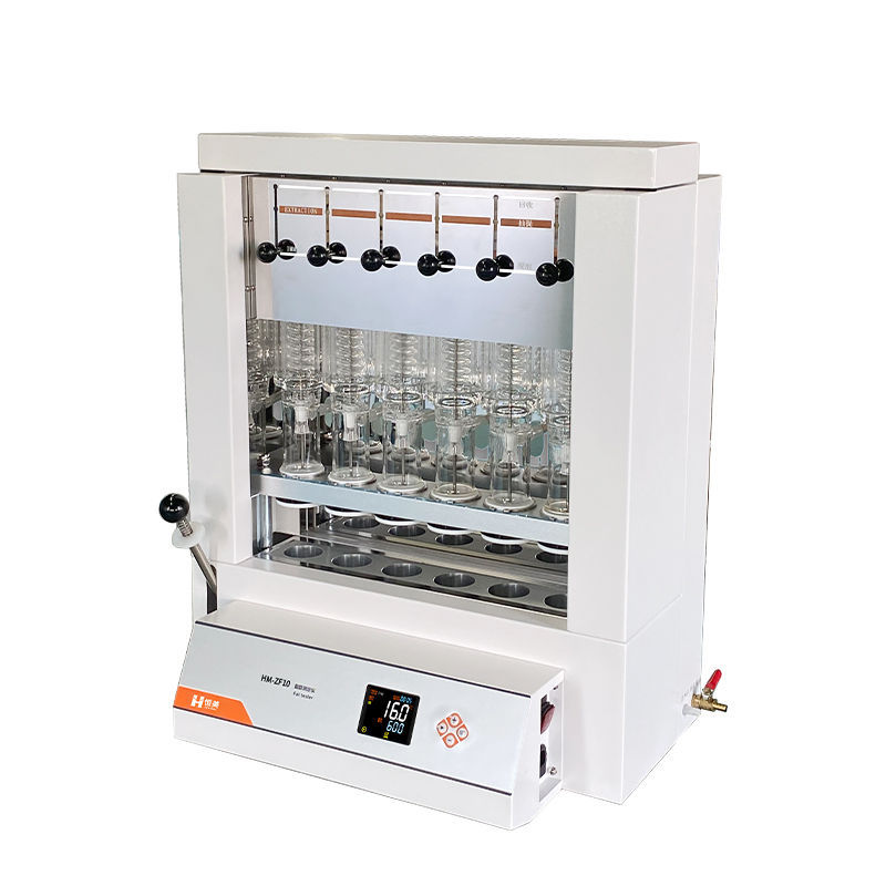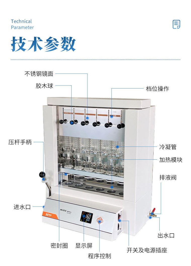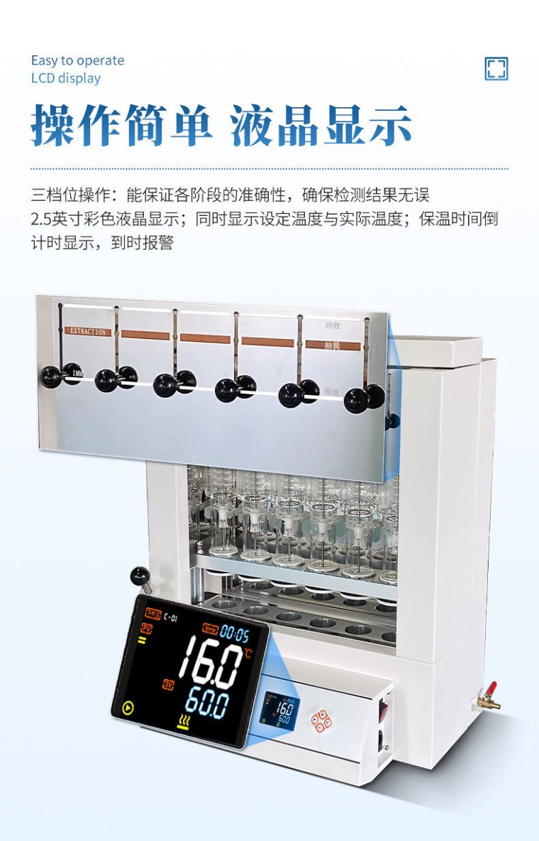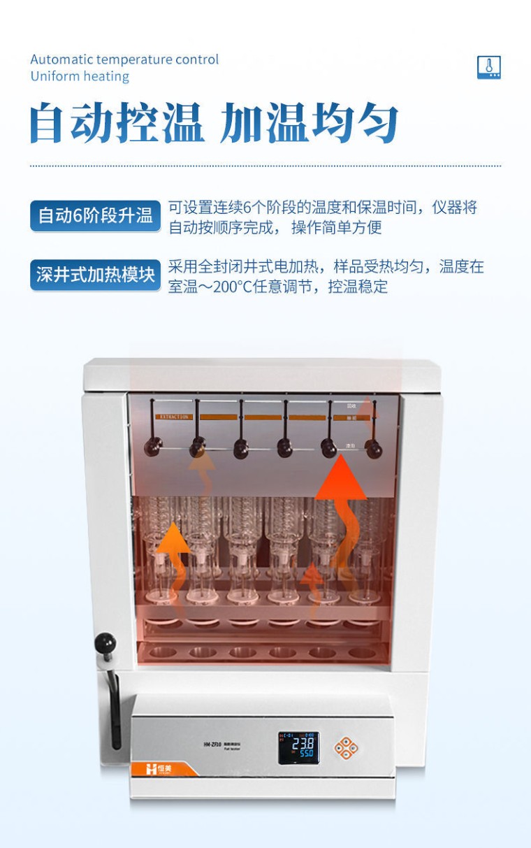 全自动脂肪测定仪(索氏提取仪)是根据索氏抽提原理,集热浸泡、抽提、 淋洗、溶剂回收、烘干于一体,对脂肪等有机物进行萃取分离的仪器。仪器采用了自 动控温、全封闭井式电加热形式,使仪器加温更为均匀,安全可靠,并具有良好的密 封设施,从而达到快速准确的目的;最大限度降低溶剂用量,自动回收溶剂,节省分 析成本。具有设计合理、操作简单、精确度高、性能稳定、重现性 好、省力、省时等优点。 产品特点: 1、三档位操作:能保证各阶段的准确性,确保检测结果无误 2.★2.5寸彩色液晶显示;同时显示设定温度与实际温度;保温时间倒计时显示,到 时报警; 3.★自动6阶段升温:可设置连续6个阶段的温度和保温时间,仪器将自动按顺序完成, 操作简单方便; 4、深井式加热模块:采用全封闭井式电加热,样品受热均匀,温度在室温~200℃任意调节,控温稳定; 5.★采用先进的传感器,确保设定的温度保持不变,使用溶剂不会达到燃点,提高系 统的可靠性和灵敏度; 6.★无旋塞冷凝管设计:避免了经常转动旋塞而引起的渗漏和玻璃管损坏;有效提高 了密封性和使用寿命,溶剂自动回收并储存; 7、限温保护:可设置温度上限,当实际温度超过上限时,仪器自动报警并停止加热; 8.★烘干功能:可将样品直接在仪器上完成烘干过程; 9、自动回收溶液:仪器自动回收溶液,确保实验人员安全 10、机身关键部位采用电解镜面不锈钢,防腐耐用且美观; 技术参数: 样品量: 0.5g~15g(具体取决于样品类型) 控温范围:室温~200℃(任意调节) 检测范围:0.1-100% 溶剂回收方式:自动回收并储存 溶剂回收率:≥85% 重现性: 相对标准偏差±1% (5-100%脂肪) 加热方式:井式电加热 密封方式:聚四氟乙烯密封 显示方式:2.5寸液晶彩屏;保温时间显示倒计时 每批处理量:6个样品 程序控温:可设置6阶段,程序自动运行 控温精度:±0.2℃ 功率: 500W 电源: 220(V)±10%,50~60HZ 外形尺寸:560×370×685(mm) 重量:32kg