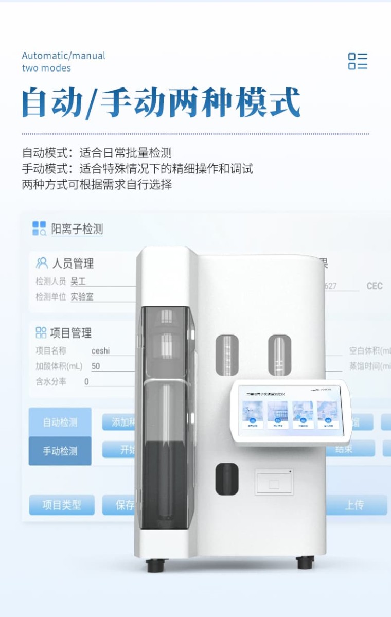 土壤阳离子交换量测定仪是一种专门用于测量土壤阳离子交换量(CEC:土壤胶体能够吸附各种阳离子的总量)的专业设备。利用电化学原理来工作,通过向土壤样品施加一定条件下的溶液,并测量土壤颗粒表面吸收的阳离子与溶液中的阳离子进行交换的能力。 设备原理: 依据《森林土壤阳离子交换量的测定》(LYT 1243-1999)。用1mol/L的乙酸铵溶液反复处理土壤,使土壤成为铵离子饱和土,过量的乙酸铵用95%乙醇洗去,然后加氧化镁,用定氮蒸馏的方法进行蒸馏。蒸馏出的氨用硼酸溶液吸收,以标准酸液滴定,根据铵离子的量计算土壤阳离子交换量。 优势特点: 1、7寸触摸屏,Android10系统。 2、具有wifi联网功能,检测结果可直接上传监管平台。 3、高容量16G存储容量,检测结果存储500万条。 4、检测结果为Excel表格,直接拷贝到U盘。 检测结果可批量打印,批量上传。 5、高速热敏打印机,检测完成自动打印检测报告。 6、程序控制冷凝水开启关闭,节约用水量。 7、冷凝水流速监测,低流速报警。 8、蒸发器水位,温度,压力等多重防护。 9、采用强耐腐蚀器件。 10、自动排废,清洗。 仪器参数 : (1) 测量范围:0.1~240.0mg氮 (2) 样品重量:固体≤8.0g,液体≤30.0ml (3)冷凝水消耗:1.5L/min (4) 回 收 率:99% ~101% (5) 功 率:≤1500W (6) 温 度:10-35℃ (7) 湿 度:相对湿度不大于85% (8) 电 压:220V 50HZ (9)裸机重量:16.9KG (10)外形尺寸:435mm×355mm×720mm(长×宽×高)