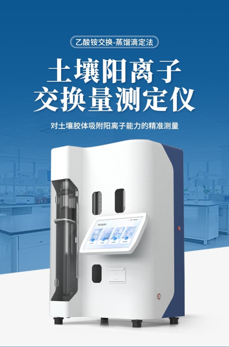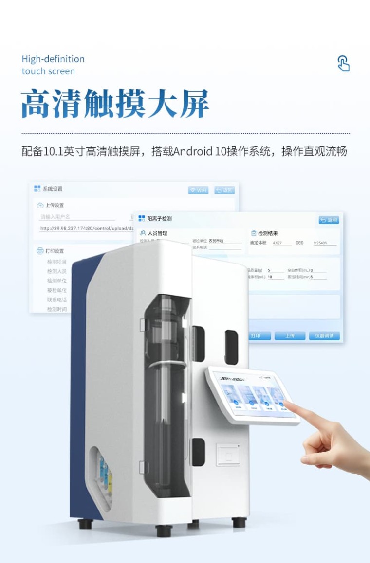 土壤阳离子交换量测定仪是一种专门用于测量土壤阳离子交换量(CEC:土壤胶体能够吸附各种阳离子的总量)的专业设备。利用电化学原理来工作,通过向土壤样品施加一定条件下的溶液,并测量土壤颗粒表面吸收的阳离子与溶液中的阳离子进行交换的能力。 设备原理: 依据《森林土壤阳离子交换量的测定》(LYT 1243-1999)。用1mol/L的乙酸铵溶液反复处理土壤,使土壤成为铵离子饱和土,过量的乙酸铵用95%乙醇洗去,然后加氧化镁,用定氮蒸馏的方法进行蒸馏。蒸馏出的氨用硼酸溶液吸收,以标准酸液滴定,根据铵离子的量计算土壤阳离子交换量。 设备特点: 1、10.1寸触摸屏,Android10系统。 2、具有wifi联网功能,检测结果可直接上传监管平台。 3、高容量16G存储容量,检测结果存储500万条。 4、检测结果为Excel表格,直接拷贝到U盘。 检测结果可批量打印,批量上传。 5、高速热敏打印机,检测完成自动打印检测报告。 6、程序控制冷凝水开启关闭,节约用水量。 7、冷凝水流速监测,低流速报警。 8、蒸发器水位,温度,压力等多重防护。 9、采用强耐腐蚀器件。 10、自动排废,清洗。 设备参数: 1、测量范围:0.1~240.0mg氮 2、样品重量:固体≤8.0g,液体≤30.0ml 3、滴定精度:≤0.001μL/步、最小滴定体积:0.5uL/步 4、滴定方式:动态滴定 (边蒸馏边滴定,比静态滴定节约时间30%-50%) 5、准确度:示值误差≤1% 6、重 复 性:相对标准偏差≤0.5% 7、测定速度:3~10min/样品(消解好的样品液) 8、功 率:≤1500W 9、重量:19Kg 10、尺寸:405×465×690(mm) 11、环境温度:10-35℃ 12、环境湿度:相对湿度不大于85% 13、工作电压:220V 50HZ