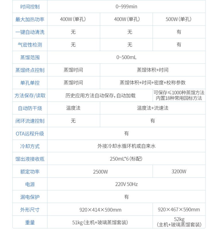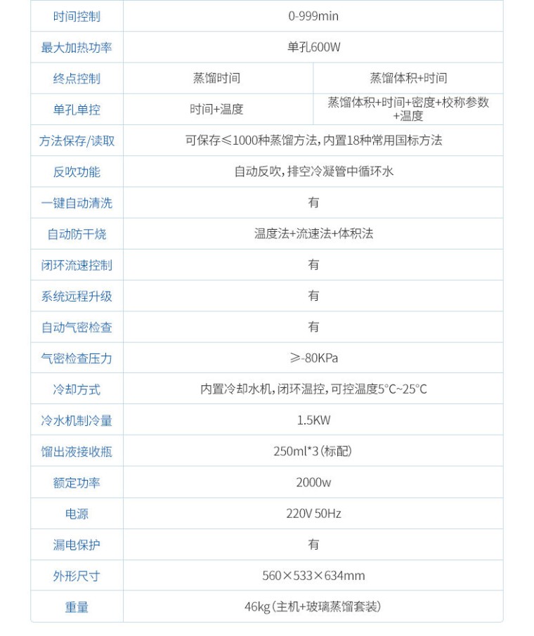 一、产品简介: 全自动一体化蒸馏仪是一款专为现代实验室设计的智能、高效的高科技产品,旨在通过高度自动化和智能化的操作,显著提升实验效率与数据准确性。该蒸馏仪集成了先进的冷却水循环技术、独立多通道控制、以及7寸液晶触摸屏控制、自动清洗、自动气密检查、反吹、远程OTA系统升级等多项创新特性,为用户提供了一站式的蒸馏解决方案。 二、产品特点: 1、自动化程度高:内置冷却水循环机,实现全自动化操作,提高实验效率与准确性。 2、多通道独立控制:3个加热单元各自独立,配备防倒吸、防过量蒸馏及防干烧保护。 3、智能触控:7寸液晶触摸屏,支持自定义保存最多1000种蒸馏方法,内置18种国标方法。 4、精准控制:采用高效陶瓷远红外加热,具备时间与重量双重终点控制,确保蒸馏精度达0.1ml。 5、安全可靠:集成自动清洗、自动气密检查、反吹等功能,确保设备长期稳定运行。 6、操作简便:一键启动,支持远程OTA系统升级,满足不同用户的使用需求。 三、技术参数: