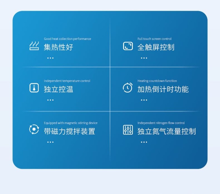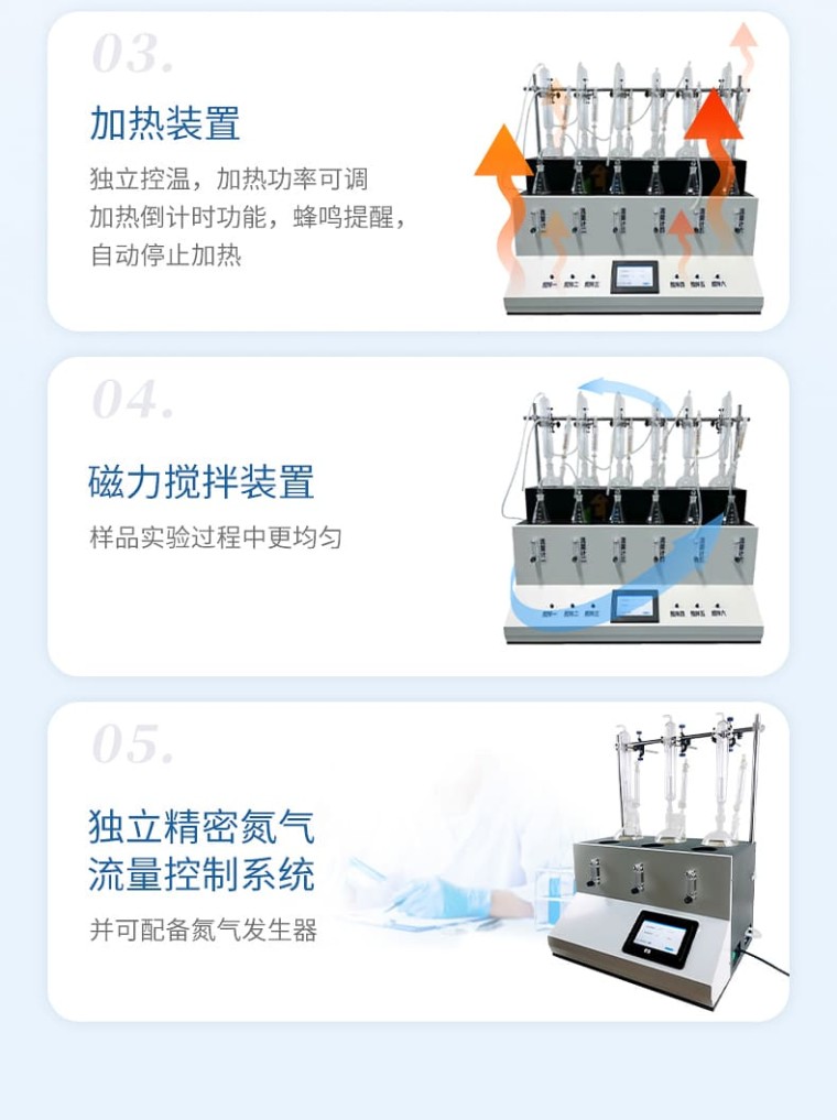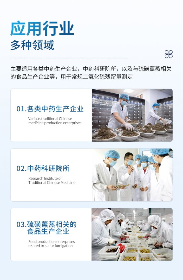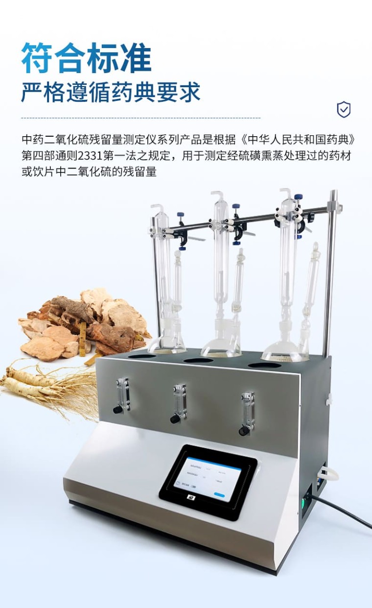 介绍: 主要原理是根据药典中所提供的检测方法,将中药材以蒸馏法进行处理,样品中的亚硫酸盐系列物质加酸处理后转化为二氧化硫后,随氮气流带入到含有双氧水的吸收瓶中,双氧水将其氧化为硫酸根离子,采用酸碱滴定法测定,计算药材及饮片中的二氧化硫残留量。本产品在严格遵循药典要求的基础上,整合加热,蒸馏,水循环及氮吹等功能为一体,可同时提供3-5个样品(空白样,平行样)的处理,从而极大的提高了检测数据的精度和减少了工作时间。 符合标准: 二氧化硫蒸馏仪系列产品是根据《中华人民共和国药典》第四部通则2331**法之规定,用于测定经硫磺熏蒸处理过的药材或饮片中二氧化硫的残留量 产品用途: 该仪器主要适用各类中药生产企业,中药科研院所,以及与硫磺薰蒸相关的食品生产企业等,用于常规二氧化硫残留量测定。 产品原理: 二氧化硫蒸馏仪主要由加热模块,蒸馏模块,冷却循环水模块以及氮吹模块组成。加热模块设置了高,中,低三档加热速率控制功能,可实现加热效率的精确控制面板;蒸馏模块选用高硼硅材料,耐热性好,坚固耐用;冷却水循环系统可选用外置冷却水循环机(内置可选),确保冷却效果。氮吹模块可外接氮气发生器或氮气钢瓶,并配有高精度气体流量计,严格控制氮吹速率 产品主要特点: 选用密封红外陶瓷加热套,集热性好,加热效率高,并可防止液体洒漏引起的设备损坏问题。 全触屏控制,人机交互界面,操作简单易控。 加热装置独立控温,加热功率可调。 加热倒计时功能,蜂鸣提醒,自动停止加热。 带磁力搅拌装置,样品实验过程中更均匀。 配置独立精密氮气流量控制系统。并可配备氮气发生器。