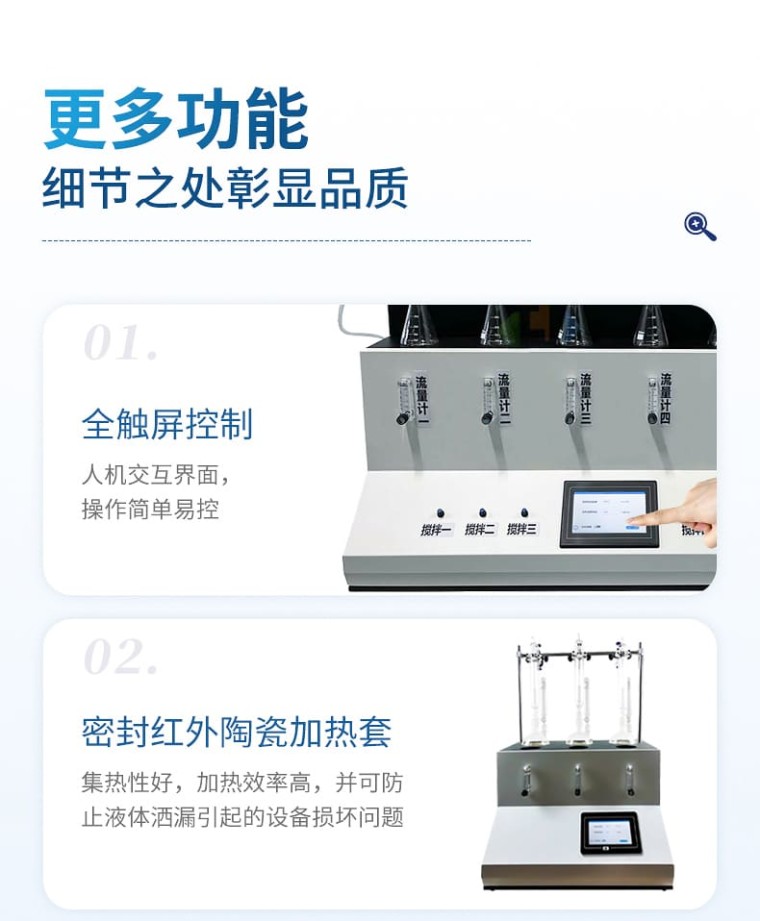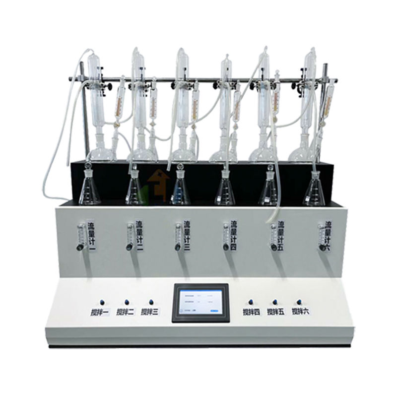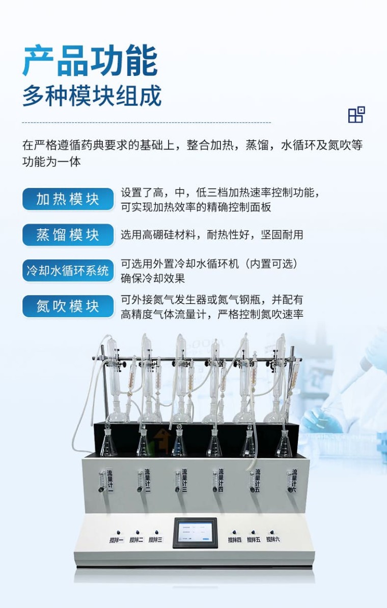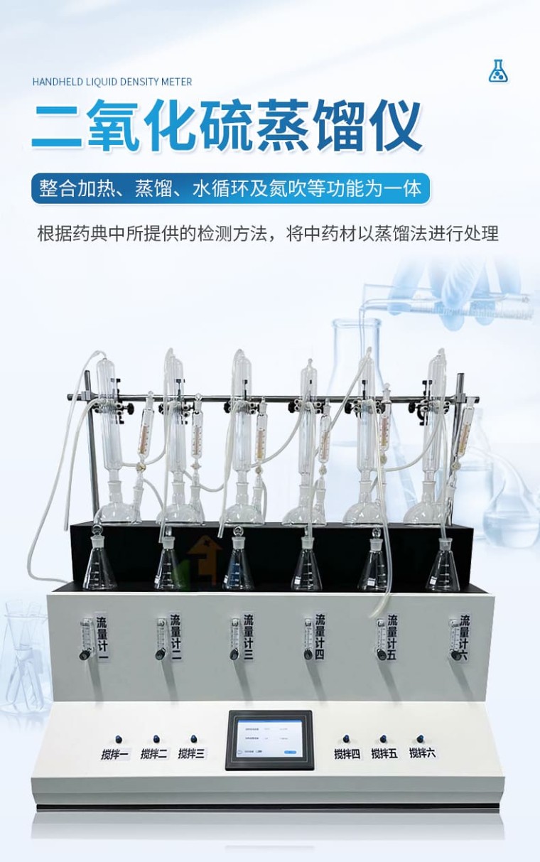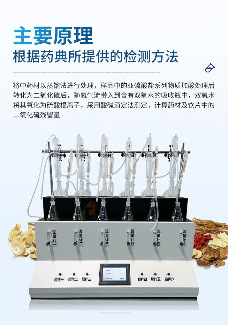 主要原理是根据药典中所提供的检测方法,将中药材以蒸馏法进行处理,样品中的亚硫酸盐系列物质加酸处理后转化为二氧化硫后,随氮气流带入到含有双氧水的吸收瓶中,双氧水将其氧化为硫酸根离子,采用酸碱滴定法测定,计算药材及饮片中的二氧化硫残留量。本产品在严格遵循药典要求的基础上,整合加热,蒸馏,水循环及氮吹等功能为一体,可同时提供3-6个样品(空白样,平行样)的处理,从而极大的提高了检测数据的精度和减少了工作时间。 符合标准: 中药二氧化硫残留量测定仪系列产品是根据《中华人民共和国药典》第四部通则2331**法之规定,用于测定经硫磺熏蒸处理过的药材或饮片中二氧化硫的残留量 产品用途: 该仪器主要适用各类中药生产企业,中药科研院所,以及与硫磺薰蒸相关的食品生产企业等,用于常规二氧化硫残留量测定。 工作原理: 二氧化硫蒸馏仪主要由加热模块,蒸馏模块,氮吹模块组成。加热模块设置了高,中,低三档加热速率控制功能,可实现加热效率的精确控制面板;蒸馏模块选用高硼硅材料,耐热性好,坚固耐用;。氮吹模块可外接氮气发生器或氮气钢瓶,并配有高精度气体流量计,严格控制氮吹速率 主要特点: 选用密封红外陶瓷加热套,集热性好,加热效率高,并可防止液体洒漏引起的设备损坏问题。 全触屏控制,人机交互界面,操作简单易控。 加热装置独立控温,加热功率可调。 加热倒计时功能,蜂鸣提醒,自动停止加热。 带磁力搅拌装置,样品实验过程中更均匀。 配置独立精密氮气流量控制系统。并可配备氮气发生器。 技术参数: