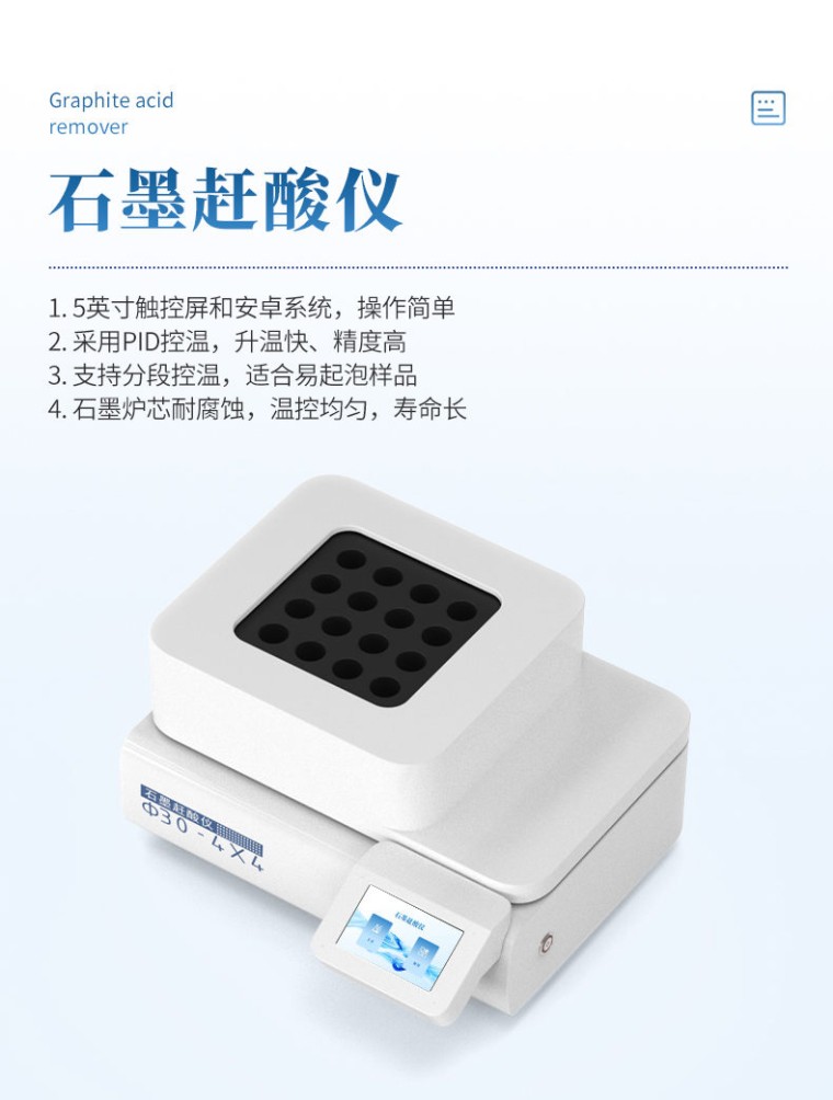 微波消解仪是一种用于样品前处理的设备,通过微波加热技术对样品进行快速、有效的消解。该仪器广泛应用于食品、环境保护、疾病控制、质量监督、商品检验、科研院所等领域,特别适用于各种样品的酸消解和溶剂萃取。 配相同孔位赶酸仪,孔径与消解内罐一致,无需转液方便易用。 工作原理 微波消解仪通过微波电磁波的直接加热作用,使样品在高温高压下快速分解。其加热原理主要通过分子化和离子导电效应实现: 分子化效应:极性分子在微波电场中高速碰撞和摩擦,形成高热。 离子导电效应:溶液中的离子在微波电场下定向流动,产生高速摩擦和碰撞,将微波能转化为热能。 微波消解技术的优势包括样品分解快速、完全,挥发性元素损失小,试剂消耗少,操作简单,处理效率高,污染小,空白低等特点,被誉为“绿色化学反应技术”。 技术参数: 温度控制系统:非接触式红外控温,实时检测控制并显示微波消解反应罐内的温度和曲线。 温度控制范围:0~300℃,控温精度±0.5℃。 控温能力:软件自动控温。 压力保护:超压自动泄放。 外观尺寸:507*619.5*666mm (长*宽*高) 裸机重量:50kg 反应罐参数: 高温度:300℃,高压力1500psi。 内罐材质:聚四氟材料。 防爆外套管材质:PEEK宇航材料。 内罐反应容积:55ml。 高压消解罐批处理量:≥12个样品/批。 工作方式:360°同向连续旋转,确保各个样品微波环境相同,提高实验结果的一致性。 配件: 序号 名称 单位 数量 1. 消解仪 台 1 2. 赶酸仪 台 1 3. 内罐 个 12 4. 外罐 个 12 5. 转子 套 1 6. 说明书 份 1 7. 合格证 份 1