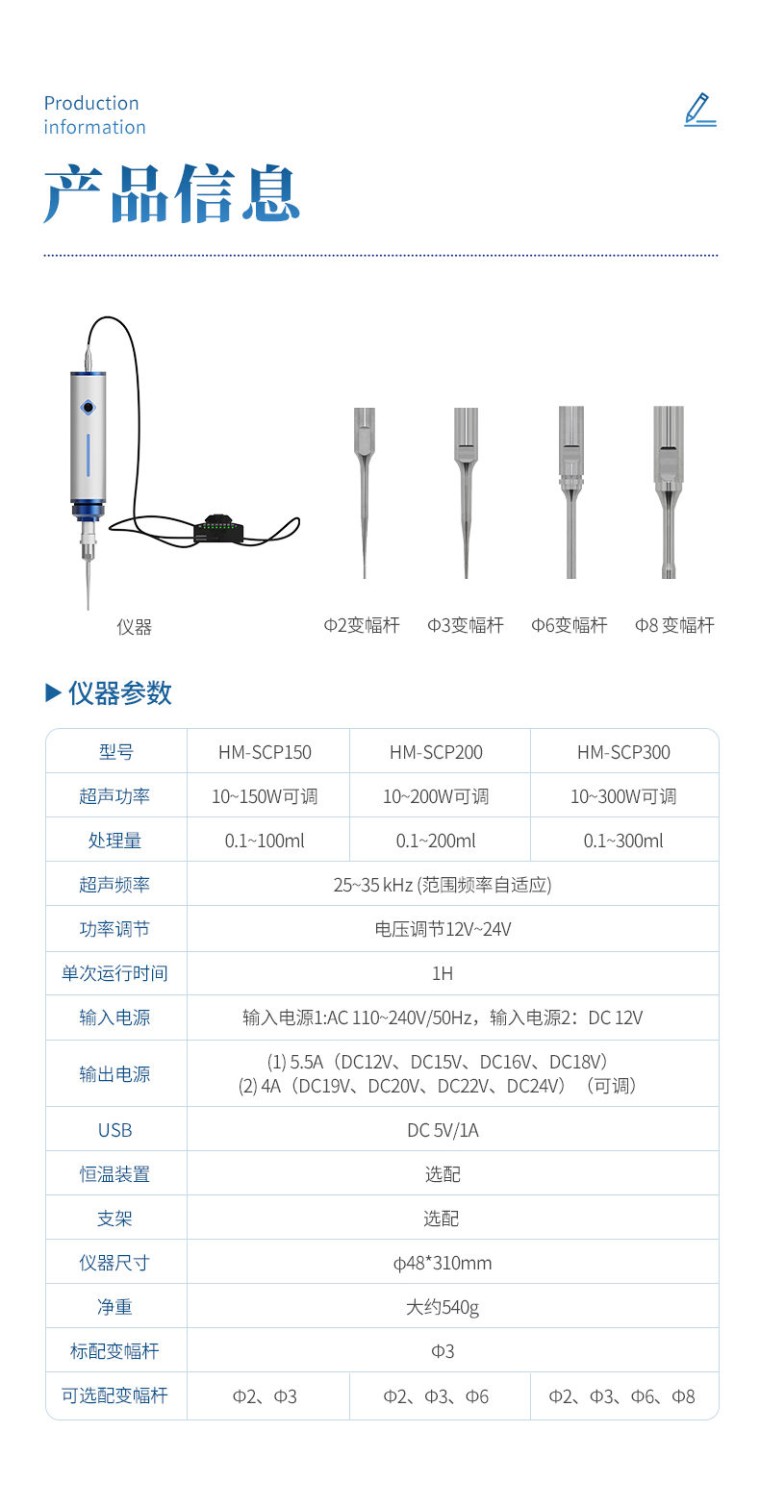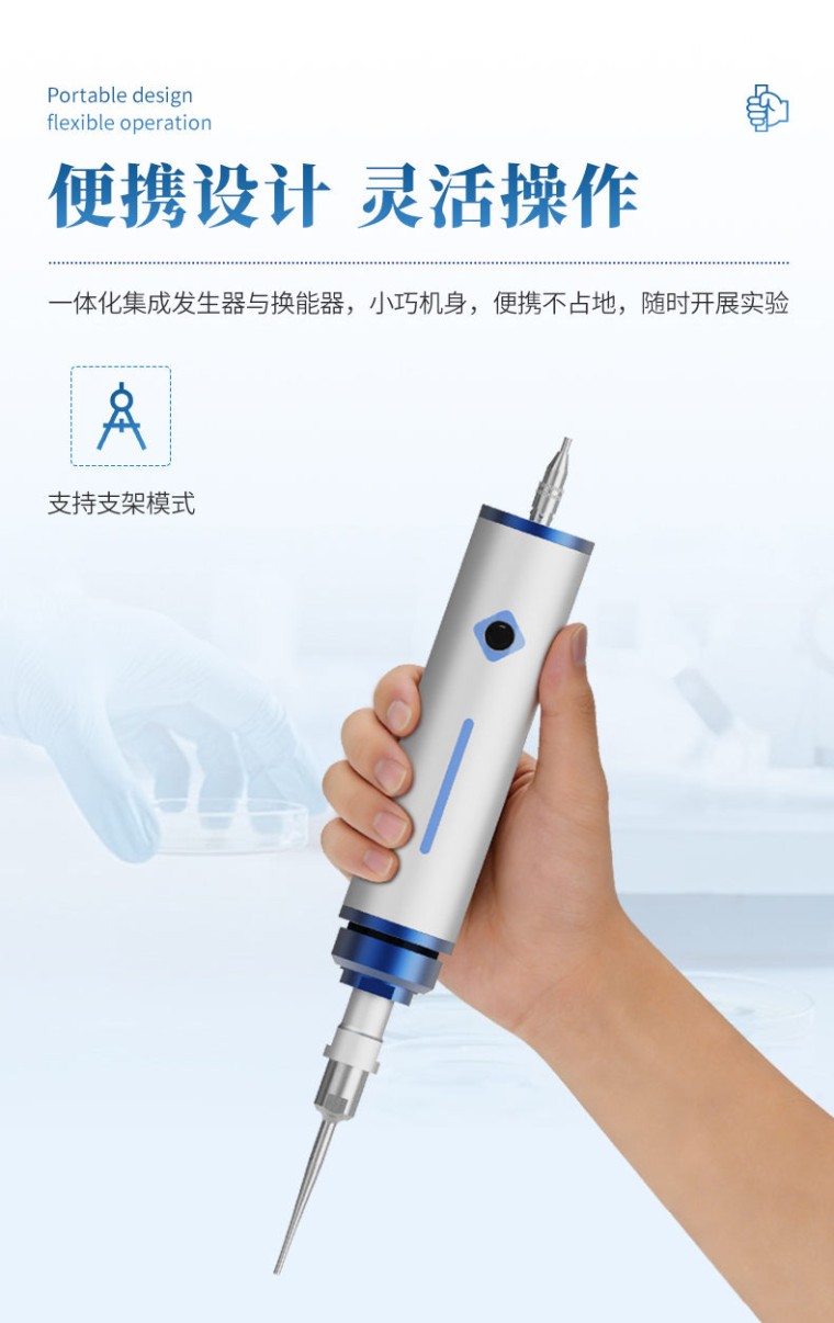 一、产品介绍: 手持超声波破碎仪是一种便携式、高精度的超声波处理设备,适用于实验室小规模样品破碎、乳化、分散和提取等操作。其一体化设计集成了超声波发生器和换能器,操作灵活,可手持使用或搭配支架固定,适用于生物、化学、材料等领域的高效样品处理。 超声波细胞破碎仪是一种利用强超声在液体中产生空化效应,对物质进行超声处理的多功能、多用途的仪器,能用于动植物组织、细胞、细菌、芽胞菌种的破碎,同时可用来乳化、分离、分散、匀化、提取、脱气、清洗及加速化学反应等等。 二、用途: 超声波破碎仪能用于粉碎动、植物细胞、细菌、牙孢或组织。分散稀土和各类无机矿物粉。 超声波破碎仪是加速化学、生物学、物理学的反应速度和加速液体脱气的理想装置。 超声波破碎仪能配制近乎微米的百分之一大小的乳胶体;匀化“难混溶”的混合液;聚合一些物质,析出另一些物质。 总之,超声波粉碎机能实现提取、粉碎、乳化、匀化、悬浮液、变异、气悬体、加速脱溶、晶化及在电子显微镜下配制各种生物样本之多种功能。 三、产品特点: 1、便携设计:结构简单,携带方便。 2、智能频率跟踪:自动谐振点与频率跟踪,负载稳定。 3、功率控制:电压调节方式,精准可靠。 4、保护机制:过载保护、短路保护 5、航空级镁铝合金换能器 6、变幅杆:TC4**钛合金,耐腐蚀、耐热。 7、操作方式:点动、连续(实现间隙或连续运行)。 四、产品参数: 1、超声频率:25~35 kHz (范围频率自适应) 2、超声功率:10~200 W (可调) 3、处理量:0.1~200ml 4、功率调节:电压调节12V~24V 5、单次运行时间:1H 6、输入电源1:AC 110~240V/50Hz 7、输入电源2:DC 12V 8、输出电源: (1) 5.5A(DC12V、DC15V、DC16V、DC18V) (2) 4A(DC19V、DC20V、DC22V、DC24V)(可调) 9.USB:DC 5V/1A 10、支架:选配 11、标配变幅杆:Φ3 12、可选配变幅杆:Φ2、Φ3、Φ6 13、恒温装置:选配 14、仪器尺寸:φ48*310mm 15、净重:大约540g