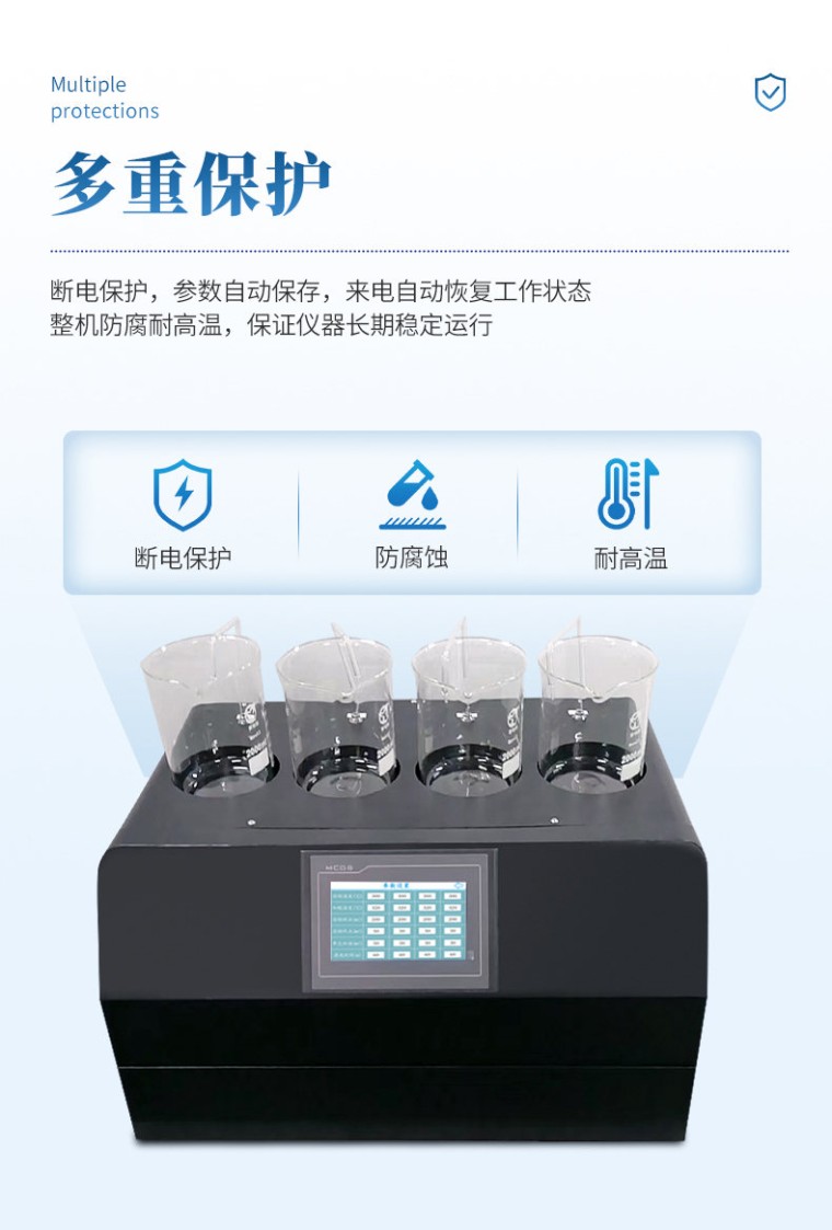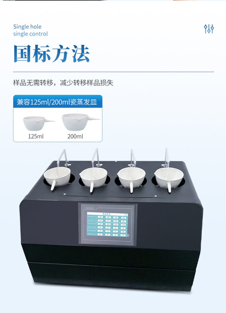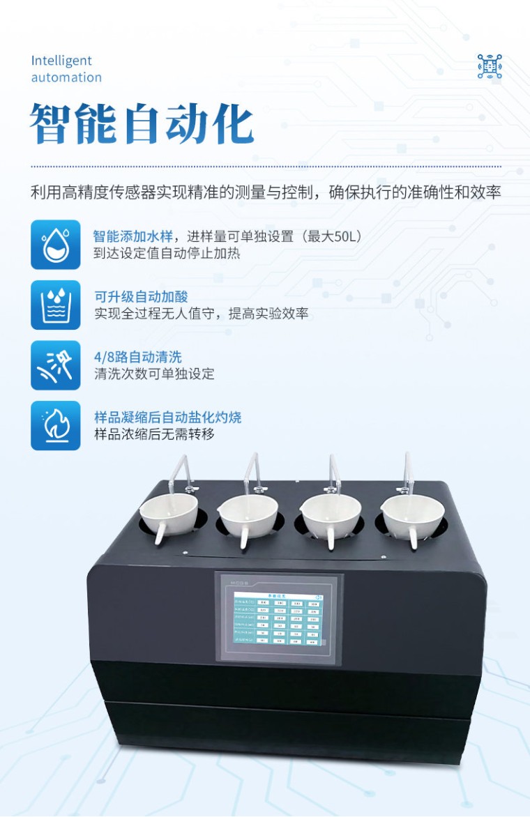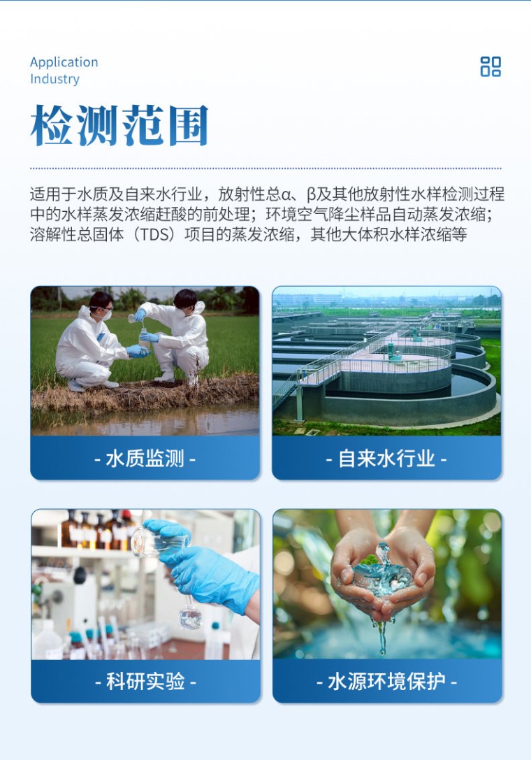 仪器用途 适用于水质及自来水行业,放射性总α、β及其他放射性水样检测过程中的水样蒸发浓缩赶酸的前处理;环境空气降尘样品自动蒸发浓缩;溶解性总固体(TDS)项目的蒸发浓缩,其他大体积水样浓缩等。 仪器特点 1、 智能微电脑七寸彩色电容触摸屏,界面友好,实验过程各通道参数实时监测。 2、 国标方法,样品无需转移,减少转移样品损失。 3、 八通道独立运行,一键启动,自动浓缩定量。 4、 单孔单控,进口远红外辐射加热,PID温度控制。 5、 单路设置温度:室温-350℃ 。 6、 兼容125ml/200ml瓷蒸发皿。 7、 高精度传感器定量,智能添加水样,进样量可单独设置(最大50L),到达设定值自动停止加热。 8、 浓缩体积单孔单孔,蒸发浓缩量0-200ml。 9、 样品凝缩后自动盐化灼烧,样品浓缩后无需转移。 10、 可升级自动加酸,实现全过程无人值守,提高实验效率。 11、 自动清洗,四路自动清洗。清洗次数可单独设定。 12、 断电保护,参数自动保存,来电自动恢复工作状态。 13、 整机防腐耐高温,保证仪器长期稳定运行。 适用标准 ISO 9696:2007水质 不含盐的水中 总α活度的测量 厚源法 ISO 9697:2008水质 不含盐的水中 总β活度的测量 厚源法 EJ/T 1075-1998 水中总α放射性活度的测定 厚源法 EJ/T 900-1994 水中总β放射性的测定 蒸发法 DZ/T 0064.76-1993 地下水质检验方法 放射性化学法测定总α和β HJ 898-2017 《水质 总α放射性的测定 厚源法》 HJ 899-2017 《水质 总β放射性的测定 厚源法》 GB 8537-2008 《饮用天然矿泉水检验方法》 GB/T 15265-94《环境空气 降尘的测定 重量法》 GB/T 5750.13-2006 《生活饮用水标准检验方法 放射性指标》 GB/T 5750.4-2006 8.1 水质 溶解性总固体的测定 生活饮用水标准检验方法 工作条件 供电电源: AC 220V,50Hz 环境温度: 10-35℃ 环境湿度: <60% 产品规格 样品通道: 四路自动进样 主机尺寸: 600mm*485mm340mm 温度范围: 0-350℃ 额定功率: 2200W