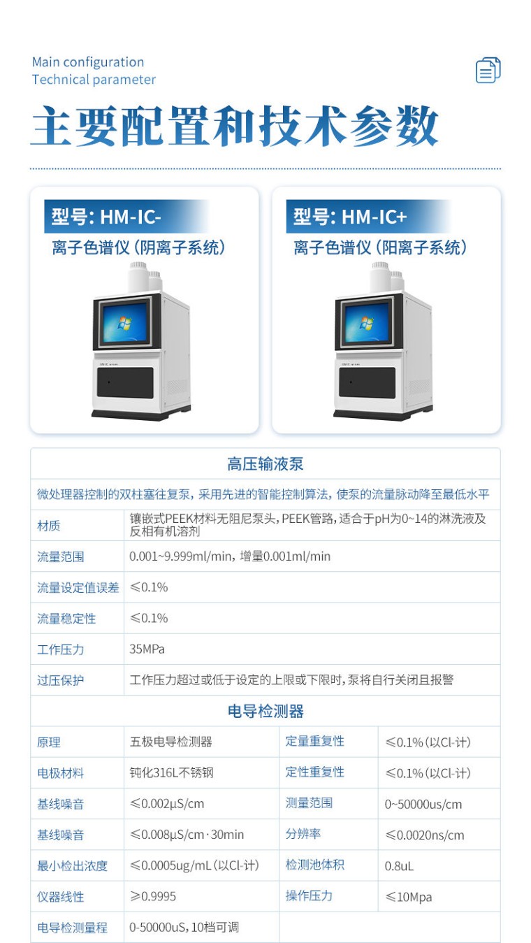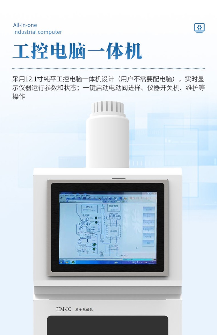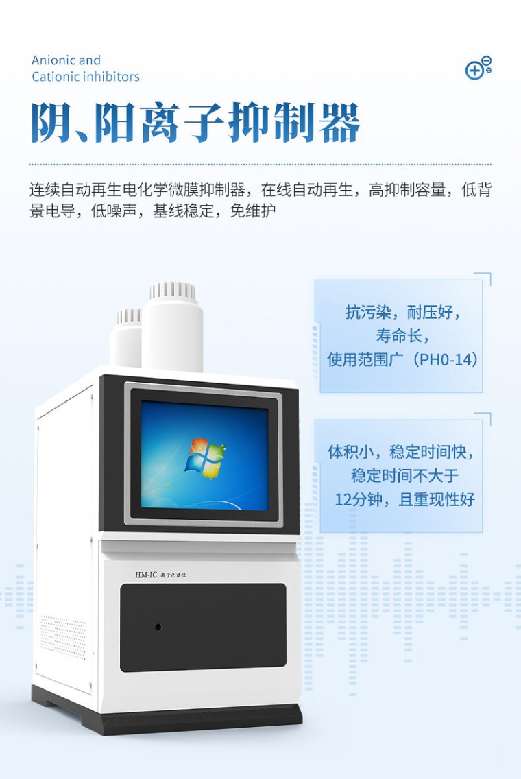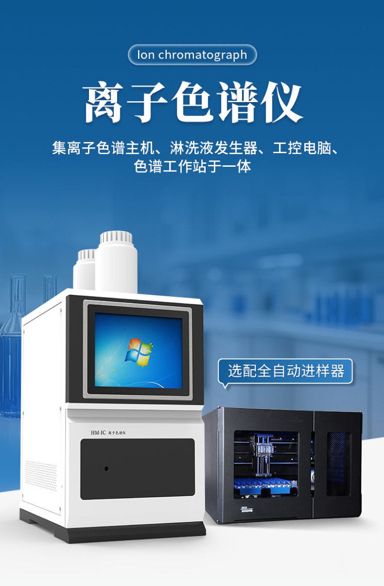 我们公司作为离子色谱仪器市场的新业态,一直致力于为用户提供更快捷、优质的仪器,以保障实验室的建设和运行。始终坚持以客户为中心,为有检测需求的客户服务。物美价廉、响应迅捷、服务全面。 全新一代HM-IC-离子色谱仪,采用12.1吋纯平工控电脑一体机设计(用户不需要配电脑),实时显示仪器运行参数和状态;一键启动电动阀进样,一键完成仪器开关机、维护等操作,一键调阅仪器操作教程,方便快捷。 HM-IC-离子色谱仪核心零部件自主研发、自主知识产权可控。采用一体化设计,集离子色谱主机、淋洗液发生器、工控电脑、色谱工作站于一体,结构紧凑,流路最短,对流路造成的峰型扩展有很好的改善。一体化恒温箱:色谱柱、抑制器、电导池、放大电路都处于同一恒温系统,改善了电导检测器的温飘和基线噪声。内置多处漏液报警器和缺水报警器,全方位安全监控。由PLC控制的各个部件统一到电脑显示屏的集中软件控制系统,操作方便,鼠标所见即所控。 主要配置和技术参数: 1 高压输液泵: 微处理器控制的双柱塞往复泵,采用先进的智能控制算法,能使泵的流量脉动降至最低水平。 1.1,材质:镶嵌式PEEK材料无阻尼泵头,PEEK管路,适合于pH为0~14的淋洗液及反相有机溶剂。 1.2,流量范围:0.001~9.999ml/min,增量0.001ml/min。 1.3,流量设定值误差:≤0.1% 1.4,流量稳定性:≤0.1% 1.5,工作压力:35MPa 1.6,过压保护:工作压力超过或低于设定的上限或下限时,泵将自行关闭且报警。 2 电导检测器: 2.1,原理:五极电导检测器 2.2,电极材料:钝化316L不锈钢 2.3,基线噪音:≤0.002μS/cm 2.4,基线漂移:≤0.008μS/cm·30min 2.5,zui小检出浓度:≤0.0005ug/mL(以Cl-计) 2.6,仪器线性:≥0.9995 2.7,定量重复性:≤0.1%(以Cl-计) 2.8,定性重复性:≤0.1%(以Cl-计) 2.9,测量范围:0~50000us/cm 2.10,分辨率:≤0.0020ns/cm 2.11,检测池体积:0.8uL 2.12,操作压力:≤10Mpa。 2.13,电导检测量程: 0-50000uS,10档可调。 3、 阴、阳离子抑制器: 3.1连续自动再生电化学微膜抑制器,在线自动再生,高抑制容量,低背景电导,低噪声,基线稳定,免维护。 3.2抗污染,耐压好,寿命长,使用范围广(PH0-14)。 3.3体积小,稳定时间快,稳定时间不大于12分钟,且重现性好。 4 流路系统: 4.1流路系统使用PEEK材料制造,通用性好,能使用强酸、强碱的淋洗液。 4.2****的有机溶剂兼容,方便用户对复杂样品进行分析、冲洗和维护。 4.3 结构紧凑,流路最短,对流路造成的峰型扩展有很好的改善。 4.4 内置多处漏液报警器和缺水报警器,全方位安全监控。 5 内置色谱工作站: 5.1 24位高精度高灵敏度数模转换。 5.2专用离子色谱工作站,全中文显示,通过USB方式与电脑进行数字信号传输,完成色谱数据采集及处理。 5.3自动接收分析和控制保存仪器色谱条件。 5.4自动识别负峰、基线扣除功能。自动积分参数、自动生成报告。 6 色谱柱、抑制器、电导池、放大电路一体恒温系统: 将电导池、流路系统、分离柱、抑制器、放大电路恒温在同一个控温基体上置于柱箱内,恒温精度5~65℃±0.01℃。并且仪器柱箱采用绝热结构,可保持检测系统、流路及柱子、抑制器、电导池、放大电路的温度恒定,获得高质量的分离效果和检测精度,改善了电导检测器的温飘和基线噪声。 7内置淋洗液发生器,仅用高纯水,无需人工配制任何化学试剂,在线产生等度或梯度高纯淋洗液,减少基线漂移,提高稳定性,简化工作流程。 8 在线自动脱气系统: 1,脱气效率:在25℃入口流动相的含氧量为8PPM时,出口流动相的含氧量为2PPM (流速:1.5mlmin) 2,真空压力:-0.018MPa 3,流量:5mL/min 9 分离能力:(分别配置不同的阴、阳离子分离柱,可以分离的离子种类:) 配置国产阴离子分离柱:一次进样分析:氟化物、氯化物、亚硝酸盐、磷酸盐、溴化物、硝酸盐、硫酸盐 配置进口阴离子分离柱:一次进样分析:氟化物、溴酸盐、氯化物、亚硝酸盐、磷酸盐、溴化物、硝酸盐、硫酸盐、亚氯酸盐、高氯酸盐、二氯乙酸、三氯乙酸等 配置进口阳离子分离柱:一次进样分析::Li+、Na+、NH4+、K+、Ca2+、Mg2+、Sr2+、Ba2+等 分国家/行业检测标准: