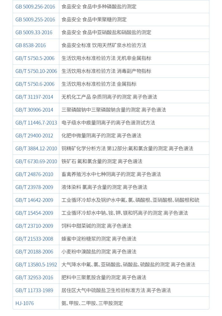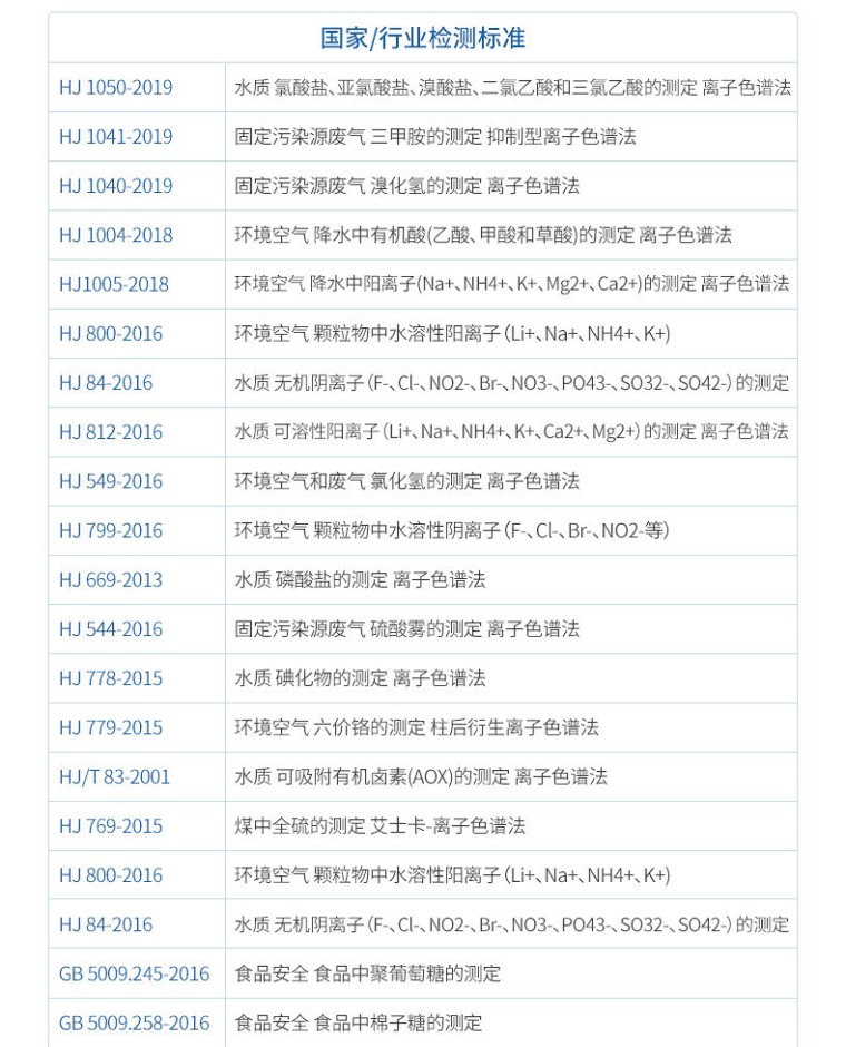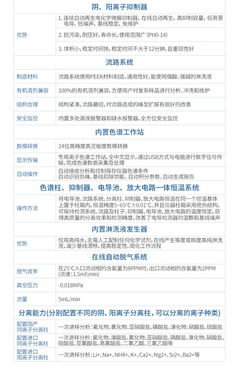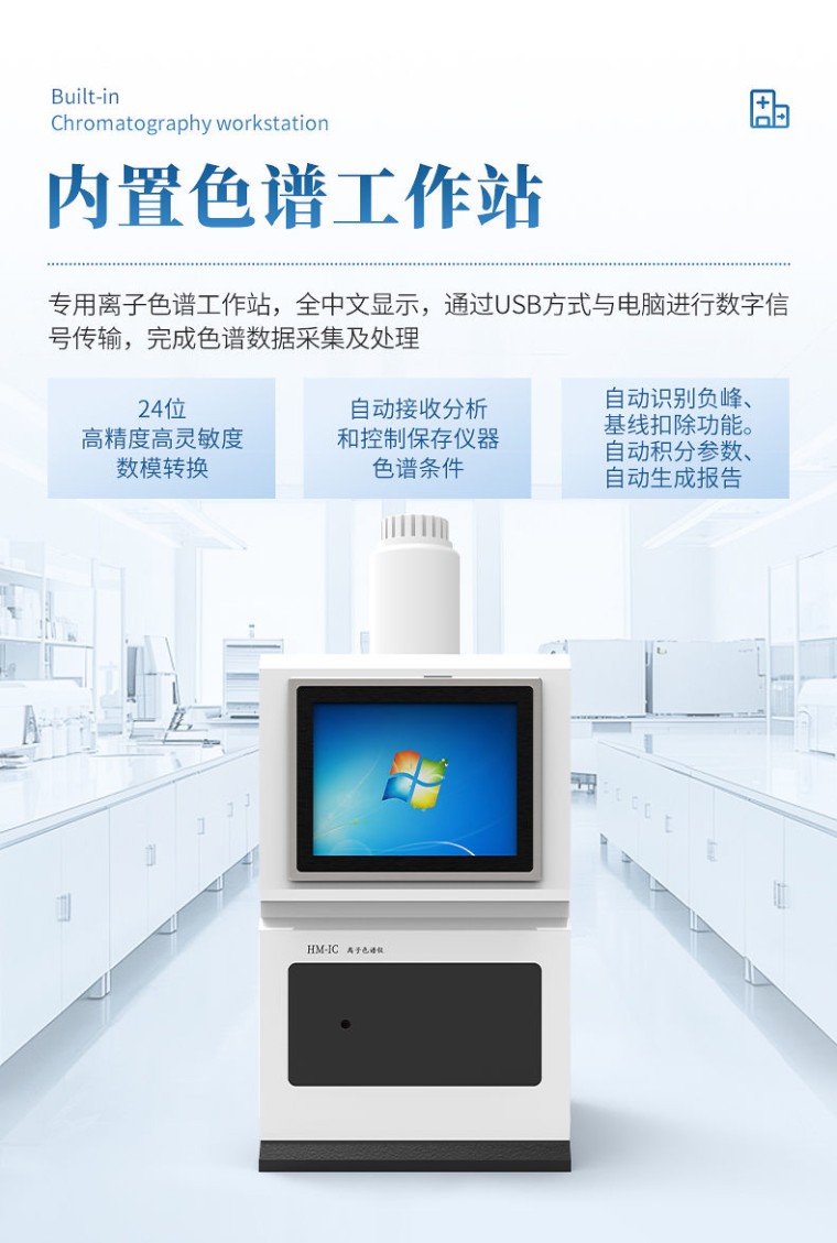 我们公司作为离子色谱仪器市场的新业态,一直致力于为用户提供更快捷、优质的仪器,以保障实验室的建设和运行。始终坚持以客户为中心,为有检测需求的客户服务。物美价廉、响应迅捷、服务全面。 全新一代HM-IC-离子色谱仪,采用12.1吋纯平工控电脑一体机设计(用户不需要配电脑),实时显示仪器运行参数和状态;一键启动电动阀进样,一键完成仪器开关机、维护等操作,一键调阅仪器操作教程,方便快捷。 HM-IC-离子色谱仪核心零部件自主研发、自主知识产权可控。采用一体化设计,集离子色谱主机、淋洗液发生器、工控电脑、色谱工作站于一体,结构紧凑,流路最短,对流路造成的峰型扩展有很好的改善。一体化恒温箱:色谱柱、抑制器、电导池、放大电路都处于同一恒温系统,改善了电导检测器的温飘和基线噪声。内置多处漏液报警器和缺水报警器,全方位安全监控。由PLC控制的各个部件统一到电脑显示屏的集中软件控制系统,操作方便,鼠标所见即所控。 主要配置和技术参数: 1 高压输液泵: 微处理器控制的双柱塞往复泵,采用先进的智能控制算法,能使泵的流量脉动降至最低水平。 1.1,材质:镶嵌式PEEK材料无阻尼泵头,PEEK管路,适合于pH为0~14的淋洗液及反相有机溶剂。 1.2,流量范围:0.001~9.999ml/min,增量0.001ml/min。 1.3,流量设定值误差:≤0.1% 1.4,流量稳定性:≤0.1% 1.5,工作压力:35MPa 1.6,过压保护:工作压力超过或低于设定的上限或下限时,泵将自行关闭且报警。 2 电导检测器: 2.1,原理:五极电导检测器 2.2,电极材料:钝化316L不锈钢 2.3,基线噪音:≤0.002μS/cm 2.4,基线漂移:≤0.008μS/cm·30min 2.5,zui小检出浓度:≤0.0005ug/mL(以Cl-计) 2.6,仪器线性:≥0.9995 2.7,定量重复性:≤0.1%(以Cl-计) 2.8,定性重复性:≤0.1%(以Cl-计) 2.9,测量范围:0~50000us/cm 2.10,分辨率:≤0.0020ns/cm 2.11,检测池体积:0.8uL 2.12,操作压力:≤10Mpa。 2.13,电导检测量程: 0-50000uS,10档可调。 3、 阴、阳离子抑制器: 3.1连续自动再生电化学微膜抑制器,在线自动再生,高抑制容量,低背景电导,低噪声,基线稳定,免维护。 3.2抗污染,耐压好,寿命长,使用范围广(PH0-14)。 3.3体积小,稳定时间快,稳定时间不大于12分钟,且重现性好。 4 流路系统: 4.1流路系统使用PEEK材料制造,通用性好,能使用强酸、强碱的淋洗液。 4.2****的有机溶剂兼容,方便用户对复杂样品进行分析、冲洗和维护。 4.3 结构紧凑,流路最短,对流路造成的峰型扩展有很好的改善。 4.4 内置多处漏液报警器和缺水报警器,全方位安全监控。 5 内置色谱工作站: 5.1 24位高精度高灵敏度数模转换。 5.2专用离子色谱工作站,全中文显示,通过USB方式与电脑进行数字信号传输,完成色谱数据采集及处理。 5.3自动接收分析和控制保存仪器色谱条件。 5.4自动识别负峰、基线扣除功能。自动积分参数、自动生成报告。 6 色谱柱、抑制器、电导池、放大电路一体恒温系统: 将电导池、流路系统、分离柱、抑制器、放大电路恒温在同一个控温基体上置于柱箱内,恒温精度5~65℃±0.01℃。并且仪器柱箱采用绝热结构,可保持检测系统、流路及柱子、抑制器、电导池、放大电路的温度恒定,获得高质量的分离效果和检测精度,改善了电导检测器的温飘和基线噪声。 7内置淋洗液发生器,仅用高纯水,无需人工配制任何化学试剂,在线产生等度或梯度高纯淋洗液,减少基线漂移,提高稳定性,简化工作流程。 8 在线自动脱气系统: 1,脱气效率:在25℃入口流动相的含氧量为8PPM时,出口流动相的含氧量为2PPM (流速:1.5mlmin) 2,真空压力:-0.018MPa 3,流量:5mL/min 9 分离能力:(分别配置不同的阴、阳离子分离柱,可以分离的离子种类:) 配置国产阴离子分离柱:一次进样分析:氟化物、氯化物、亚硝酸盐、磷酸盐、溴化物、硝酸盐、硫酸盐 配置进口阴离子分离柱:一次进样分析:氟化物、溴酸盐、氯化物、亚硝酸盐、磷酸盐、溴化物、硝酸盐、硫酸盐、亚氯酸盐、高氯酸盐、二氯乙酸、三氯乙酸等 配置进口阳离子分离柱:一次进样分析::Li+、Na+、NH4+、K+、Ca2+、Mg2+、Sr2+、Ba2+等 分国家/行业检测标准: