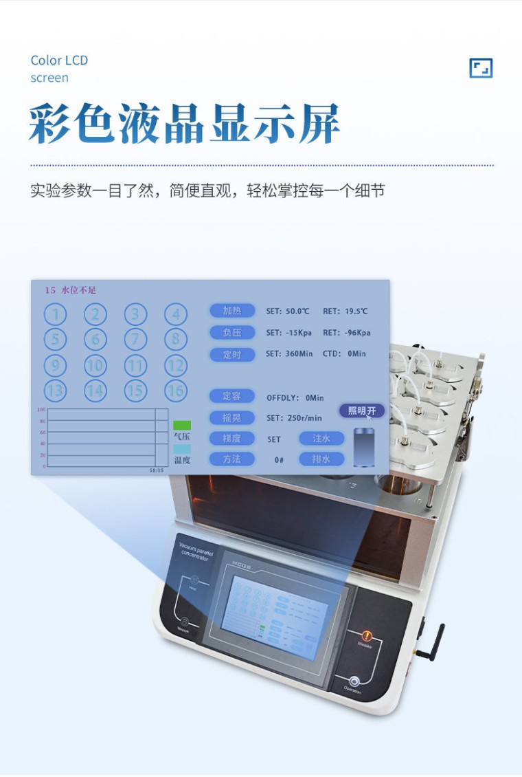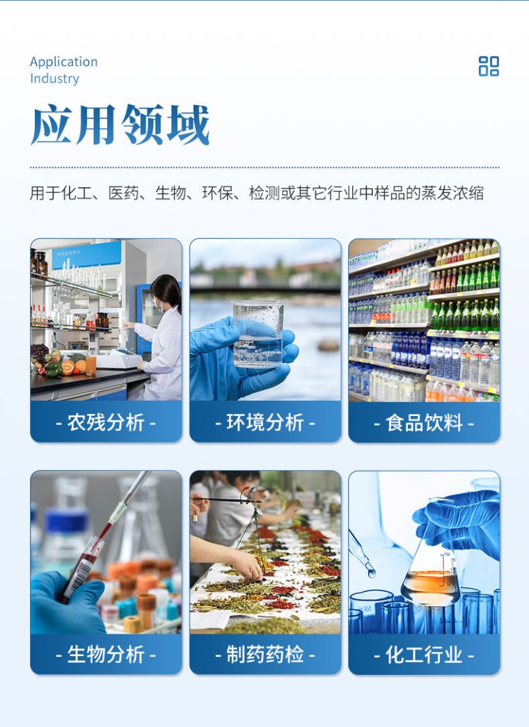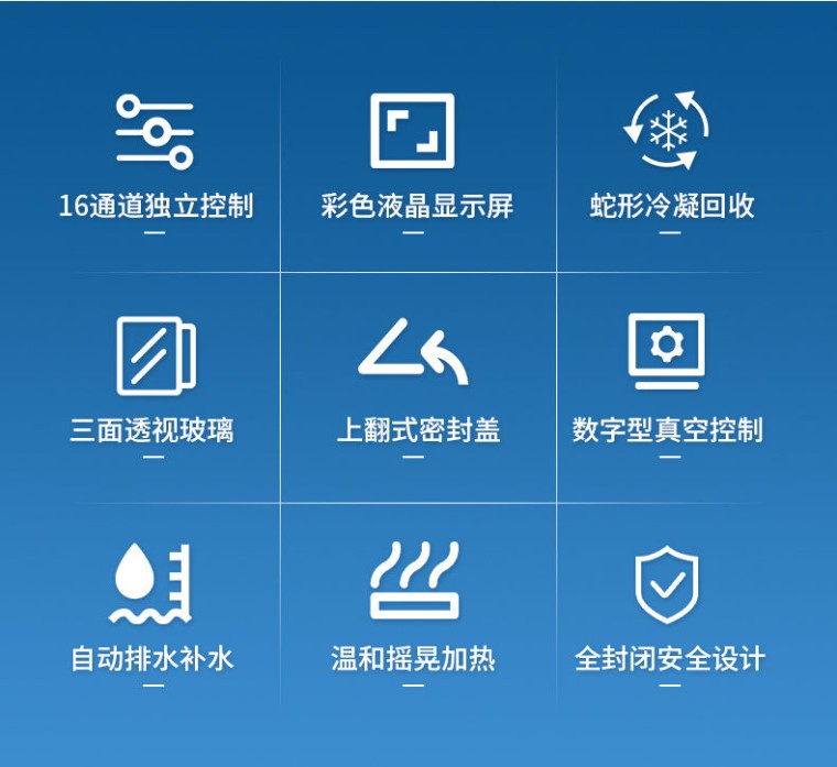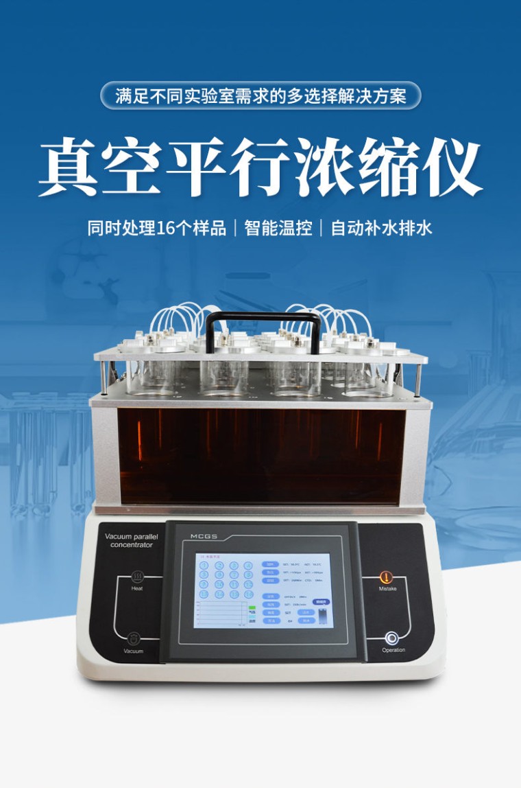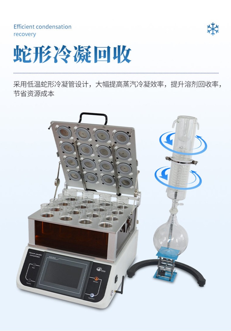 产品应用: 真空平行浓缩设备可对多个样品进行单独或者集中密闭蒸发/浓缩,快速有效的回收溶剂,降低了多个样品的总蒸发时间,增加了处理量,节省了操作实验时间和实验资源,平行蒸发仪安装操作简单、使用灵活。由于处理条件高度一致,因此平行性也更好。平行蒸发仪主要用于化工、医药、生物、环保、检测或其它行业中样品的蒸发浓缩。 应用领域: l 农残分析:蔬菜、水果、谷物、植物组织等 l 环境分析:饮用水、地下水和污染物等 l 食品饮料:牛奶、酒、啤酒等 l 生物分析:血清、血浆、血液、尿液等 l 制药药检:中药制药等 产品特点: l 三面可透视玻璃设计,便于观察。 l 下压盖采用上翻设计,轻轻抬起可任意停无需拆分挪动。 l 灯光、排水、泄压等操作独立开启关闭,适应复杂的实验需求。 l 水温、真空度可调。 l 采用比热容大的水作为导热媒介,每个孔位的温度一致,使样品在浓缩过程保持高度平行性。 l 专用定容瓶可浓缩250ml样液,浓缩可定容至1ml。 l 采用低温蛇形冷凝管进行蒸汽冷凝,冷凝面积大,回收效率高。 l 操作简便、安全:灵活的工作参数设定、方便的样品置入/取出过程,易学易用;蒸发通道全封闭设计可避免有机挥发组份对仪器及操作人员的伤害。 技术参数
