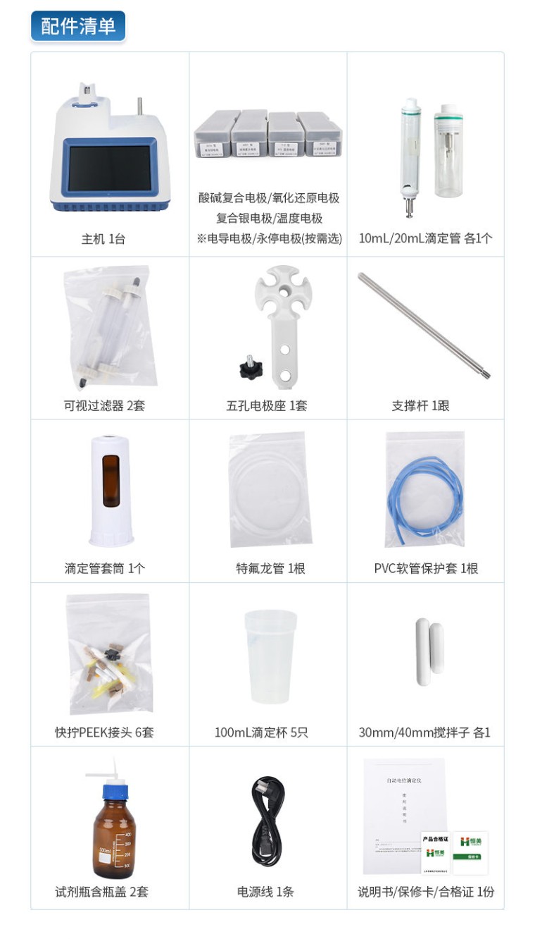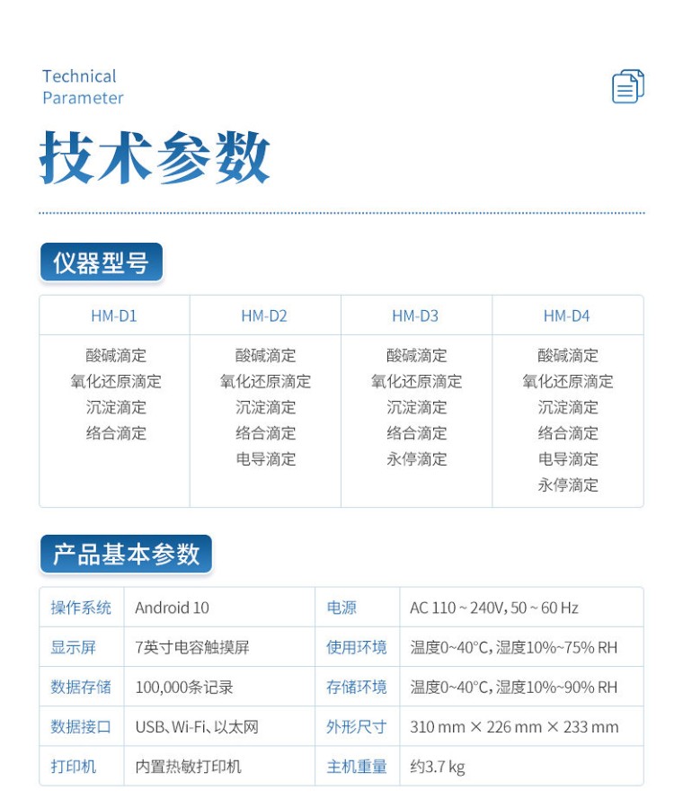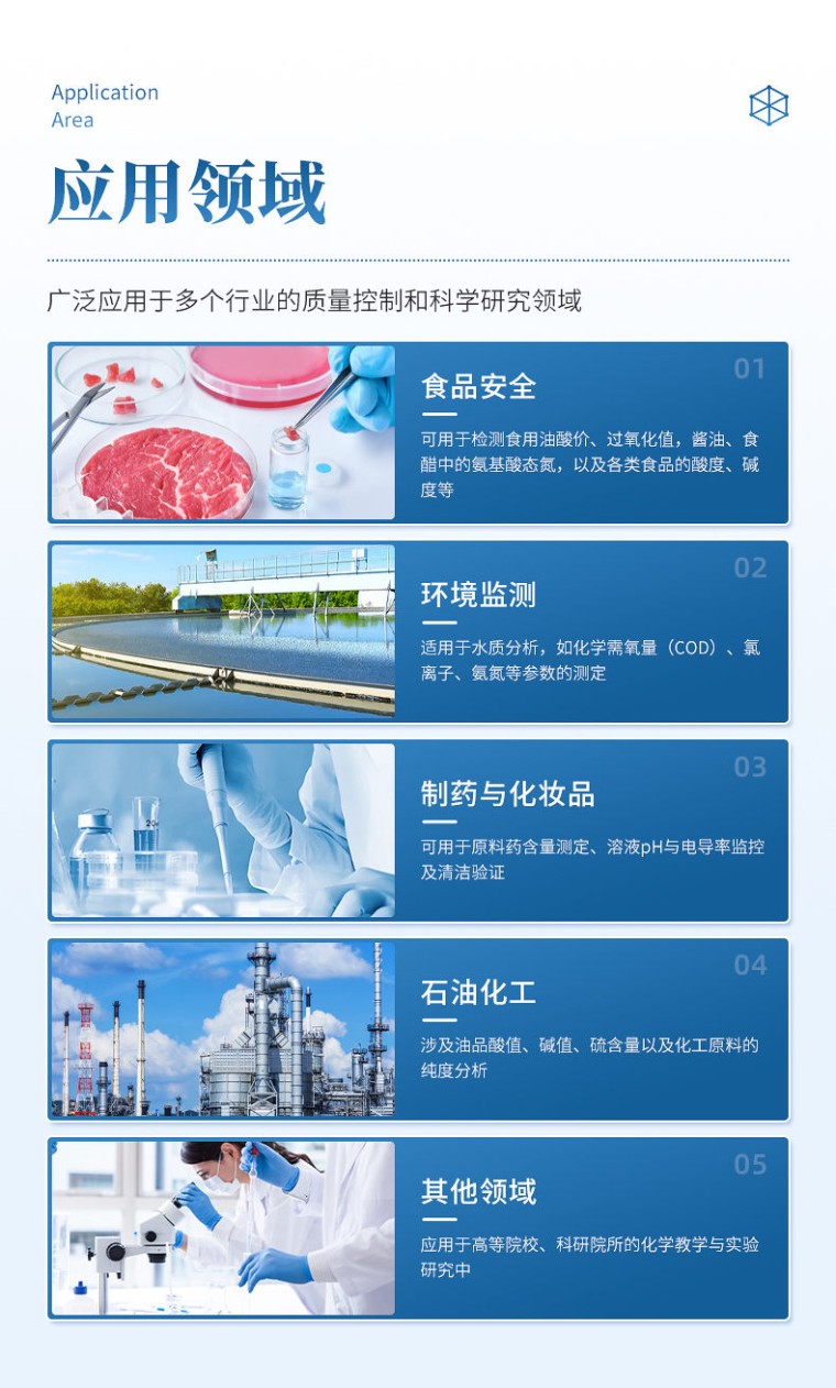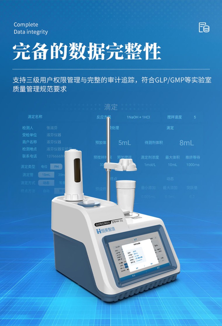 一、仪器简介 本系列酸碱氧化还原沉淀滴定仪是一款集高精度、智能化与模块化设计于一体的精密分析仪器。核心平台支持酸碱、氧化还原、沉淀、配位等基本滴定模式,并扩展电导滴定检测模块,真正实现按需配置、一机多用。 仪器采用先进的Android 10智能操作系统与7英寸高清触摸屏,操作直观流畅。核心性能**,滴定分析重复性≤0.2%,支持电位、pH及温度等多参数实时监测与补偿。仪器内置专业的常规滴定与专项滴定双模式,既可灵活满足研发需求,又能高效完成标准检测,直接输出样品含量结果。凭借高精度流体控制系统、海量数据存储、完备的审计追踪功能以及多种数据接口,本系列仪器成为实验室质量控制和科学研究的高效分析平台。 二、检测原理 酸碱氧化还原沉淀滴定仪的检测基于溶液电化学参数在滴定过程中的变化,通过高精度传感器实时监测并智能判断终点,实现自动化定量分析。 电位滴定是仪器的基本检测方式。在滴定过程中,指示电极与参比电极之间的电位差(或pH值)随滴定剂的加入而发生改变。仪器以0.1 mV(或0.01 pH)的高分辨率连续采集信号,绘制电位-体积曲线,并通过智能算法自动识别曲线的突跃点或拐点,从而精确判定滴定终点,适用于酸碱、氧化还原、沉淀和配位等四大类滴定反应。 电导滴定通过监测溶液电导率的变化来确定终点。滴定过程中,离子种类和浓度的改变会引起溶液导电能力的显著变化。仪器配备高稳定性电导检测模块,实时捕捉电导率转折点,尤其适用于极弱酸/碱滴定或混合体系的分析。 仪器通过集成上述传感器与智能控制系统,自动完成精密加液、信号采集、数据处理与终点判断,确保了检测过程的高准确性、高重复性与操作简便性。 三、参考标准 JJG 814-2015 《自动电位滴定仪检定规程》 GB/T 29252-2012 《实验室仪器和设备质量检验规则》 GB 4793.1-2007 《测量、控制和实验室用电气设备的安全要求 第1部分:通用要求》 四、应用范围 酸碱氧化还原沉淀滴定仪凭借其全面的滴定模块与高精度测量性能,广泛应用于多个行业的质量控制和科学研究领域。在食品安全领域,它可用于检测食用油酸价、过氧化值,酱油、食醋中的氨基酸态氮,以及各类食品的酸度、碱度等。在环境监测方面,适用于水质分析,如化学需氧量(COD)、氯离子、氨氮等参数的测定。制药与化妆品行业可用于原料药含量测定、溶液pH与电导率监控及清洁验证。石油化工领域则涉及油品酸值、碱值、硫含量以及化工原料的纯度分析。此外,该仪器在高等院校、科研院所的化学教学与实验研究中,同样是一款可靠的分析工具,能够满足从基础滴定到复杂体系研究的多种需求,为用户提供准确、高效且灵活的自动化分析解决方案。 五、仪器特点 1、模块化功能配置:提供从基础滴定到集成电导滴定及专项检测的全功能配置,用户可根据实际分析需求选择,性价比高,灵活性强。 2、智能安卓操作系统与触控交互:全系列搭载Android 10系统与7英寸高清电容触控屏,提供直观流畅的图形化操作体验。 3、高精度与高重复性:滴定分析重复性≤0.2%,终点判断准确可靠,确保分析结果的高可信度。 4、精密一体化流体系统:采用阀门滴定管一体化设计,支持10 mL/20 mL滴定管快速更换;管路耐酸碱、耐有机溶剂腐蚀,保障长期运行的稳定性。 5.★双滴定模式: 常规滴定模式:用户可自定义滴定参数,直接测定溶液中待测物的浓度,满足研发与未知样品分析等灵活需求。 专项滴定模式:支持用户根据国家标准、行业规范或内部方法,创建、保存并调用专属检测方法,实现“一键式”标准分析,直接输出样品含量。 6、多种终点检测方式: 支持电位与pH滴定,扩展支持电导滴定。提供动态、等量、预设终点及手动等多种滴定模式。 7.★强大的方法与数据管理:支持滴定方法的创建、编辑、存储与快速调用;内置物质库与自定义计算公式;本地可存储高达10万条数据,完整记录滴定曲线。 8、完备的数据完整性功能:支持三级用户权限管理与完整的审计追踪,符合GLP/GMP等实验室质量管理规范要求。 9、便捷的数据输出与连接:内置热敏打印机,并配备USB、Wi-Fi、以太网多种接口,支持数据即时打印、导出及上传至LIMS系统。 10、良好的扩展性:提供标准通信接口,可连接计算机软件或选配自动进样器,实现批量样品自动分析。 11、系统可靠性与维护便捷:具备断电保护功能,防止数据丢失;可设置系统自诊断与告警;软件可通过U盘或网络升级,便于维护与功能拓展。 12、多语言可设置与人性化设计:可设置中英文等多语言界面切换,并配备详细的操作帮助与教学视频,降低使用门槛。 六、技术参数 1、通用滴定性能 (1)滴定分析重复性:≤ 0.2% (2)滴定分析误差:≤ ±1.5% (3)10 mL滴定管: 1)滴定容量精度:±5 μL 2)滴定容量误差:10 μL/10 mL (4)20mL滴定管: 1)滴定容量精度:±10 μL 2)滴定容量误差:20 μL/10 mL 2、通用测量性能 (1)电位测量: 1)测量范围:-2000 mV ~ +2000 mV 2)分辨率:0.1 mV 3)基本误差:±0.25‰ FS 4)稳定性:±0.3 mV/3 h (2)pH测量: 1)测量范围:0 ~ 14 pH 2)分辨率:0.01 pH 3)基本误差:±0.01 pH (3)温度测量: 1)测量范围:-5 ~ 105 ℃ 2)分辨率:0.1 ℃ 3)基本误差:±0.2 ℃ (4)电导测量: 1)测量范围:0.00 μS/cm ~ 2000 mS/cm 2)基本误差:±1.0% FS 3)稳定性:±1.0% FS 3、通用系统与物理规格 (1)操作系统:Android 10 (2)显示屏:7英寸电容触摸屏 (3)数据存
