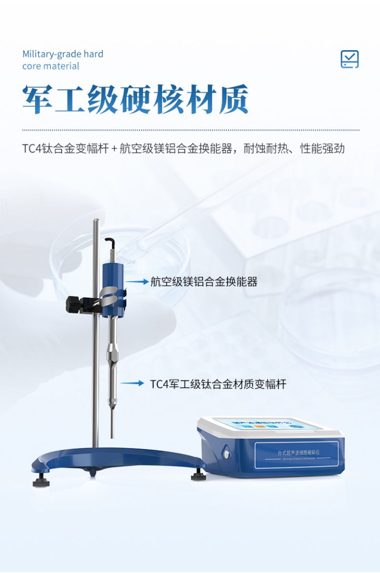 一、产品介绍: 超声波细胞破碎仪是一种利用强超声在液体中产生空化效应,对物质进行超声处理的多功能、多用途的仪器,能用于动植物组织、细胞、细菌、芽胞菌种的破碎,同时可用来乳化、分离、分散、匀化、提取、脱气、清洗及加速化学反应等等。 恒美自研自产的超声波细胞破碎仪,将隔音箱融入到主机中形成一体化。功能齐全、外观新颖、性能可靠。仪器采用大屏液晶显示;中央微机集中控制,超声输出、间隙时间、超声功率,样品温度监测显示,频率自动跟踪,故障自动报警等功能。适用于生物化学、微生物学、药物化学、表面化学、物理学、动物学、农学、医学、制药等领域的教学、科研及生产。 二、工作原理: 利用超声波在液体中的分散效应,使液体产生空化的作用,从而使液体中的固体颗粒或细胞组织破碎.超声波细胞粉碎机由超声波发生器和换能器二大部分组成。超声波发生器将市电转变成20-25KHz交变电能供给换能器。锆钛酸钡压电振子是换能器的心脏,它随交变电压以20-25KHz频率作伸缩弹性形变,换能器随之作纵向机械振动。振动波通过浸入在生物溶液中的钛合金变幅杆产生空化效应,激发介质里的生物微粒剧烈振动。 三、用途: 超声波破碎仪能用于粉碎动、植物细胞、细菌、牙孢或组织。分散稀土和各类无机矿物粉。 超声波破碎仪是加速化学、生物学、物理学的反应速度和加速液体脱气的理想装置。 超声波破碎仪能配制近乎微米的百分之一大小的乳胶体;匀化“难混溶”的混合液;聚合一些物质,析出另一些物质。 总之,超声波粉碎机能实现提取、粉碎、乳化、匀化、悬浮液、变异、气悬体、加速脱溶、晶化及在电子显微镜下配制各种生物样本之多种功能。 四、产品特点: 1.7英寸医疗级液晶触摸屏,高分辨率,界面直观,操作流畅; 2、一体式结构设计,减少占用实验室使用空间; 3、低噪音金属外壳,高品质隔音材质置于夹层,隔音效果好,工作仓内整洁卫生; 4、采用智能化MCU数字集成电路,支持间隙/连续运行模式; 5、亚克力大视窗,便于清洗、观察; 6、设备配置电动操作平台升降、 LED 照明系统、紫外杀菌功能; 7、设备设置 超声开时间、超声关时间、总时间可精确到0.1秒; 8、具有测试和运行模式并带有暂停或停止功能; 9、具有变幅杆自动匹配、频率自动跟踪、故障自动报警(或保护)等功能; 10、超声探头采用TC4**级钛合金材质,强度高、耐蚀性好、耐热性高; 11、航空级镁铝合金换能器,性能强劲; 12、中英文选择(出厂设置); 13、带有密码保护功能,防止非操作人员违规操作; 14、工作语音报警方式为蜂鸣器报警; 15、高达 256组工程参数储存,实验者可方便配置以及调取参数; 16、后置扩展接口,可扩展手动开关或脚踏开关,实现手动精细控制,也可扩展联动外部设备(如恒温装置、搅拌仪、便携式打印机、上位机等); 五、产品参数: 1、显示:7英寸高清触摸屏 2、超声功率:20-250W 3、换能器频率范围:20-25KHz 4、破碎容量:0.1--300ml(需选配相应的变幅杆) 5、单次超声时间:0.1-99.9S 6、单次间隙时间:0-99.9S(0为连续模式) 7、总时间:0.1-999.9M 8、调节方式:功率或PWM(选配) 9、温度传感器:接触式温度传感器 10、超温报警:0~99.9℃ 11、控温范围:1~99.9℃(可选配恒温装置) 12、接口:电源接口、USB、7P航空插头 13、可选配变幅杆:Φ2、Φ3、Φ6、Φ8、Φ10 14、 电源:220V±5%/50Hz 15、净重:大约19kg 16、仪器尺寸:345mm*350mm*560mm