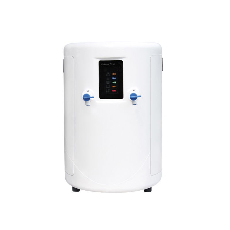 仪器简介: 1、 微电脑控制LED彩屏显示,全自动掺水 2、 双出水,可同时出UP水和RO水 3、 实时显示冲洗、制水、水满、缺水、检查状态 4、 自动定时冲洗,缺水自动保护 5、 取水自动开机,不用水自动停机,用电省,维护方便,彻底取代传统蒸馏水器 6、电磁阀按键取水 7、仪器使用6小时有断水保护功能。 8、采用进口罗门哈斯树脂,进口FCS反渗透膜。 主要技术指标: 1、 进水:城市自来水TDS<200ppm 2、 当TDS>200ppm时,需配软水器 3、出水水质:UP电阻率>17-18.2mΩ.cm@25C° 4. RO电阻率2-10us/cm 5、 重金属离子<0.2ppb 6、 产水量10L/H或20L/H根据客户选择 7、 瞬间取水量:1.2L/min(选配高压桶) 8、 水压:0.1-0.5MPa 9、 整机功率:50