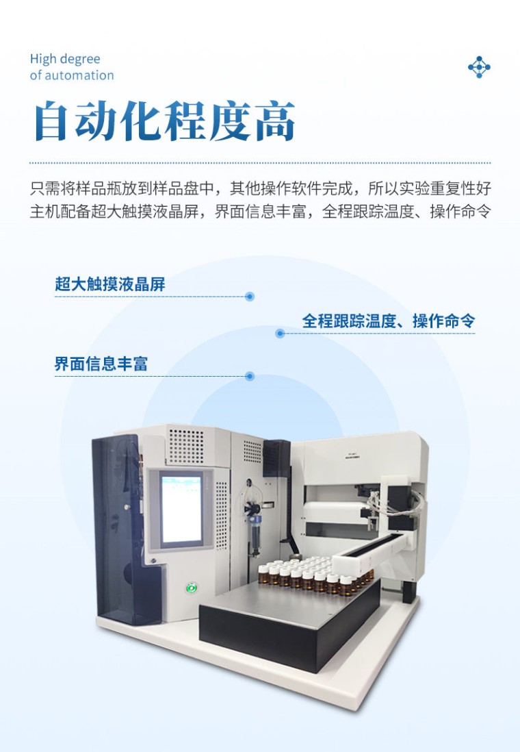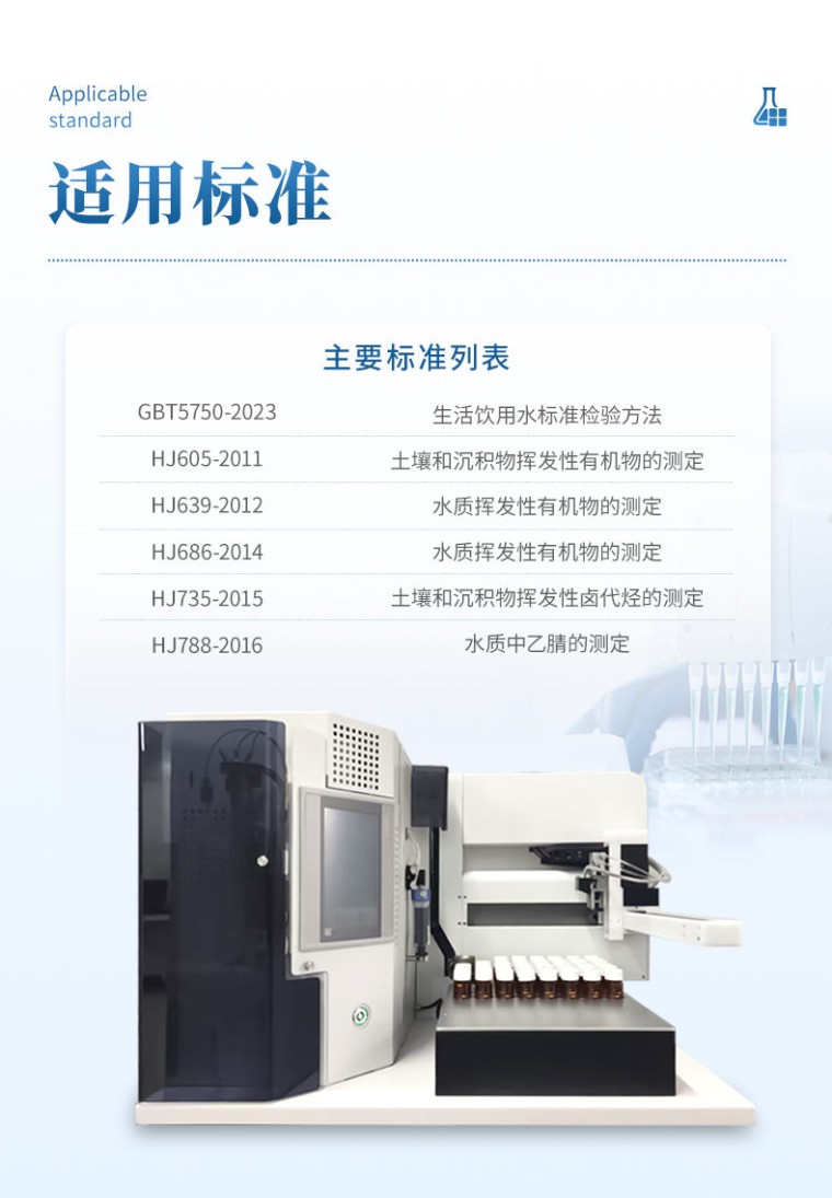 一、概述 固液吹扫捕集仪是一款多工位固液一体全自动吹扫捕集仪。支持液体样品自动精确取样到吹扫瓶中进行吹扫捕集,也支持对固体样品自动加入蒸馏水振荡混合直接进行吹扫捕集。 二、适用标准列表 •GBT5750-2023生活饮用水标准检验方法,测定有机物指标 •HJ605-2011土壤和沉积物挥发性有机物的测定,吹扫捕集/气相色谱-质谱法 •HJ639-2012水质挥发性有机物的测定,吹扫捕集/气相色谱-质谱法 •HJ686-2014水质挥发性有机物的测定,吹扫捕集/气相色谱-质谱法 •HJ735-2015土壤和沉积物挥发性卤代烃的测定,吹扫捕集/气相色谱-质谱法 •HJ788-2016水质中乙腈的测定,吹扫捕集/气相色谱法 三、应用领域 通过与GC或GC/MS的联用,可以广泛应用于环境分析,如饮用水、废水、土壤中的有机污染物分析,也可用于食品中挥发物(如气味成分)的分析等。 四、主要功能及特点 1、通用性能强:可与任意品牌气相色谱仪(GC)和(GC-MS)联用; 2、操作简便,自动化程度高:只需将样品瓶放到样品盘中,其他操作软件完成,所以实验重复性好;主机配备超大触摸液晶屏,界面信息丰富,全程跟踪温度、操作命令; 3、冷阱采用风冷,进口填料的捕集管在室温状态下,(无需将冷阱温度降至零下)即可吸附标准所要求的全部挥发性有机物,有效降低水气影响、降低设备功耗,同时保证优越的吸附性能; 4、捕集管升温采用缠绕式电阻加热,升温速率>3000℃/min; 5、可加装内置泡沫传感器,检测吹扫管内泡沫,防止污染样品的途径,保护整个分析系统; 6、用户可自定义取样针和吹扫管的清洗次数; 7、固体样品瓶可加热,可直接注入蒸馏水振荡混合吹扫; 8、捕集管与吹扫管反吹气体分离,减少样品间的交叉污染,在反吹循环中,从捕集阱中吹出的化合物不会流进吹扫管中; 9、除水阱在吹扫端去除水汽,极大减少水蒸气对GC和GC/MS的影响; 10、样品管路采用PEEK材料和硅烷化惰性处理不锈钢管,减少污染残留; 11、所有管路和六通阀可控温加热,消除系统冷点,减少样品损失; 12、提供同步接口,在进样的同时可以同时启动色谱和工作站; 13、具备开机自检、周期自检功能,有故障报警和提示,具备温度过载保护功能,漏电保护功能,提高了仪器使用的安全系数; 五、性能指标 1、样品位:84位,40mlVOA样品瓶; 2、捕集管解吸温度:150~400℃,升温速率>3000℃/min; 3、管路加热温度:室温~220℃,步长1℃; 4、阀进样系统温度及控制范围:室温~220℃,步长1℃; 5、吹扫管温度:室温~100℃,步长1℃; 6、除水器加热温度:室温~240℃; 7、清洗蒸馏水温度:室温~90℃,步长1℃; 8、固体样品瓶加热:室温~100℃,步长1℃; 9、固体样品混合:5ml蒸馏水,振荡混合; 10、玻璃吹扫管:5ml吹扫管; 11、捕集管:U型钝化捕集管; 12、吹扫流量:10~150ml/min; 13、定时范围:1s~100min; 14、定时误差:<0.1%; 15、气路耐压:>0.4MPa; 16、同步信号输出:2路开关量,联动开关时间为1~2秒; 17、电源:AC220V50Hz; 18、功率:<800W; 19、仪器尺寸:570mm*730mm*510mm; 六、环境适应性 1、反吹载气压力:≤0.4MPa; 2、环境温度:5~35℃; 3、相对湿度:≤85%;