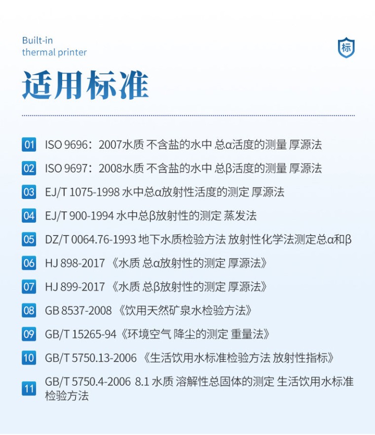 仪器用途 适用于水质及自来水行业,放射性总α、β及其他放射性水样检测过程中的水样蒸发浓缩赶酸的前处理;环境空气降尘样品自动蒸发浓缩;溶解性总固体(TDS)项目的蒸发浓缩,其他大体积水样浓缩等。 仪器特点 1、 智能微电脑七寸彩色电容触摸屏,界面友好,实验过程各通道参数实时监测。 2、 国标方法,样品无需转移,减少转移样品损失。 3、 八通道独立运行,一键启动,自动浓缩定量。 4、 单孔单控,进口远红外辐射加热,PID温度控制。 5、 单路设置温度:室温-350℃ 。 6、 兼容125ml/200ml瓷蒸发皿。 7、 高精度传感器定量,智能添加水样,进样量可单独设置(最大50L),到达设定值自动停止加热。 8、 浓缩体积单孔单孔,蒸发浓缩量0-200ml。 9、 样品凝缩后自动盐化灼烧,样品浓缩后无需转移。 10、 可升级自动加酸,实现全过程无人值守,提高实验效率。 11、 自动清洗,八路自动清洗。清洗次数可单独设定。 12、 断电保护,参数自动保存,来电自动恢复工作状态。 13、 整机防腐耐高温,保证仪器长期稳定运行。 适用标准 ISO 9696:2007水质 不含盐的水中 总α活度的测量 厚源法 ISO 9697:2008水质 不含盐的水中 总β活度的测量 厚源法 EJ/T 1075-1998 水中总α放射性活度的测定 厚源法 EJ/T 900-1994 水中总β放射性的测定 蒸发法 DZ/T 0064.76-1993 地下水质检验方法 放射性化学法测定总α和β HJ 898-2017 《水质 总α放射性的测定 厚源法》 HJ 899-2017 《水质 总β放射性的测定 厚源法》 GB 8537-2008 《饮用天然矿泉水检验方法》 GB/T 15265-94《环境空气 降尘的测定 重量法》 GB/T 5750.13-2006 《生活饮用水标准检验方法 放射性指标》 GB/T 5750.4-2006 8.1 水质 溶解性总固体的测定 生活饮用水标准检验方法 工作条件 供电电源: AC 220V,50Hz 环境温度: 10-35℃ 环境湿度: <60% 产品规格 样品通道: 八路自动进样 主机尺寸: 600mm*485mm340mm 温度范围: 0-350℃ 额定功率: 2200W