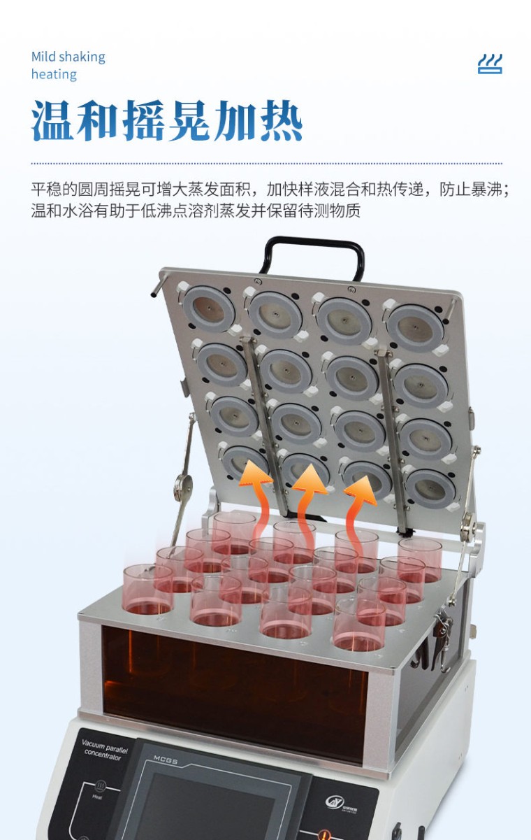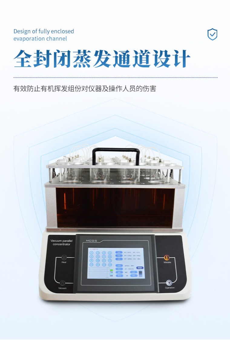 产品应用: 真空平行浓缩仪可对多个样品进行单独或者集中密闭蒸发/浓缩,快速有效的回收溶剂,降低了多个样品的总蒸发时间,增加了处理量,节省了操作实验时间和实验资源,平行蒸发仪安装操作简单、使用灵活。由于处理条件高度一致,因此平行性也更好。平行蒸发仪主要用于化工、医药、生物、环保、检测或其它行业中样品的蒸发浓缩。 应用领域: 农残分析:蔬菜、水果、谷物、植物组织等 环境分析:饮用水、地下水和污染物等 食品饮料:牛奶、酒、啤酒等 生物分析:血清、血浆、血液、尿液等 制药药检:中药制药等 产品特点: 三面可透视玻璃设计,便于观察。 真空密封盖具有独立取放功能,在工作中可取放任意定容瓶。 各真空管路独立连接,避免样品交叉污染。 下压盖采用上翻设计,轻轻抬起可任意停无需拆分挪动。 灯光、摇晃、排水、泄压等操作独立开启关闭,适应复杂的实验需求。 水温、摇晃转速、真空度可调,16通道真空独立开启,系统支持梯度负压。 采用比热容大的水作为导热媒介,每个孔位的温度一致,使样品在浓缩过程保持高度平行性。 专用定容瓶可浓缩250ml样液,浓缩可定容至1ml。 每个通道设置有定容传感器,避免了样液过度浓缩带来的损失。 采用低温蛇形冷凝管进行蒸汽冷凝,冷凝面积大,回收效率高。 平稳的圆周摇晃,加大蒸发面积,加快样液混匀和热量传递,避免样液的暴沸。温和的水浴环境利于低沸点溶剂的蒸发和待测目标物在挥发过程中的保留。数字型的真空控制模式,高灵敏传感器实时检测真空度,避免样液在过低压力下爆沸造成目标待测物的损失。 操作简便、安全:灵活的工作参数设定、方便的样品置入/取出过程,易学易用;蒸发通道全封闭设计可避免有机挥发组份对仪器及操作人员的伤害。 技术参数: