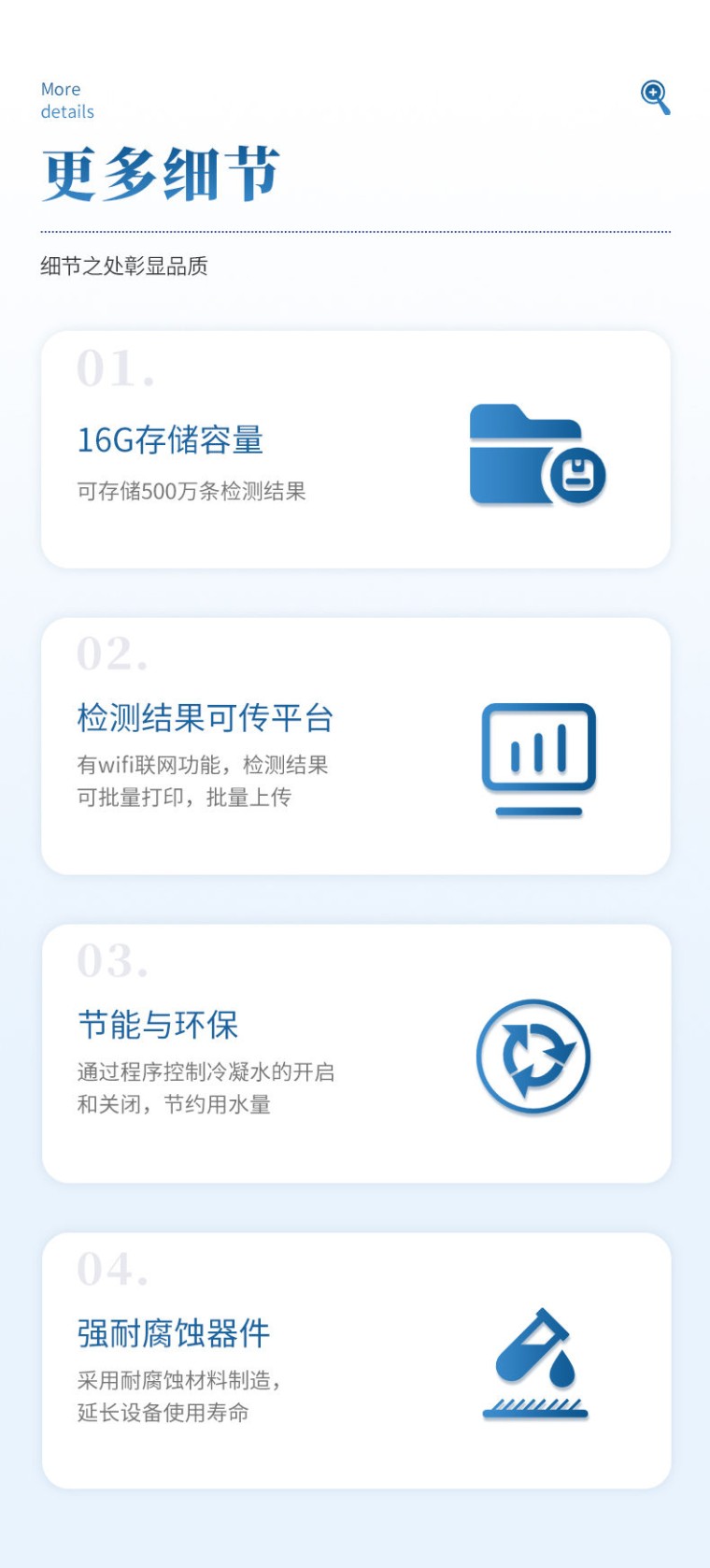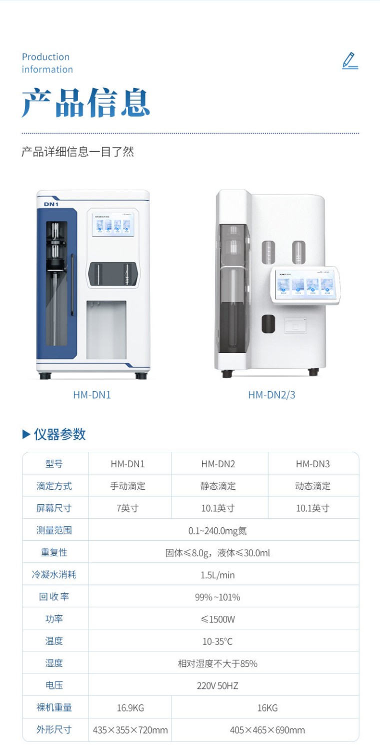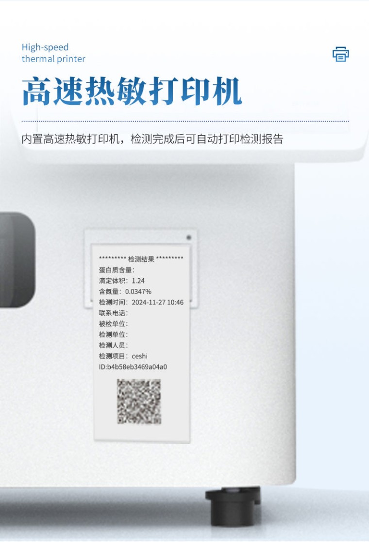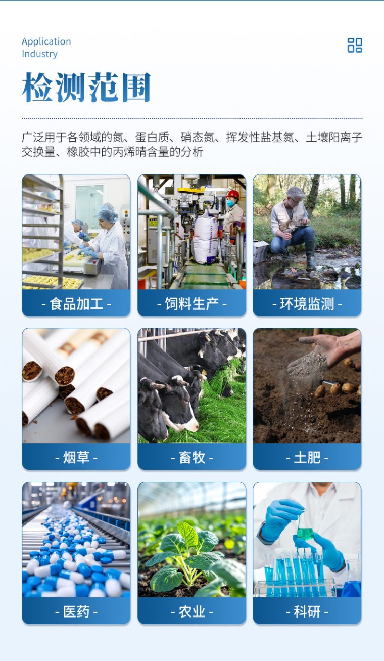 1.仪器简介 凯氏定氮仪是根据凯氏定氮法进行氮含量、蛋白质含量测定的自动化仪器。可广泛用于食品加工、饲料生产、烟草、畜牧、土肥、环境监测、医药、农业、科研、教学等领域氮及蛋白质的分析。 根据凯氏定氮法原理,仪器对消解后的样品进行自动定量添加试剂、蒸馏、吸收、滴定并输出测试结果,结果可以是氮含量,也可以是转换为蛋白质的含量。具体反应步骤为样品消解后产生的硫酸铵与碱反应生产氨气,氨气与蒸汽一起经过冷凝管冷凝后被收集到加入了硼酸的吸收液中,同时吸收液中的指示剂发生颜色变化,然后仪器进行自动滴定,颜色传感器能自动判定滴定终点,根据标准滴定酸的消耗量即可计算样品的含氮量。 全自动凯氏定氮仪所有步骤自动按程序完成。为检测人员在进行氮及蛋白质测定中提供了极大的方便。具有使用安全、可靠、操作简单、省时省力等特点。 2.仪器参数 (1) 测量范围:0.1~240.0mg氮 (2) 样品重量:固体≤8.0g,液体≤30.0ml (3) 测量精度:相对差≤1% (4) 重 复 性:平行差≤0.5% (5)滴定精度: 1.0uL/步 (6)滴定方式:动态滴定 (边蒸馏边滴定,比静态滴定节约时间30%-50%) (7)冷凝水消耗:1.5L/min (8) 回 收 率:99% ~101% (9) 测定速度:3~9min/样品 (10) 功 率:≤1500W (11) 温 度:10-35℃ (12) 湿 度:相对湿度不大于85% (13) 电 压:220V 50HZ (14)裸机重量:16KG (15)外形尺寸:405mm×465mm×690mm(长×宽×高) 3.产品优势 (1) 10.1寸触摸屏,Android10系统。 (2) 自动完成加碱、加硼酸、加稀释液、加蒸馏水等加液步骤;自动完成蒸馏、吸收、滴定等操作步骤;滴定完成后反应杯自动排空和清洗。 (3) 蒸发炉水位监测、防干烧保护、冷凝水流速监测、冷凝管温度检测等防护功能。 (4) 高容量16G存储容量,检测结果存储容量500万条。 (5) 检测结果为Excel表格,直接拷贝到U盘。 (6) 检测结果可批量打印,批量上传。 (7) 高速热敏打印机,检测完成可自动打印检测报告。 (8) 有wifi联网功能,检测结果可直接上传平台。 (9) 程序控制冷凝水开启关闭,节约用水量。 (10) 冷凝水流速监测,低流速报警。 (11) 蒸发器水位,温度,压力等多重防护。 (12) 采用强耐腐蚀器件。 4.配件表