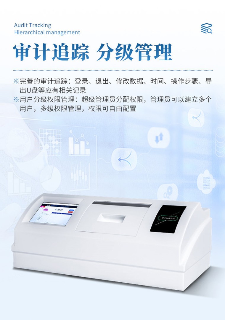 仪器介绍: 旋光度测量仪是测定物质旋光度的仪器。通过旋光度的测定,可以分析确定物质的浓度,含量及纯度等,广泛地应用于医药、石油、食品、化工、香精、香料、制糖等行业及相关的高校和科研院所。 软件功能: 审计追踪:完整版审计追踪和用户分级权限管理, 超级管理员可以修改所有人密码和用户名并可追溯,超级管理员可以修改所有操作员权限,用户帐号有禁用和启用两个功能,人员更替暂时不用删除账户,可以锁定,使用时可以解封,U盘导出PDF和Excel数据防篡改功能。 比较完善的审计追踪,登录、退出、修改数据、时间、操作步骤、导出U盘等应有相关记录。 用户管理:分级管理,超级管理员分配权限,管理员可以建立多个用户,每个使用者可以使用各自的用户名,登录时输入用户名和密码,用户帐号有禁用和启用两个功能 最高权限可修改他人用户名和密码,并可追踪。 数据检索功能:方便用户在大量数据库中快速找到想要的数据 图谱功能:测试过程中可实时显示图谱,方便做分析 内存:可扩展至64G 软件升级:支持U盘自动升级,无需返厂 仪器特点: 1: 内置帕尔贴控温,提高精度和稳定性; 2:有旋光度/比旋度/浓度/糖度及自定义模式; 3:LED冷光源代替传统钠光灯和卤钨灯; 4:符合21CFR Part 11审计追踪,药典及电子签名; 5:支持网络打印,支持数据统计检索; 6:多级权限管理,权限可自由配置; 7:8寸触摸彩屏,人性化操作界面; 8:系统自带自动校准系统。 主要技术参数: 测量模式:旋光度、比旋度、浓度、糖度、自定义 光 源:LED冷光源+高精度的干涉滤光片 工作波长:589.3nm(可选) 测试功能:单次、多次、连续测量方式 测量范围:旋光度±90° 糖度±259°Z *分 辨率:0.0001° (旋光度) *示值误差:±0.003° 重 复 性:(标准偏差s)0.0005°(旋光度) *温控范围:10℃-55℃(帕尔贴) 控温精度:±0.1℃ 显示方式:8英寸TFT真彩触摸屏 试 管:标配 100mm耐腐蚀控温型、200mm、100mm普通玻璃型 透 光 率:0.01% *网 络:无线WIFi连接 自动校准:有/(常规标准管) 用户管理:有/三级管理 通信接口:USB连接、RS232连接、VGA、以太网 数据存储:32G *审计追踪:有 *软件升级:U盘自动升级 电子签名:有 预存测量方法:500以上 多功能数据检索:有 自定义公式编辑:有 多种文件格式导出:PDF和Excel *打印机:兼容WIFI无线激光打印机和ZG针式/热敏打印机 *网络文库:有 *图谱分析:实时图谱分析 通信接口:USB/键盘/鼠标/通用打印机/ VGA/以太网 *用户账户:冻解启停功能 语言:中文/英文 导出文件验证高等级防护MD5:有 用户分级和权限设定:3级 *用户找回密码:有 *用户名可修改追溯:有 修改日期时间追溯:有 准确度:符合JJG536-2015中0.01级 其他选配件:鼠标、键盘连接、通用打印机/无线网路打印机 电 源:220V±22V,50Hz±1Hz,250W 仪器净重:28kg