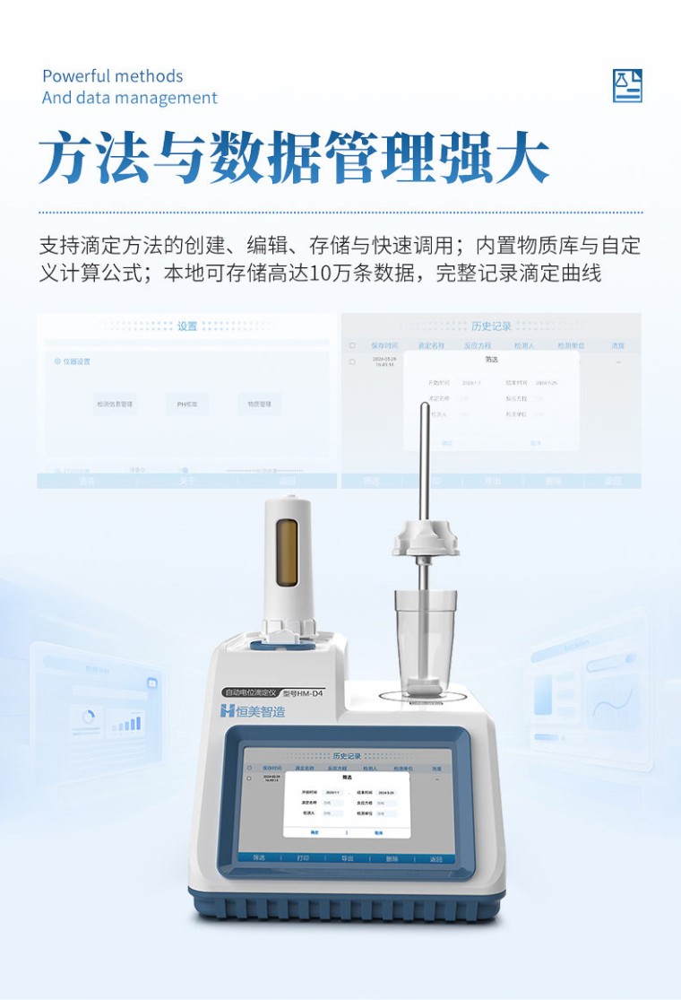 一、仪器简介 本系列电位滴定仪是一款集高精度、智能化与模块化设计于一体的精密分析仪器。核心平台支持酸碱、氧化还原、沉淀、配位等基本滴定模式,并扩展电导滴定、永停滴定等高级检测模块,真正实现按需配置、一机多用。 仪器采用先进的Android 10智能操作系统与7英寸高清触摸屏,操作直观流畅。核心性能**,滴定分析重复性≤0.2%,支持电位、pH及温度等多参数实时监测与补偿。仪器内置专业的常规滴定与专项滴定双模式,既可灵活满足研发需求,又能高效完成标准检测,直接输出样品含量结果。凭借高精度流体控制系统、海量数据存储、完备的审计追踪功能以及多种数据接口,本系列仪器成为实验室质量控制和科学研究的高效分析平台。 二、检测原理 电位滴定仪的检测基于溶液电化学参数在滴定过程中的变化,通过高精度传感器实时监测并智能判断终点,实现自动化定量分析。 电位滴定是仪器的基本检测方式。在滴定过程中,指示电极与参比电极之间的电位差(或pH值)随滴定剂的加入而发生改变。仪器以0.1 mV(或0.01 pH)的高分辨率连续采集信号,绘制电位-体积曲线,并通过智能算法自动识别曲线的突跃点或拐点,从而精确判定滴定终点,适用于酸碱、氧化还原、沉淀和配位等四大类滴定反应。 电导滴定通过监测溶液电导率的变化来确定终点。滴定过程中,离子种类和浓度的改变会引起溶液导电能力的显著变化。仪器配备高稳定性电导检测模块,实时捕捉电导率转折点,尤其适用于极弱酸/碱滴定或混合体系的分析。 永停滴定采用双铂电极系统,在外加微小恒定极化电压下,监测流过电极对的电流变化。在化学计量点附近,可逆电对的生成或消失会导致电流发生突变,仪器以此作为终点指示信号。该方法灵敏度高,特别适用于以碘量法、亚硝酸钠法等为基础的容量分析。 仪器通过集成上述传感器与智能控制系统,自动完成精密加液、信号采集、数据处理与终点判断,确保了检测过程的高准确性、高重复性与操作简便性。 三、参考标准 JJG 814-2015 《自动电位滴定仪检定规程》 GB/T 29252-2012 《实验室仪器和设备质量检验规则》 GB 4793.1-2007 《测量、控制和实验室用电气设备的安全要求 第1部分:通用要求》 四、应用范围 电位滴定仪凭借其全面的滴定模块与高精度测量性能,广泛应用于多个行业的质量控制和科学研究领域。在食品安全领域,它可用于检测食用油酸价、过氧化值,酱油、食醋中的氨基酸态氮,以及各类食品的酸度、碱度等。在环境监测方面,适用于水质分析,如化学需氧量(COD)、氯离子、氨氮等参数的测定。制药与化妆品行业可用于原料药含量测定、溶液pH与电导率监控及清洁验证。石油化工领域则涉及油品酸值、碱值、硫含量以及化工原料的纯度分析。此外,该仪器在高等院校、科研院所的化学教学与实验研究中,同样是一款可靠的分析工具,能够满足从基础滴定到复杂体系研究的多种需求,为用户提供准确、高效且灵活的自动化分析解决方案。 五、功能特点 1、模块化功能配置:提供从基础滴定到集成电导、永停及专项检测的全功能配置,用户可根据实际分析需求选择,性价比高,灵活性强。 2、智能安卓操作系统与触控交互:全系列搭载Android 10系统与7英寸高清电容触控屏,提供直观流畅的图形化操作体验。 3、高精度与高重复性:滴定分析重复性≤0.2%,终点判断准确可靠,确保分析结果的高可信度。 4、精密一体化流体系统:采用阀门滴定管一体化设计,支持10 mL/20 mL滴定管快速更换;管路耐酸碱、耐有机溶剂腐蚀,保障长期运行的稳定性。 5.★双滴定模式: 常规滴定模式:用户可自定义滴定参数,直接测定溶液中待测物的浓度,满足研发与未知样品分析等灵活需求。 专项滴定模式:支持用户根据国家标准、行业规范或内部方法,创建、保存并调用专属检测方法,实现“一键式”标准分析,直接输出样品含量。 6、多种终点检测方式: 支持电位与pH滴定并扩展支持电导滴定和永停滴定。提供动态、等量、预设终点及手动等多种滴定模式。 7.★强大的方法与数据管理:支持滴定方法的创建、编辑、存储与快速调用;内置物质库与自定义计算公式;本地可存储高达10万条数据,完整记录滴定曲线。 8、完备的数据完整性功能:支持三级用户权限管理与完整的审计追踪,符合GLP/GMP等实验室质量管理规范要求。 9、便捷的数据输出与连接:内置热敏打印机,并配备USB、Wi-Fi、以太网多种接口,支持数据即时打印、导出及上传至LIMS系统。 10、良好的扩展性:提供标准通信接口,可连接计算机软件或选配自动进样器,实现批量样品自动分析。 11、系统可靠性与维护便捷:具备断电保护功能,防止数据丢失;可设置系统自诊断与告警;软件可通过U盘或网络升级,便于维护与功能拓展。 12、多语言可设置与人性化设计:可设置中英文等多语言界面切换,并配备详细的操作帮助与教学视频,降低使用门槛。 六、技术参数 1、通用滴定性能 (1)滴定分析重复性:≤ 0.2% (2)滴定分析误差:≤ ±1.5% (3)10 mL滴定管: 1)滴定容量精度:±5 μL 2)滴定容量误差:10 μL/10 mL (4)20mL滴定管: 1)滴定容量精度:±10 μL 2)滴定容量误差:20 μL/10 mL 2、通用测量性能 (1)电位测量: 1)测量范围:-2000 mV ~ +2000 mV 2)分辨率:0.1 mV 3)基本误差:±0.25‰ FS 4)稳定性:±0.3 mV/3 h (2)pH测量: 1)测量范围:0 ~ 14 pH 2)分辨率:0.01 pH 3)基