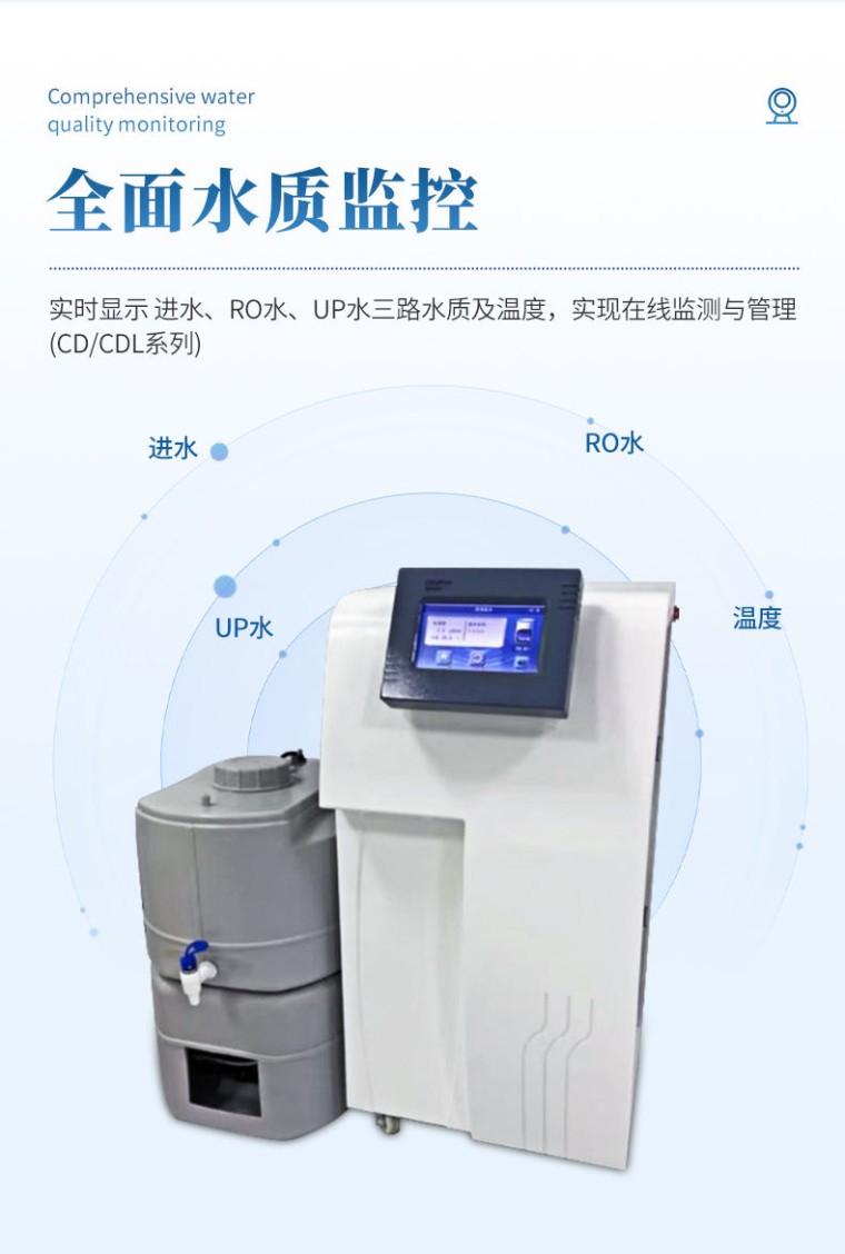 仪器特点: ■外壳全部采用模具注塑一次成型,美观、大方 ■5.1英寸彩色触摸屏,动画式菜单控制系统 ■具备开机自检,缺水保护报警,满水自动停机功能 ■采用更先进的触摸按键取水方式,操作灵活方便 ■RO水、UP水二路水质及温度显示,实现在线监控 ■耗材寿命管理功能,显示耗材剩余寿命,到期更换自动提醒 ■系统设置密码保护功能,防止未经授权更改数据 ■全自动RO膜自动冲洗功能,有效防止水垢,延长膜寿命 ■水质报警功能,低于设定值,自动报警 ■0.2umPES滤膜,确保微生物的截留,有效去除颗粒物和细菌 ■定质自动循环,时刻保持稳定水质 ■系统时间设定(年/月/日/时/分)、冲洗时间、定时关机(0~24h).待机休眠(0~60分钟) ■可任意设定预处理、RO膜、UV灯和超纯水包寿命 ■ 选配双级反渗透、UV紫外线消毒模块、UF超滤膜组件 ■运行状态具有循环、制水、冲洗、水满,缺水等指示 ■特设工厂、客户二级密码,系统设置均有密码保护 ■预处理系统去除原水颗粒物质、余氯及吸附有机物、异味等 ■主机采用ABS材料,水电分离,耐腐耐潮,安全可靠 技术参数: 进水水源:总溶解固体量TDS≤200ppm,水压0.10~0.40MPa,水温5~45℃ 预处理单元:三级多功能复合型 制水量:10L 出水流速:1.5~1.8(L/min)水箱储满水时 UP出水水质:电阻率18.2MΩ.cm@25℃(在线监测)微颗粒物≤1个/ml,微生物≤1cfu/ml重金属离子≤0.1ppb,TOC≤10ppb热原≤0.001EU/ml,核糖核酸酶RNases<0.5pg/ml脱氧核糖核酸酶DNases<5pg> RO出水水质:电导率范围:单级1~10uS/cm(在线监测)双级1~5μS/cm(在线监测) UF超滤膜:选配 UV紫外灯:选配 双级反渗透:选配 终端过滤器:标配 主机尺寸:630x390x525(毫米) 主机重量:35公斤 电源:AC220V/50HZ(功率:55W) 水箱配置:3.2G高压桶 适用场景:生命科学类、化学分析类、材料与纳米、环境与食品检测、医学与临床、制药与质量控制、科研与教育机构等实验室