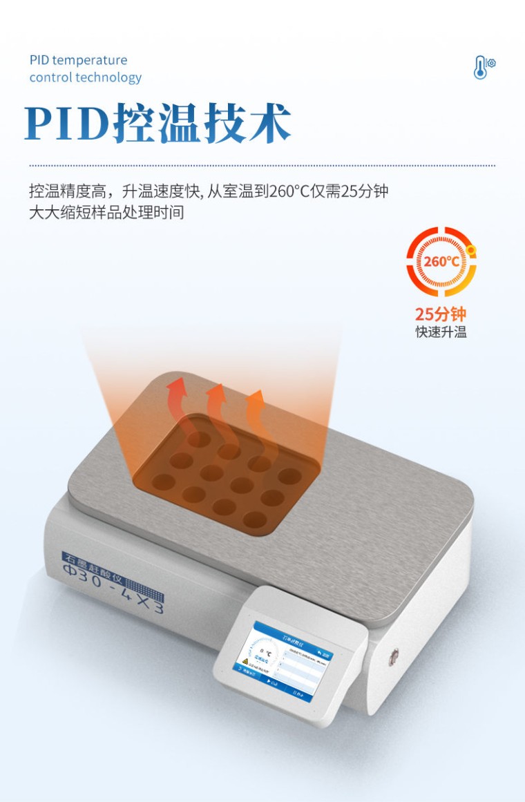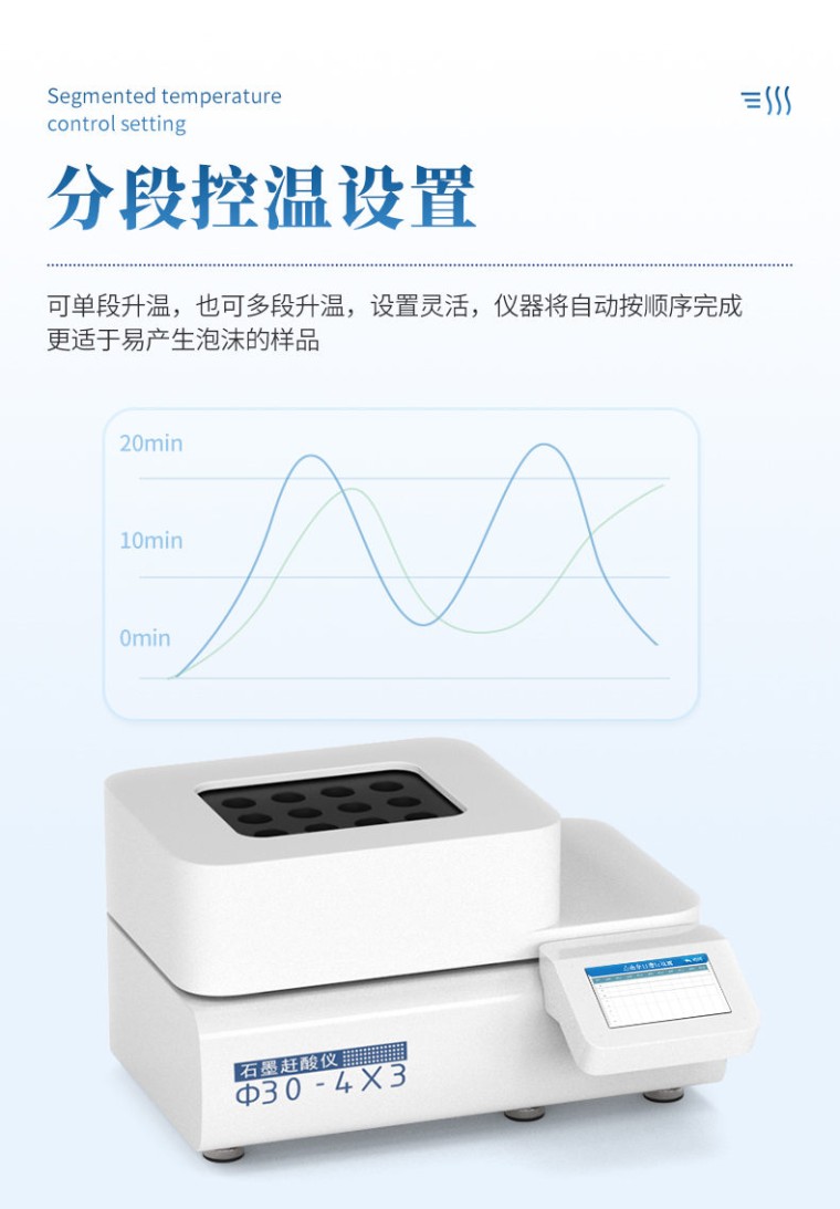 石墨赶酸仪,具有快速、高效、便捷等优点,适用于食品、药品、质检、环保、疾控、化工、高校等行业样品的处理。可用于微波消解的预处理和赶酸处理,是原子吸收、原子荧光、ICP-AES等分析仪器的理想配套产品,更适合与微波消解仪配套使用。 产品特点 使用5寸彩色触摸屏进行仪器操作,配备安卓操作系统,方便快捷。 采用PID 控温技术,控温精度高,升温速度快, 从室温到260℃仅需25分钟。 分段控温设置,即可单段升温,也可多段升温,设置灵活,仪器将自动按顺序完成。更适于易产生泡沫的样品。 采用优质石墨炉内芯,平均温差较小,样品效果一致性好,热传导效率更高。石墨块具有特氟龙涂层,耐腐蚀,延长使用寿命。 技术参数 石墨炉孔:孔径30mm,孔深160mm,孔数3×2 控温范围:室温~260℃ 控温精度:±1℃ 控温分段:1~5段 加热方式:石英加热管红外传递 屏幕规格:5寸触控 主机外型尺寸:宽432mm×深371mm×高168mm 使用电源:AC220V、 (50 ± 1)Hz 额定功率:1.2千瓦