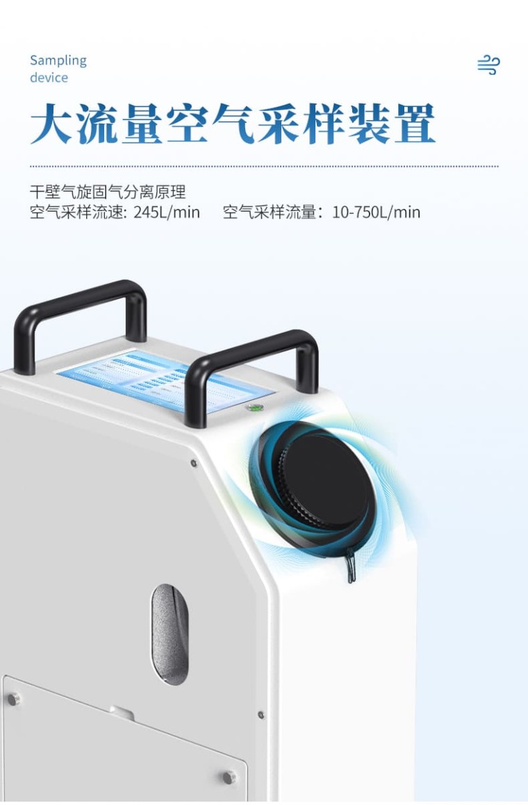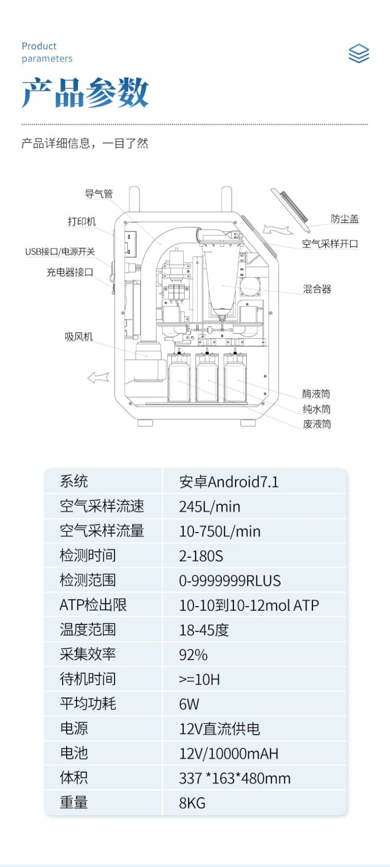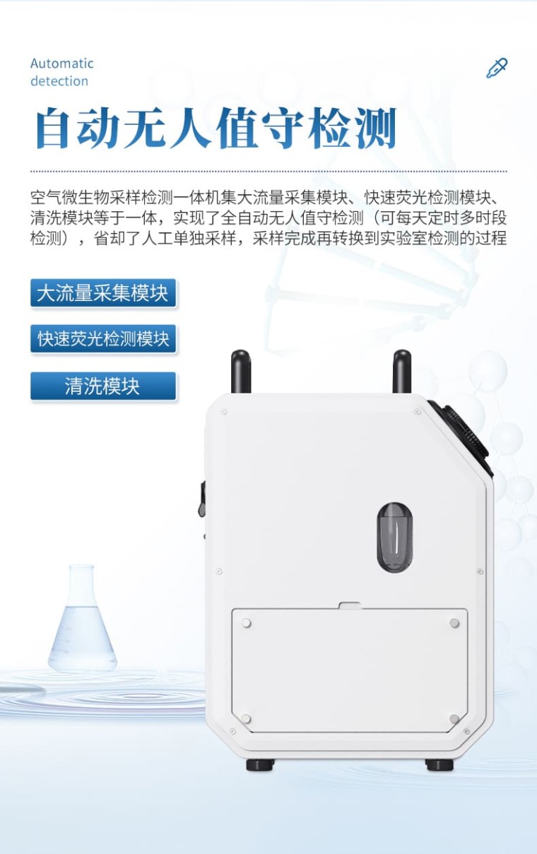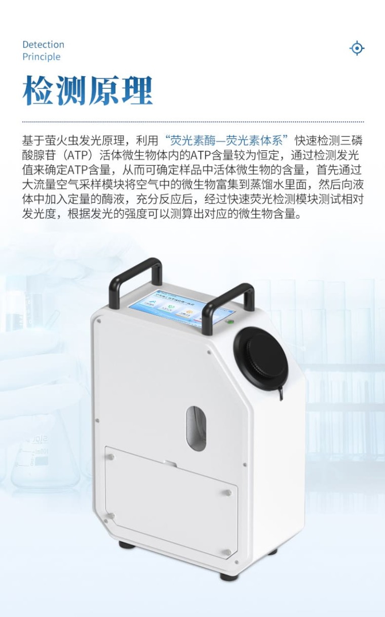 微生物气溶胶检测仪可用于生物应急突发事件现场快速采样检测;还可广泛用于疾病预防控制、环境保护、制药、发酵工业、食品工业、生物洁净以及公共场所等环境的空气浮游菌采样检测,也可用于有关教学、科研等机构进行空气中微生物采样检测。 产品优势 1. 空气微生物采样检测一体机集大流量采集模块、快速荧光检测模块、清洗模块等于一体,实现了全自动无人值守检测(可每天定时多时段检测),省却了人工单独采样,采样完成再转换到实验室检测的过程; 2.安卓系统 RAM2G+ROM16G ; 3.大流量空气采样装置(干壁气旋固气分离原理) 4.采用MPPT硅光电倍增管检测器 5.可每天定时多时段检测; 6.检测完自动报讯数据; 7.可wifi联网将数据无线上传至云平台; 8.配置数据管理平台,可进行长短期评估管理分析; 9.交直流两用,可方便长时段监测,也可方便流动检测; 10.可选配4G模块,定位模块 原理 基于萤火虫发光原理,利用“荧光素酶—荧光素体系”快速检测三磷酸腺苷(ATP)活体微生物体内的ATP含量较为恒定,通过检测发光值来确定ATP含量,从而可确定样品中活体微生物的含量,首先通过大流量空气采样模块将空气中的微生物富集到蒸馏水里面,然后向液体中加入定量的酶液,充分反应后,经过快速荧光检测模块测试相对发光度,根据发光的强度可以测算出对应的微生物含量。 产品参数 系 统: 安卓Android7.1 空气采样流速: 245L/min 空气采样流量:10-750L/min 检测时间:2-180S 检测范围:0-9999999RLUs。 ATP检出限:10-10到10-12mol ATP 温度范围: 18-45度 采集效率: 92% 待机时间: >=10H 平均功耗: 6W 电 源: 12V直流供电 电 池:12V/10000mAH 体 积:337 *163*480mm 重 量:8KG