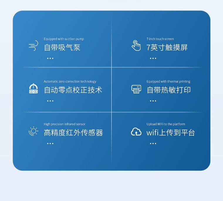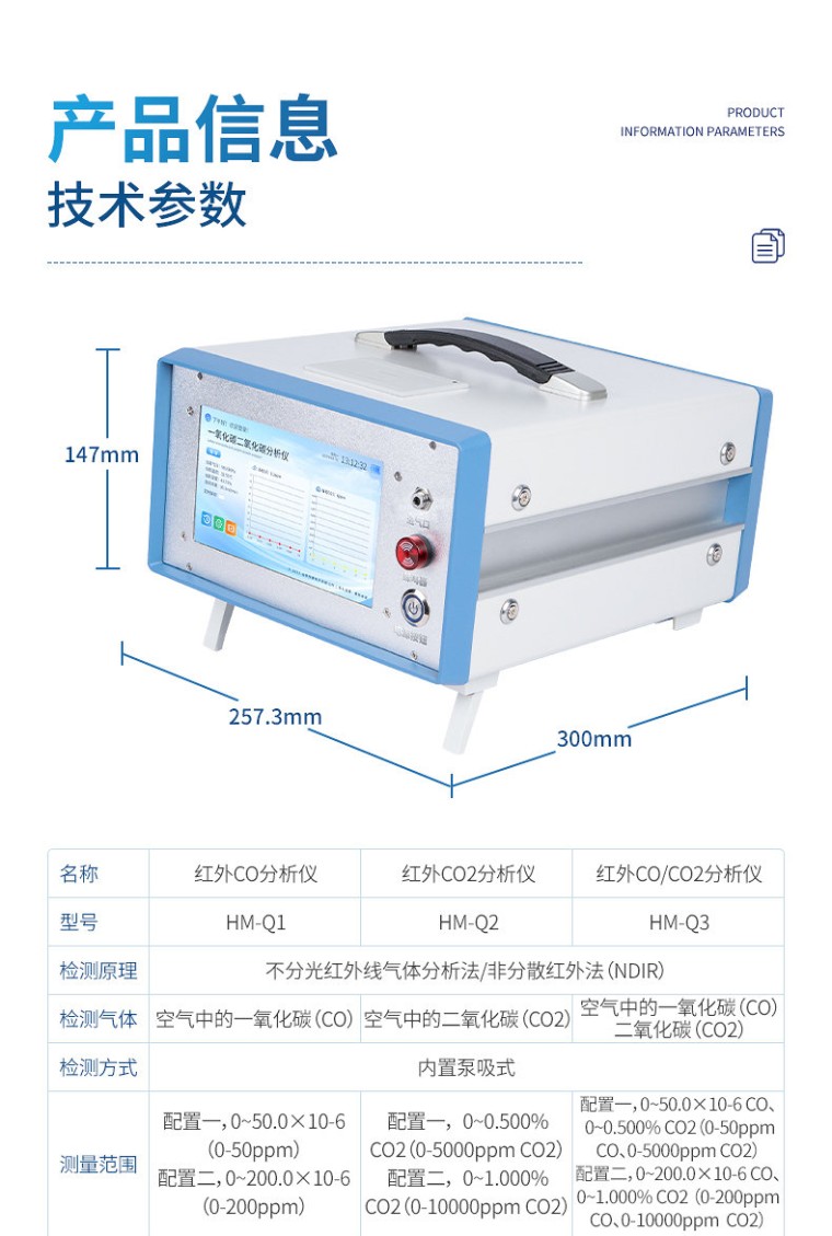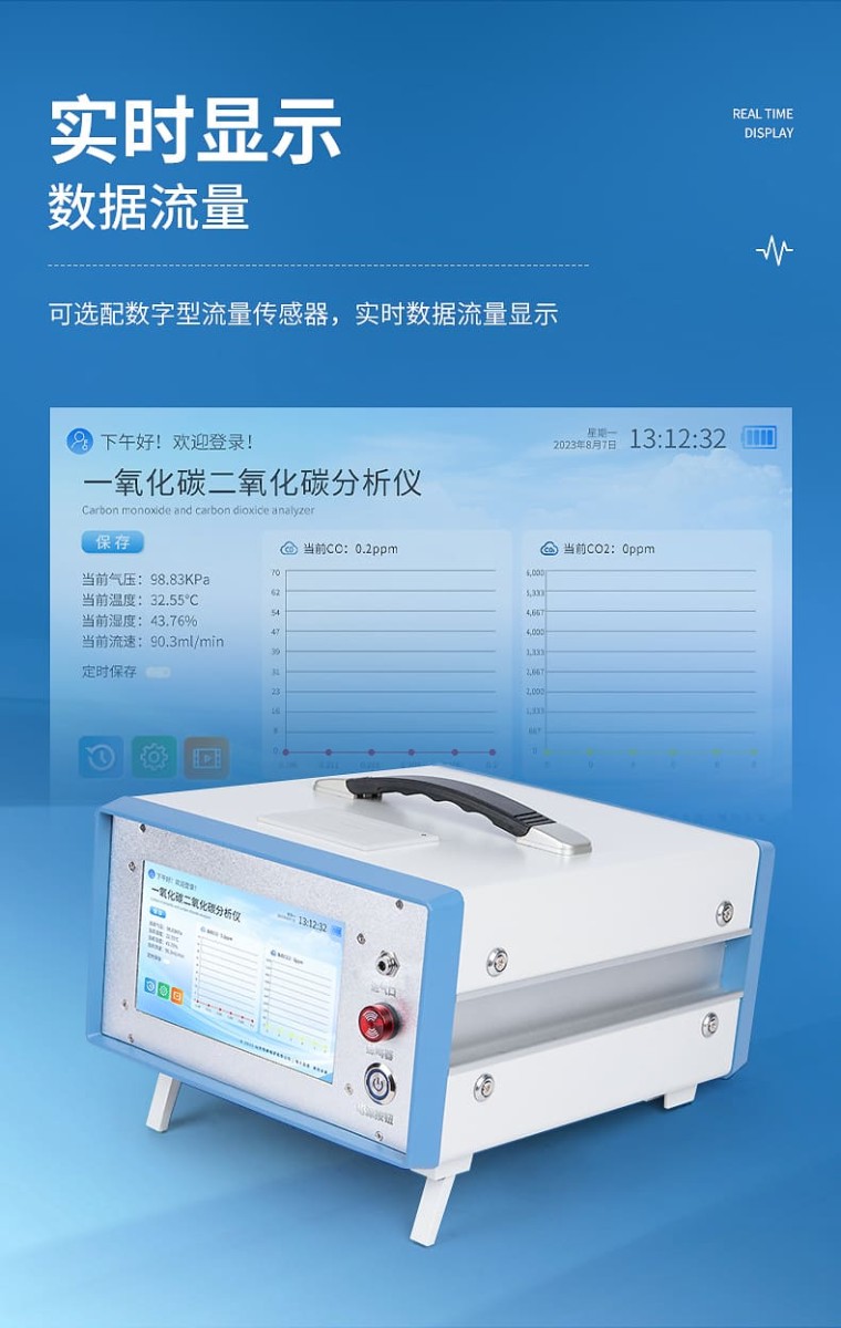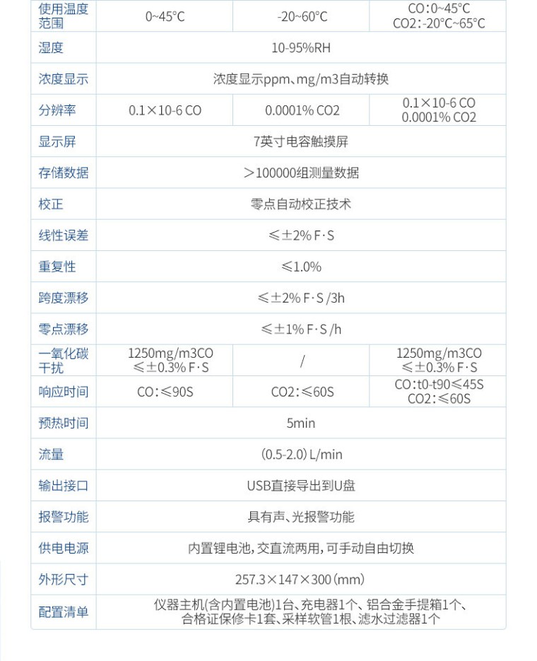 一、产品概述 便携式红外CO/CO2分析仪是我厂针对公共场所的空气中的有毒有害物质进行检查的高精度仪器,仪器采用非扩散红外原理测量空气中的一氧化碳和二氧化碳的浓度,具有测量精度高,使用寿命长,交叉干扰小等优点,是环境监测领域,职业卫生监测领域的必备仪器。 二、适用范围 本仪器被广泛应用于环保、环监、卫生监督、职业卫生、疾病控制和科研院所。 三、采用标准 JJG635-2011《一氧化碳、二氧化碳红外气体分析器》 HJ965-2018《环境空气 一氧化碳的自动测定 非扩散红外法》 GB/T18204.2-2014《公共场所卫生检验方法第2部分:化学污染物》 GB 9801-1988《空气质量一氧化碳的测定非扩散红外法》 GBZ/T 300.37-2017《公共场所空气有毒物质测定第37部分:一氧化碳和二氧化碳》 四、技术特点 1、采用安卓系统,7英寸触摸显示屏,实时人机交互性更好。 2、存储空间大,可存储>100000条数据。 3、自带热敏打印机,检测完成可打印当前数据 4、自带wifi,检测完成,可上传到平台,方便数据监管(可选配4G模块) 5、带有USB数据接口,可以将数据导入U盘。 6、可选配数字型流量传感器,实时数据流量显示 7、采用高精度红外传感器,测量精度高,响应速度快,预热时间短。 8、支持氮气校零和催化校零两种方式。 9、具有机内恒温加热功能,适合户外低温环境运行。 10、内置通路切换电磁阀,调零、测量自动切换。 11、具有温湿度测量功能、内置温湿度补偿修正算法,消除温度变化对测量数据的影响。 五、技术参数: 1、检测原理:不分光红外线气体分析法/非分散红外法(NDIR) 2、检测气体:空气中的一氧化碳(CO)、二氧化碳(CO2) 3、检测方式:内置泵吸式 4、测量范围:0~50.0×10-6CO、0~0.500%CO2 或 0~200.0×10-6CO、0~1.000%CO2 5、温度:-20∽60℃ 6、湿度:10-95%RH 7、浓度显示ppm、mg/m3自动转换 8、CO分辨率:0.1×10-6 CO;0.001% CO2 9、显示屏:7英寸电容触摸屏 10、可存储>100000组测量数据 11、零点自动校正技术 12、线性误差:≤±2% F·S 13、重 复 性:≤1.0% 14、跨度漂移:≤±2% F·S /3h 15、零点漂移:≤±2% F·S /h 16、一氧化碳干扰:1250mg/m3CO≤±0.3% F·S 17、响应时间:CO:≤90S;CO2:≤60S 18、预热时间:5min 19、流 量:(0.5-2.0)L/min 20、输出接口:USB直接导出到U盘 21、具有声、光报警功能 22、供电电源:内置锂电池,交直流两用,可手动自由切换 23、外形尺寸:257.3*147*300(mm)