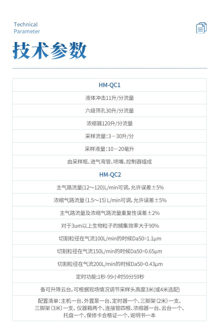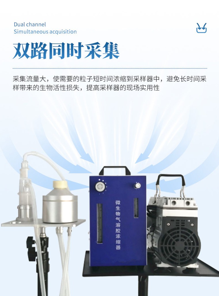 概述 微生物气溶胶浓缩器是基于安德森撞击原理研制,微生物气溶胶浓缩器分为两部分,撞击仓和收集仓。撞击仓由冲击板和接收板组成。 本产品符合标准《GB/T 18204.5-2013 公共场所卫生检验方法 第5部分:集中空调通风系统》和卫生行业标准《WS 394-2012 公共场所集中空调通风系统卫生规范》要求,采集集中空调送风,检测其中的嗜肺军团菌。采集流量大,使需要的粒子短时间浓缩到采样器中,避免长时间采样带来的生物活性损失,提高采样器的现场实用性。 主要技术指标 l 主气路流量(12~120)L/min可调,允许误差±5%; l 浓缩气路流量(1.5~15)L/min可调,允许误差±5%; l 主气路流量及浓缩气路流量重复性误差±2% l 对于3um以上生物粒子的捕集效率大于90%。 l 切割粒径在气流100L/min的时候Da50=1.1μm, l 切割粒径在气流150L/min的时候Da50=0.65μm l 切割粒径在气流200L/min的时候Da50=0.43μm。 l 定时功能:1秒-99小时59分59秒 l 双路同时采集 l 流量手动调节 l 备可升降云台,可根据现场情况调节采样头高度3米(或4米选配) 高端配件: 美国SKC液体冲击式微生物气溶胶采样器 技术参数 高效率玻璃冲击瓶捕集装置的特殊设计,它需要一台高流量音速的空气采样帮浦, 用来捕集空气中微生物(如细菌、真菌、花粉、病毒)与其副产物如内毒素、霉菌毒素及其他碎片,以供进一步分析。 液体冲击式微生物气溶胶采样器有三个切线式弯度的喷嘴头,具决定性的或音速(sonic flow)的小孔,每孔允许4.2公升/分钟的空气通过共同组成的流量,达到约12.5公升/分钟的流速。容许有效捕集总生物气胶或活生物气胶有效时间达8小时以上 。 配置清单 主机 一台 外置泵 一台 定时器 一个 三脚架(2米) 一支 三脚架(3米) 一支 仪器箱 两个 连接管 四根 浓缩器 一台 云台 一个 托盘 一个 保修卡合格证 一个 说明书 一本