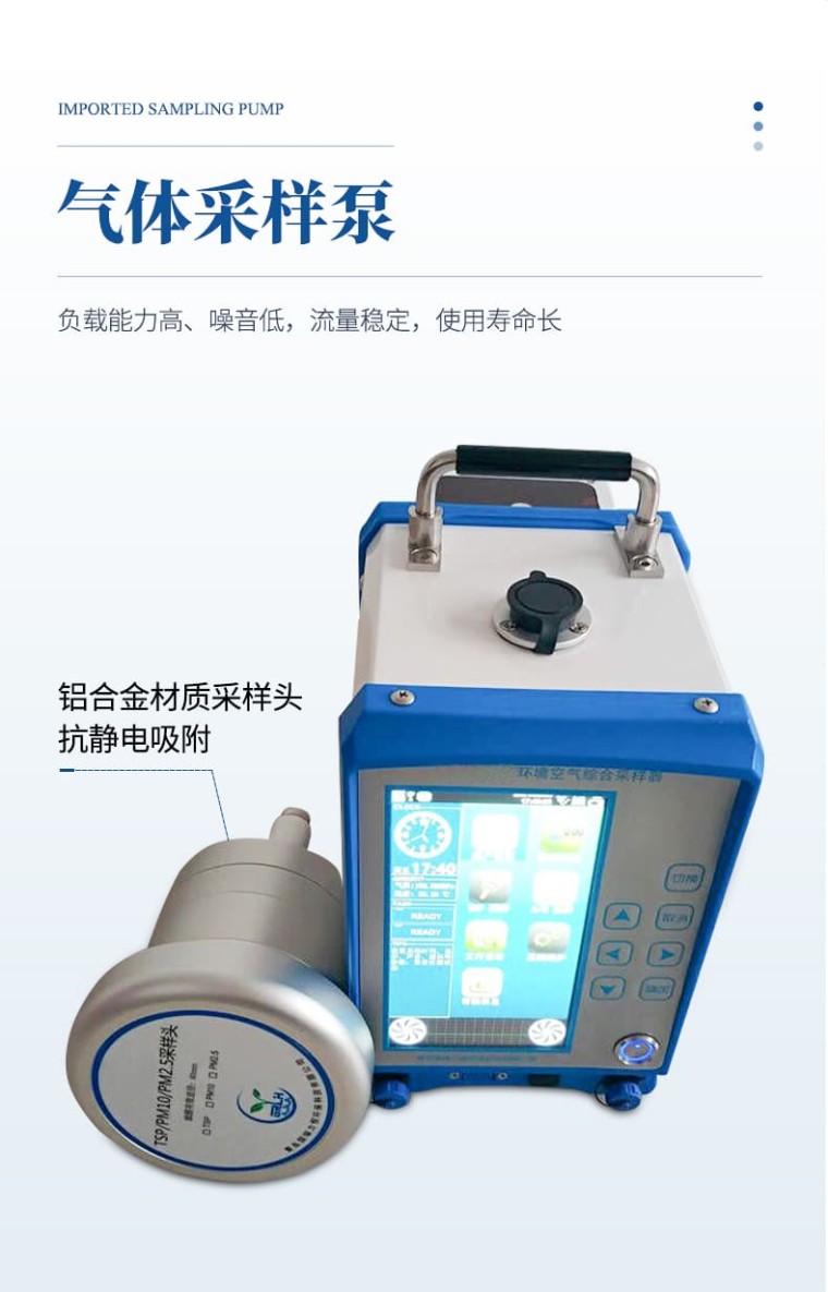 产品概述 HM-H7型环境空气颗粒物综合采样器是用于捕集大气中的颗粒物(TSP、PM10、PM2.5等)和各种气体组分(SO2、NOx等)样品的必备仪器。该采样器研制过程中广泛征求了专家及广大用户的意见,应用了当前计算机、传感器及新材料等领域的高新技术,质量可靠、性能稳定、使用寿命长。 适用范围 采样器应用溶液吸收法采集环境大气、室内空气中的各种有害气体;采用滤膜称重法捕集环境大气中的总悬浮微粒(TSP)和可吸入微粒(PM10)或(PM2.5)、氟化物、重金属、SVOC等。可供环保、卫生、劳动、安监、军事、科研、教育等部门用于气态物质和气溶胶的常规及应急监测。 采用标准 HJ 618-2011 《环境空气PM10和PM2.5的测定 重量法》 HJ 656-2013 《环境空气颗粒物(PM2.5)手工监测方法(重量法)技术规范》 HJ 93-2013 《环境空气颗粒物(PM10和PM2.5)采样器技术要求及检测方法》 HJ/T 374-2007 《总悬浮颗粒物采样器技术要求及检测方法》 HJ/T 375-2007 《环境空气采样器技术要求及检测方法》 HJ/T 376-2007 《24小时恒温自动连续环境空气采样器技术要求及检测方法》 JJG 956-2013 《大气采样器》 JJG 943-1998 《总悬浮颗粒物采样器》 HJ 955-2018 《环境空气氟化物的测定 滤膜采样/氟离子选择电极法》 HJ 657-2013 《空气和废气 颗粒物中铅等金属元素的测定电感耦合等离子体质》 技术特点 1) 一机多用,两路恒温恒流大气采样,一路TSP采样,独立控制、配置灵活; 2) 采用高负压进口风机,100L/min时负载能力大于20kPa; 3) 采用7.0寸宽温高亮彩色触摸显示屏,阳光下清晰可见、界面美观、操作方便; 4) 按键、触摸双操作模式,适应多种用户的操作习惯; 5) 海量数据存储,数据存储量大于100000组; 6) 颗粒物采样流量可设置,选配合相应的采样头使用可用于氟化物、重金属、SVOS等的采样; 7) 选用进口采样泵,负载能力高、噪音低,流量稳定,使用寿命长; 8) 自动测量温度、气压,自动计算标况采样体积; 9) 体积小、重量轻,携带方便; 10) 采样过程中断电数据自动保护,来电后继续采样; 11) 双数据输出模式,可蓝牙打印或可U盘导出; 12) 铝合金材质采样头,抗静电吸附; 13) 整机采用优异的防尘、防水设计,可以保证在雨雪天气正常工作; 14) 整机考虑电磁兼容性设计,具有较强的抗干扰、抗辐射能力。
