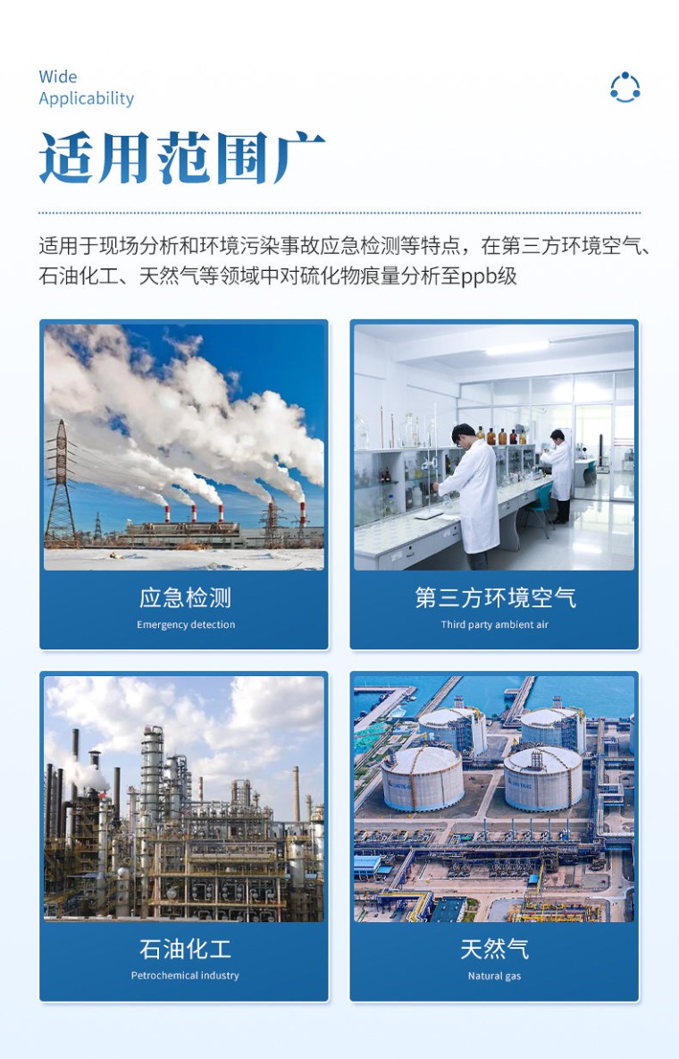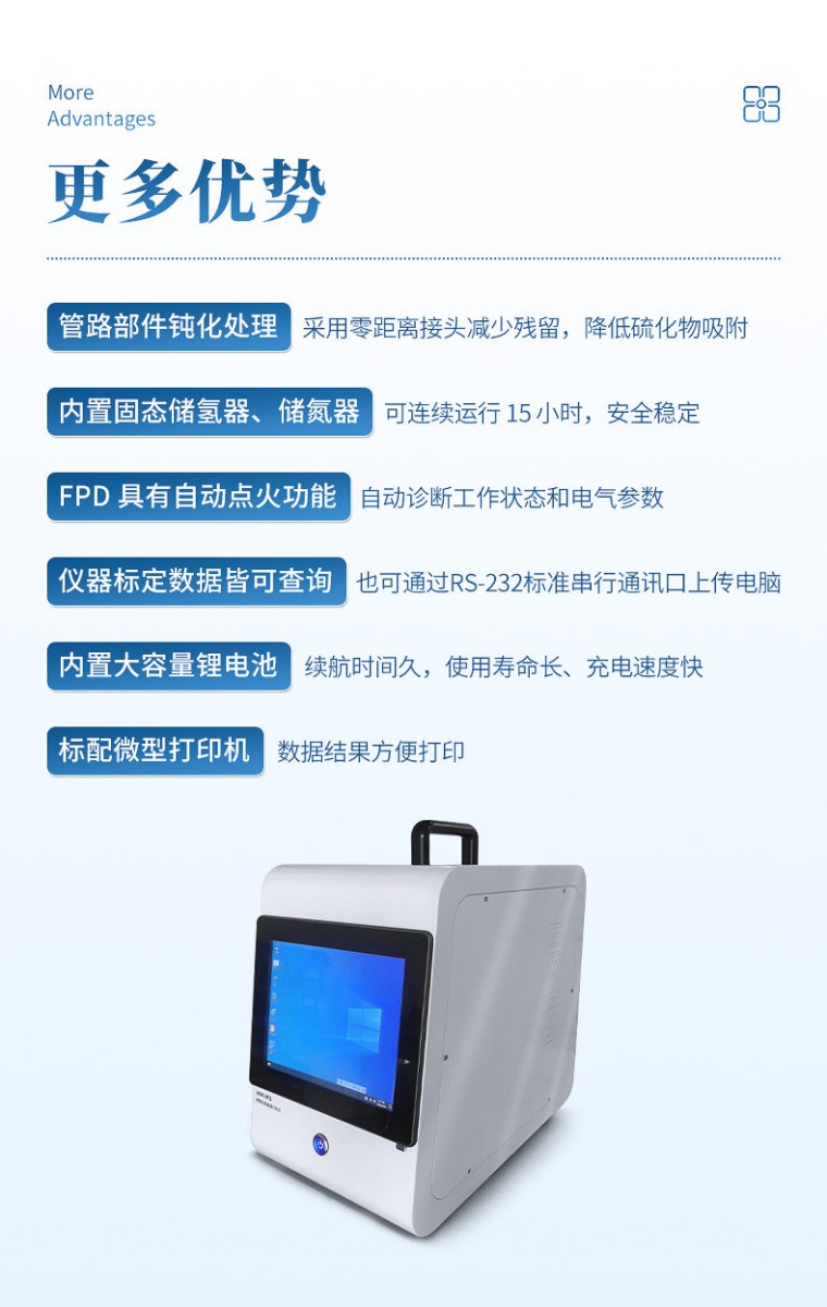 便携式微量硫分析仪,集成电路高、分析速度快、机动灵活,尤其 适用于现场分析和环境污染事故应急检测等特点,在第三方环境空气、石油化 工天然气等领域中对硫化物痕量分析至 ppb 级。体积小,重量轻、易携带。 工作原理: 首先采集待测样气进入便携式气相色谱仪,样品气经高惰性定量环定量,通 过阀切换进入色谱柱分离,硫化氢、羰基硫等成分依次到达火焰光度检测器 (FPD)检测,分别测定各组分浓度。最后由内置处理器计算得出准确的数值。 主要性能特点: 1、 采用 10 寸高清触摸屏电脑,内置软件数据处理反控工作站 2、 配备耐高温气动阀微气路切割技术、高灵敏度微量硫检测器 3、采用 EPC 技术数字化控制、高精度电子压力/流量控制 4、管路部件钝化处理,采用***接头减少残留,降低硫化物吸附 5、内置固态储氢器、储氮器,可连续运行 15 小时,安全稳定 6. FPD 具有自动点火功能, 自动诊断工作状态和电气参数 7、仪器标定数据皆可查询,也可通过 RS-232 标准串行通讯口上传到电脑 8、内置大容量锂电池,续航时间久,使用寿命长、充电速度快 9、标配微型打印机,数据结果方便打印 10、外机尺寸 400×270×350mm 重量<20KG 检测限标准: .测量精度:10 ppb(硫化氢计) .动态线性范围:>105 .基线漂移(30min) ≤0.2pA .基线噪声≤0.02pA .预热时间:约 30 分钟 .工作环境温度:(5-45) ℃ , 湿度:(20%-90%)RH .燃气:氢气消耗量 35ml/min .助燃气:空气消耗量 350ml/min .电源:AC220V 50Hz 500W, 自动切换内置供电 24V