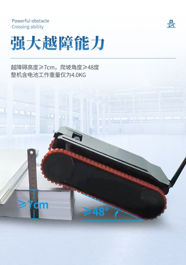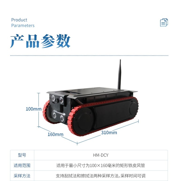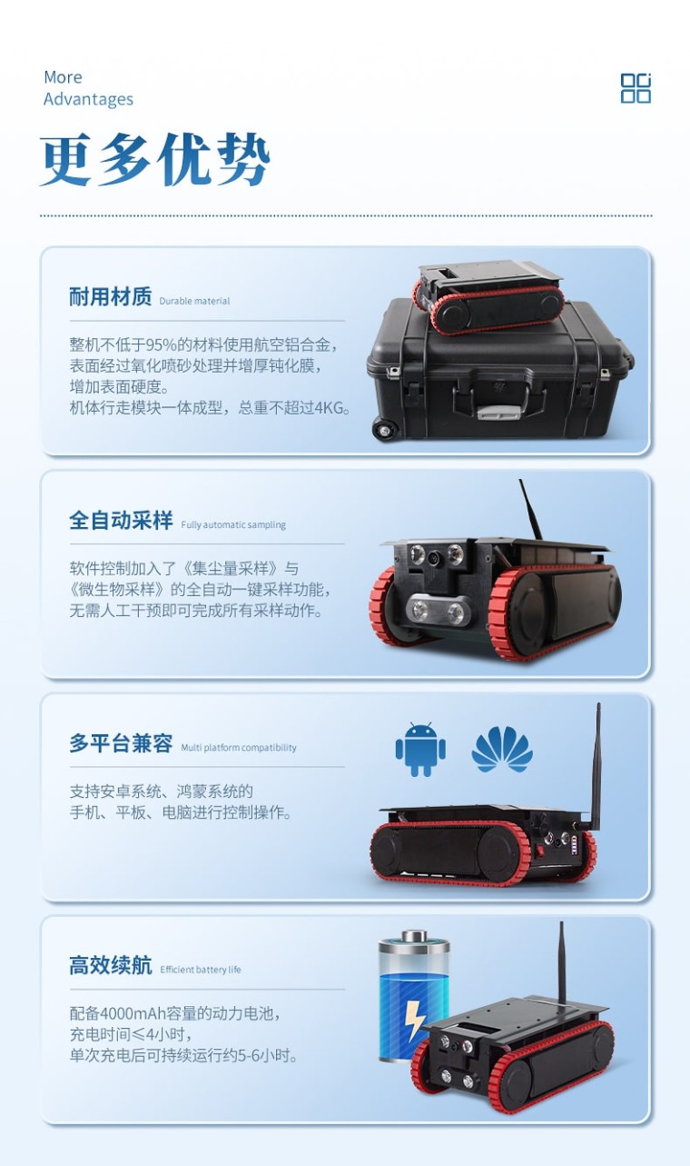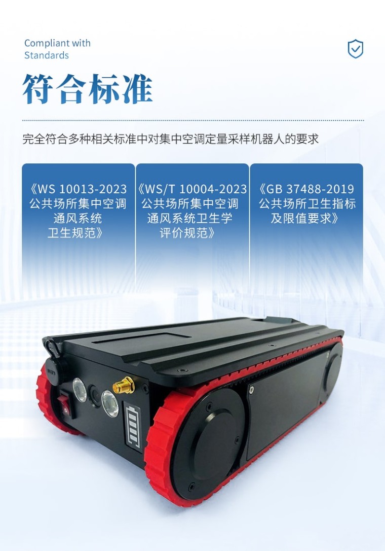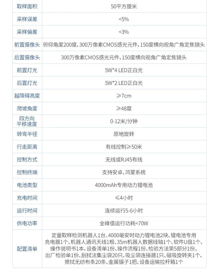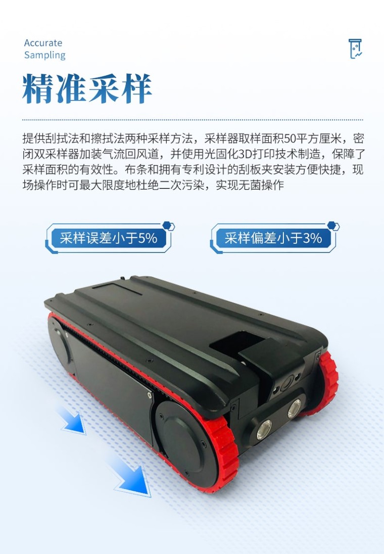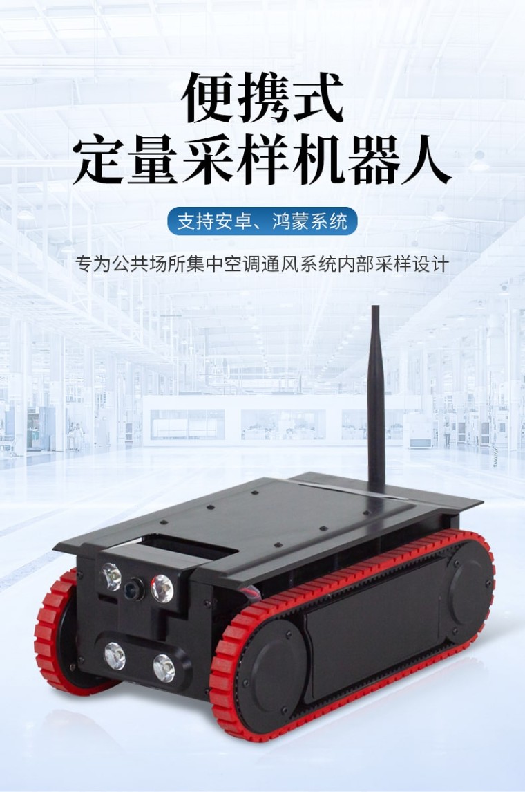 一、产品简介 便携式定量采样机器人是一款专为公共场所集中空调通风系统内部采样设计的高精度、便携式智能设备。该产品严格按照《WS 10013-2023公共场所集中空调通风系统卫生规范》、《WS/T 10004-2023公共场所集中空调通风系统卫生学评价规范》以及《GB 37488-2019公共场所卫生指标及限值要求》中的相关标准进行设计与制造,确保了其在各种工业环境下的稳定性和可靠性。它采用了先进的航空铝合金材料,结合了高效的移动性能与**的采样技术,能够满足多种行业的通风管道检测和维护工作需求。 二、产品特点 合规性:完全符合《WS 10013-2023》、《WS/T 10004-2023》及《GB 37488-2019》中对集中空调定量采样机器人的要求。 紧凑设计:尺寸长宽高310mm * 160mm * 100mm,可进入最小尺寸为100×160毫米的矩形铁皮风管内部进行采样。 精准采样:提供刮拭法和擦拭法两种采样方法,采样器取样面积50平方厘米,密闭双采样器加装气流回风道,并使用光固化3D打印技术制造,保障了采样面积的有效性。布条和拥有专利设计的刮板夹安装方便快捷,现场操作时可最大限度地杜绝二次污染,实现无菌操作。采样误差小于5%,采样偏差小于3%。 全方位视野:前置摄像头俯仰角度达200度,前后均采用150度广角定焦摄像头,提供无死角视野。 灵活控制:支持无线与有线两种控制方式,有线控制距离≥50米,无线控制无距离限制。视频采集、拍照及机器人控制均由终端完成。 强大越障能力:越障碍高度≥7cm,爬坡角度≥48度,整机含电池工作重量仅为4.0KG。 全自动采样:软件控制加入了《集尘量采样》与《微生物采样》的全自动一键采样功能,无需人工干预即可完成所有采样动作。 耐用材质:整机不低于95%的材料使用航空铝合金,表面经过氧化喷砂处理并增厚钝化膜,增加表面硬度。机体行走模块一体成型,总重不超过4KG。 多平台兼容:支持安卓系统、鸿蒙系统的手机、平板、电脑进行控制操作。 高效续航:配备4000mAh容量的动力电池,充电时间≤4小时,单次充电后可持续运行约5-6小时。 三、产品参数: 尺寸规格:310mm * 160mm * 100mm; 适用范围:适用于最小尺寸为100×160毫米的矩形铁皮风管; 采样方法:支持刮拭法和擦拭法两种采样方法,采样时间可调; 取样面积:50平方厘米; 采样误差:<5%; 采样偏差:<3%; 前置摄像头:俯仰角度200度,300万像素CMOS感光元件,150度横向视角广角定焦镜头; 后置摄像头:300万像素CMOS感光元件,150度横向视角广角定焦镜头; 前置灯光:5W*4 LED正白光; 后置灯光:5W*2 LED正白光; 越障碍高度:≥7cm; 爬坡角度:≥48度; 四方向平移速度:0-12米/分钟; 转弯半径:原地旋转; 行走距离:有线控制≥50米; 控制方式:无线或RJ45有线; 控制终端:支持安卓、鸿蒙系统; 电池类型:4000mAh专用动力锂电池; 充电时间:≤4小时; 连续运行时间:5-6小时; 供电功率:全峰值运行功耗<70W;