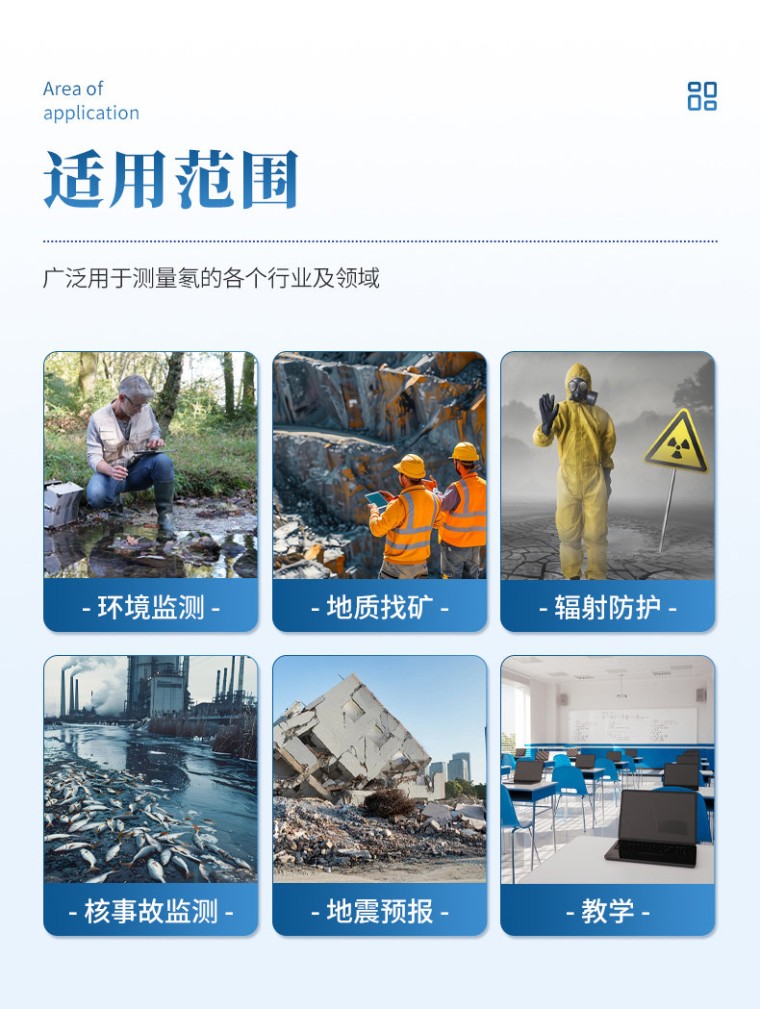 技术参数: 1、基于安卓系统的智能化测试平台,全触控操作,支持手写、拼音等各种中英文输入方式; 2、支持WIFI、有线网络、USB、蓝牙等各种连接方式; 3、软开关机,低电压报警,电池信息,电池保护,无操作省电及自动关机; 4、操作、测量提示文字及声音信息; 5、灵敏度:≥ 0.6cpm/[Bq•m-3]; 6、本底计数率:≤0.3cpm; 7、测量范围 空气氡(单次/连续):(3~100000)Bq/ m³ 土壤氡:(300~1000000)Bq/ m³ 氡析出率(选装):(0.001~10.000)Bq/[m2•s] 水中氡(选装):(0.003~1000)Bq/L 8、电源:锂离子充电电池/交流电; 9、工作环境 温度:-10℃~40℃ 湿度:相对湿度≤90%; 10、探测器:硫化锌ZnS(Ag)和光电倍增管组合系统; 11、数据存储:可存储大于40000个数据; 12、操作模式:点测和连续监测; 13、显示器:5寸彩色LCD液晶显示,亮度420 (TYP)(流明),对比度500:1,电容式, 5 点触控操作; 14、取气方式:主动泵吸式; 15、响应时间:典型条件下,空气氡测量20min; 16、打印数据:任务名称地址备注信息、日期、时间、点号和氡浓度; 17、尺寸:260mm × 170mm × 130mm 18、重量:4㎏(主机) 配置: 1、测氡仪主机一台 2、充电器1个 3、合格证1份 4、装箱单1份 5、检定证书1份 6、土壤采样系统1套 7、蓝牙打印机1台