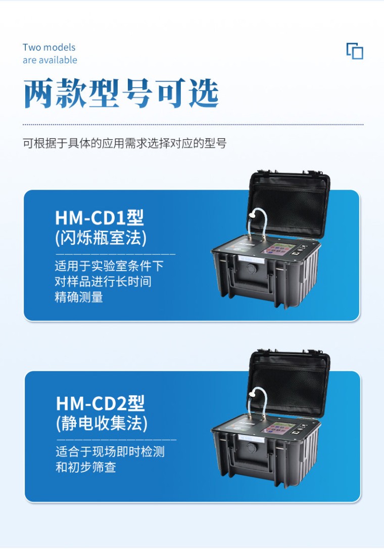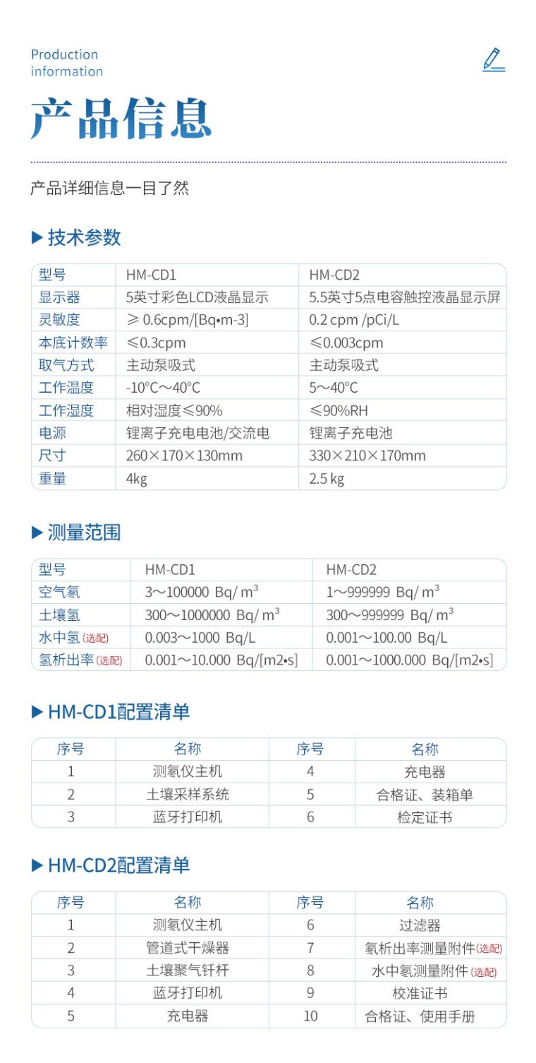 应用领域 环境空气、土壤、水等氡体积活度及土壤、建材等表面氡析出率的测量。可用于环境监测、地质找矿、辐射防护、核事故监测、辐射剂量评价、地震预报及教学等。 仪器符合: GB 50325-2020《民用建筑工程室内环境污染控制标准》静电收集-半导体传感器-α能谱分析法 GB/T 14582-93《环境空气中氡的标准测量方法》 T/CECS 569-2019《建筑室内空气中氡检测方法标准》的测量原理和要求。 仪器特点 精致、轻巧 、便携: 外型尺寸(275x220x167)mm,重量2.5kg。 先进、准确、可靠: HM-CD2土壤测氡仪为静电收集-半导体传感器-α能谱分析法氡测量仪。通过泵吸将被测量气体(空气)吸入静电收集室内,在静电收集室内通过高压电场将222Rn的**代衰变产物RaA(218Po)吸附于半导体α射线传感器的表面(阴极),通过能谱分析,测量RaA的α粒子线计数率,定量测量222Rn的体积活度。 采用222Rn的短半衰期子体(218Po半衰期为3分钟)的α粒子的能谱测量,可能有效解决土壤氡测量过程中钍射气干扰,同时,由于被测量的子体半衰期短,在进行高活度(例如土壤氡)测量时,探测器能的较短时间内)恢复到低本底状态。 内置气候传感器,可精确测量静电室内气体温度、温度、大气压强,用于指示干燥器状态,气体体积修正及温度-吸附率修正。 智能、易用: HM-CD2土壤测氡仪采用基于ARM处理器与Android4.4系统的智能触控平台完成数据获取、处理、显示打印等,这使得PRn700系列土壤测氡仪具有图像、声音、有线无线网络、触控感应等多种直观友好的人机交互模式。 基于ARM处理器与Android4.4操作系统构成的计算机平台拥有强大的数据处理能力,WIFI、蓝牙、USB(HOSTDEVICE模式)、RJ45、RS232等丰富的数据连接模式,支持用户更新软件。 智能背光、无任务自动关机、关键操作确认等符合主流智能触控设备操作模式的软件设计,产品易操控,使用者经过短时简单的摸索即可正确操作作用本设备。 手持式蓝牙打印机,自粘贴式报告标签。一键打印,一撕一粘即可完成数据的保存 。主机即可为打印机提供充电服务,免去野外打印机无处充电的尴尬! 配套、功能齐全: 配备有各种专业附件,用于土壤、建材、水等氡活度测量。 成熟可靠的技术方案、高度集成化的平台、成熟的软件环境,因此、设备结构紧凑性能更可靠 仪器主要技术指标: 1、 静电室:容积700ml,静电场高压2500~3000V; 2、 探测器:半导体平面硅探测器,有效探测器面积572mm2;α粒子能量测量范围为0~10(MeV),能量分辨率37KeV(FWHM); 3、 本底计数率:≤0.003cpm ; 4、 探测灵敏度:0.2 cpm /pCi/L; 5、 探测下限:≤1Bq/m3(120min ,2σ); 6、 测量范围:0.1~25000pCi/L (3.7Bq/m3~925000Bq/m3); 7、 测量不确定度:≤10%(k= 2); 测量范围: 空气氡:(1~999999)Bq/ m³; 土壤氡:(300~999999)Bq/ m³; 水中氡:(0.001~100.00)Bq/L; 氡析出率:(0.001~1000.000)Bq/[m2•s] ; 8、 体积活度响应年偏移量:≤±20%; 9、 相对固有误差:≤±20%; 10、 电源:锂离子充电池:11.1V、5400mA/h。充电器输入:AC(110~240)V、输出:12.6V/2A; 11、 工作环境温度:(5~40)℃ 湿度:≤90%RH; 12、 显示器:5.5寸5点电容触控液晶显示屏; 13、 取气方式:主动泵吸式,泵气速率:2L/min(无真空负载); 14、 测量时间(典型条件下):空气氡:20-120min 、土壤氡:9-17min 、氡析出率:60-300 min (不含集气收集时间); 15、 尺寸:(330 × 210 × 170)mm ; 16、 重量:2.5 ㎏(含设备防护箱、过滤器、充电器); 17、气候传感器:温度:测量范围(0~50℃),精度±0.5℃;压力:测量范围(300~1100) 注:上述参数仅为一般性参数,具体到某一台设备时可能会有特殊要求,请以合同或招投标文件表述为准= 仪器配置: 1、土壤测氡仪主机一台; 2、管道式干燥器一只; 3、充电器一只; 4、过滤器一只; 5、土壤聚气钎杆一套(打孔取气各一根); 6、便携式蓝牙打印机一台; 7、氡析出率测量附件一套(选配); 8、水中氡测量附件一套(选配); 9、仪器校准证书一份; 10、检验合格证一份; 11、用户使用手册一份;