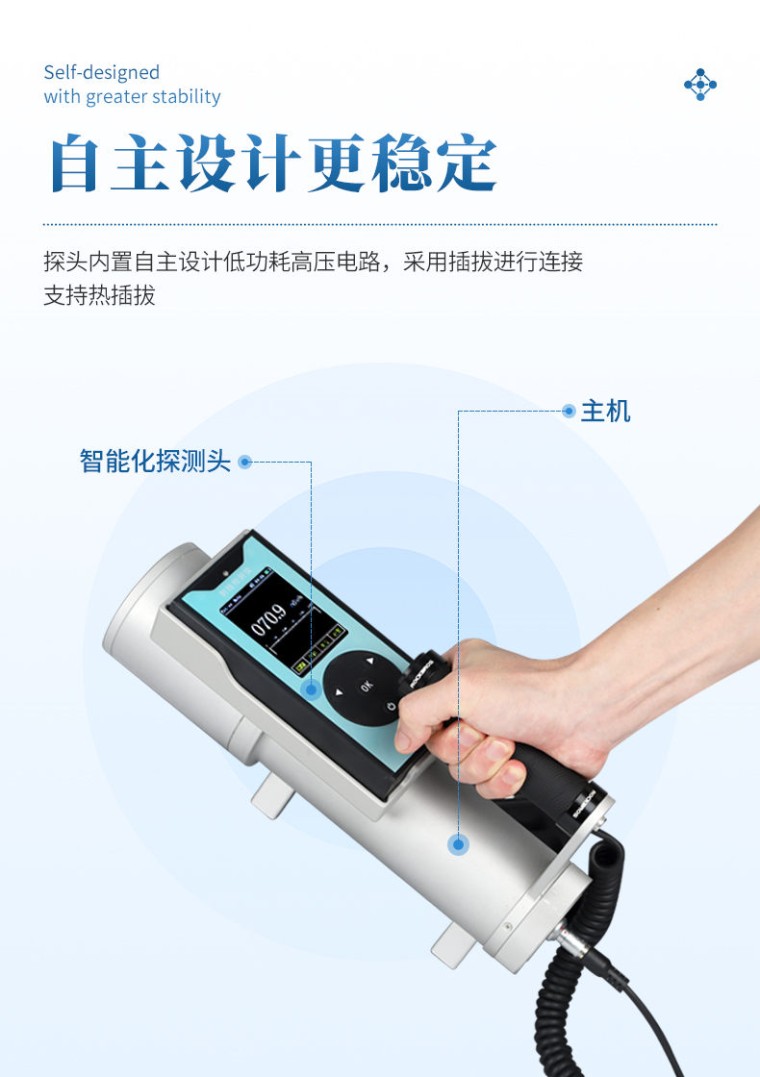 一、产品简介: 核辐射检测仪,用于环境水平x、γ剂量率测量,也可对辐射场所辐射防护水平进行检测,应急场合查找隐藏的放射源。是环保、卫生、出入境以及其他涉及到电离辐射安全监测企事业单位的理想产品。 该智能探头选用塑料闪烁体测量γ辐射剂量率,通过多功能辐射测量仪主机进行数据处理,接口为主机的标准接口,采用RS-485通讯。探头内置自主设计低功耗高压电路,采用插拔进行连接、支持热插拔。主机能自动识别探头,简单易操作。 高灵敏度x、γ环境级空气比释动能率仪主要由主机、智能化探测头两部分组成。还可以根据需要外接多种智能探头,主机可自动或手动保存和查询检测数据。 符合标准:HJ 1157-2021《环境γ辐射剂量率测量技术规范》。 二、应用领域: 1、搜寻放射源; 2、工作场所环境本底剂量监测、现场剂量率快速测量; 3、医院核医学科、影像科环境剂量探测; 4、CT、DR等影像设备短时脉冲辐射监测; 5、疾控与卫生监督机构执法能力建设; 6、检查局部微弱放射性辐射泄露和核辐射污染; 7、应急消防环境辐射探测; 8、核应急场所辐射监测及应急响应等级区分; 9、工业X、γ无损探伤工作边界区域划分; 10、第三方检测公司环境测评、卫生评价; 11、废弃金属处理厂、矿场、油田等。 三、技术指标: 探测器:主机:GM管;探头:Φ75×82mm复合闪烁体(ZnS(Ag)+塑料闪烁体); 测量类型:X、γ、脉冲辐射; 显示屏:3.2寸彩色液晶,分辨率320×240,带背光; 测量模式:正常、脉冲、搜寻、峰值、专家; 灵敏度:≥2000cps(137Cs,1μGy/h); 能量范围:20keV ~ 7MeV; 能量响应:吸收剂量:≤±15% 剂量当量:≤±30%; 测量范围:吸收剂量率:10nGy/h ~ 100mGy/h (环境级); 当量率:10nSv/h ~ 100mSv/h (防护级); 最小脉冲测量时间:40ns; 最快响应时间:10ms; 角响应:≤±15%(0 ~ 180°); 相对固有误差:≤±10%(137Cs); 重复性:≤1%; 涨落误差:≤1%; 过载特性:剂量当量率高于10倍测量上限时,仪器不损坏; 显示单位:nSv/h ,nGy/h,μGy/h,μSv/h,CPS,CPM; 报警方式:声、光报警; 报警类别:阈值、过载、故障、电池欠压; 报警阈值:测量范围内连续可调; 数据存储:可存储20000组数据; 数据处理:具有数据导出功能(格式包括.csv、.xls); 通讯接口:电脑接口:USB 2.0,主机和探头:RS-485/蓝牙(可选); 供 电:整机由主机供电,主机内置充电锂电池; 功 耗:整机耗电≤200mW(不含显示器背光耗电); 工作时间:与主机共同使用,关闭蜂鸣器和背光灯状态下可持续工作24小时以上; 尺 寸:Φ90×330mm (探头)、170×80×30mm(主机); 重 量:2.85kg(整机); 四、环境特性 工作温度:-41℃ ~ +50 ℃ 符合GJB 150.3A-2009、GJB 150.4A-2009高低温试验要求; 贮存温度:-41℃ ~ +50℃ 符合GJB 150.3A-2009、GJB 150.4A-2009高低温试验要求; 相对湿度:≤90% (35℃) 符合GJB 150.9A-2009交变湿热试验要求; 电磁兼容:符合GJB 151B-2013《军用设备和分系统电磁发射和敏感度要求与测量》中RE102、RS103、CS112、RS101的要求; 淋 雨:符合GJB 150.8A-2009淋雨试验要求; 振 动:符合GJB 150.16A-2009振动试验要求; 冲 击:符合GJB 150.18A-2009冲击试验要求; 防护等级:IP65;