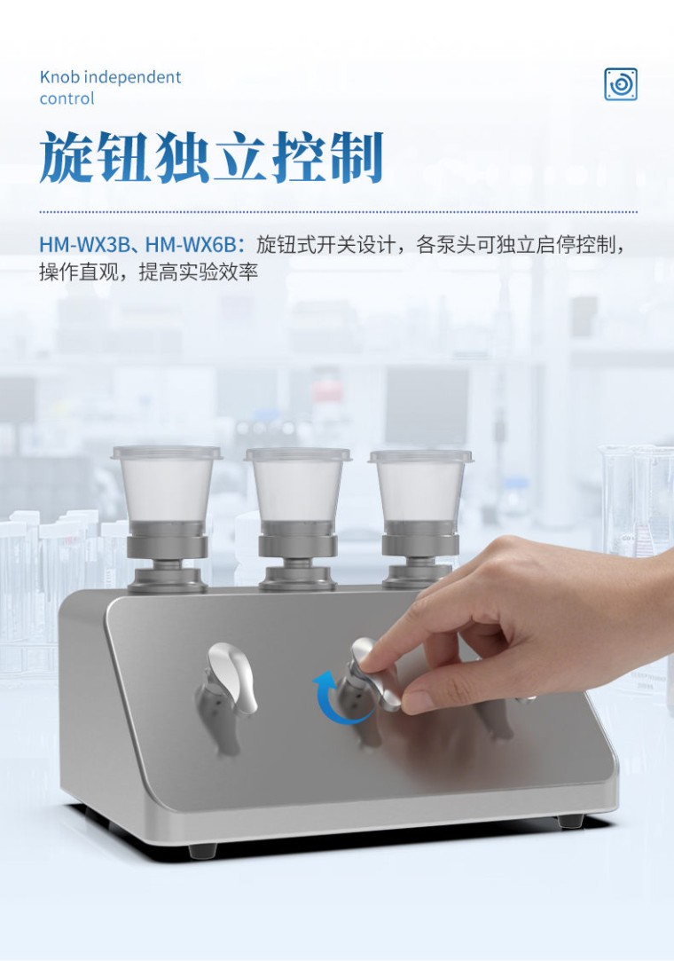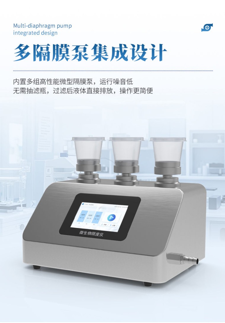 微生物抽滤装置是依据《中国药典》及相关行业标准设计制造的专用微生物检测设备。该设备通过负压抽滤方式将供试液中的微生物截留于滤膜上,经培养后形成可见菌落,并通过计数准确测定样品中的含菌量。适用于药品、食品、化妆品、化工等行业的微生物限度检查。 适用范围: 制药行业:适用于制药用水(纯化水、注射用水)、液体原料及非规定灭菌制剂药品的微生物限度检验。 医疗器械行业:适用于医疗器械生产用水(纯化水、注射用水)的微生物限度检测。 食品饮料行业:用于瓶装水、啤酒、白酒、果汁等饮料及生产过程中液体原料的微生物检测。 疾控领域:用于生活饮用水、空调冷凝水等水样的细菌总数及致病菌检测。 化工行业:适用于各类需进行微生物检测的水样。 主要特征: 1、内置隔膜泵设计:采用2个高性能隔膜泵,噪音低、性能稳定,无需外接抽滤瓶,样品过滤后可直接排液,提高操作便捷性。 2、独立可拆卸过滤部件:过滤单元模块化设计,拆装方便,便于清洗、灭菌处理及维护。 3、旋钮独立控制:旋钮式开关设计,各泵头可独立启停控制,操作直观,提高实验效率。 4、在线快速灭菌兼容性强:过滤头可快速灭菌处理,配合火焰枪或高温灭菌方式,便于连续作业及实验室交叉污染控制。 5、耐用材质与易清洁结构:机壳与过滤部件采用不锈钢等耐腐蚀材料,经拉丝等工艺处理,表面光洁易消毒,有利于维持洁净实验环境。 技术参数: 1、电源:220V/50Hz 2、功率:48W 3、滤头数量:6个 4、内置泵数量:2个 5、排液方式:直排 6、控制方式:机械旋钮 7、适用滤杯尺寸:直径47mm (一次性)100ML 8、单个滤头流量:>1000ml/min(空载),>450ml/min(满载) 9、机壳材质:L304不锈钢材料 10、尺寸:648x238x202(mm) 11、重量:11.3kg