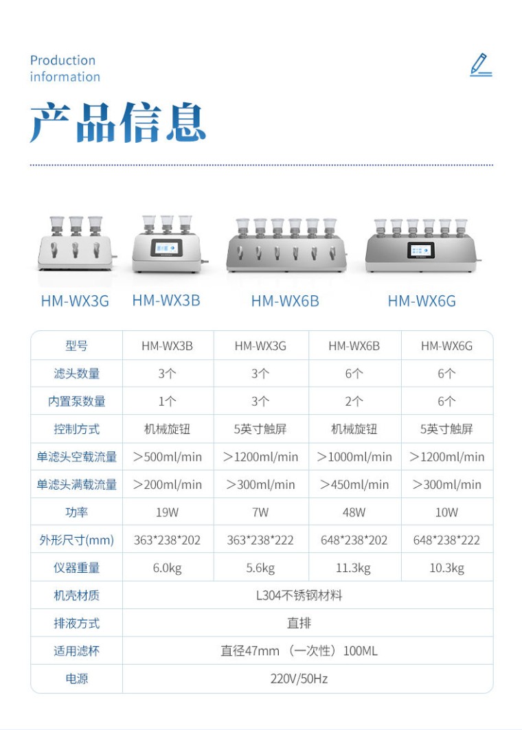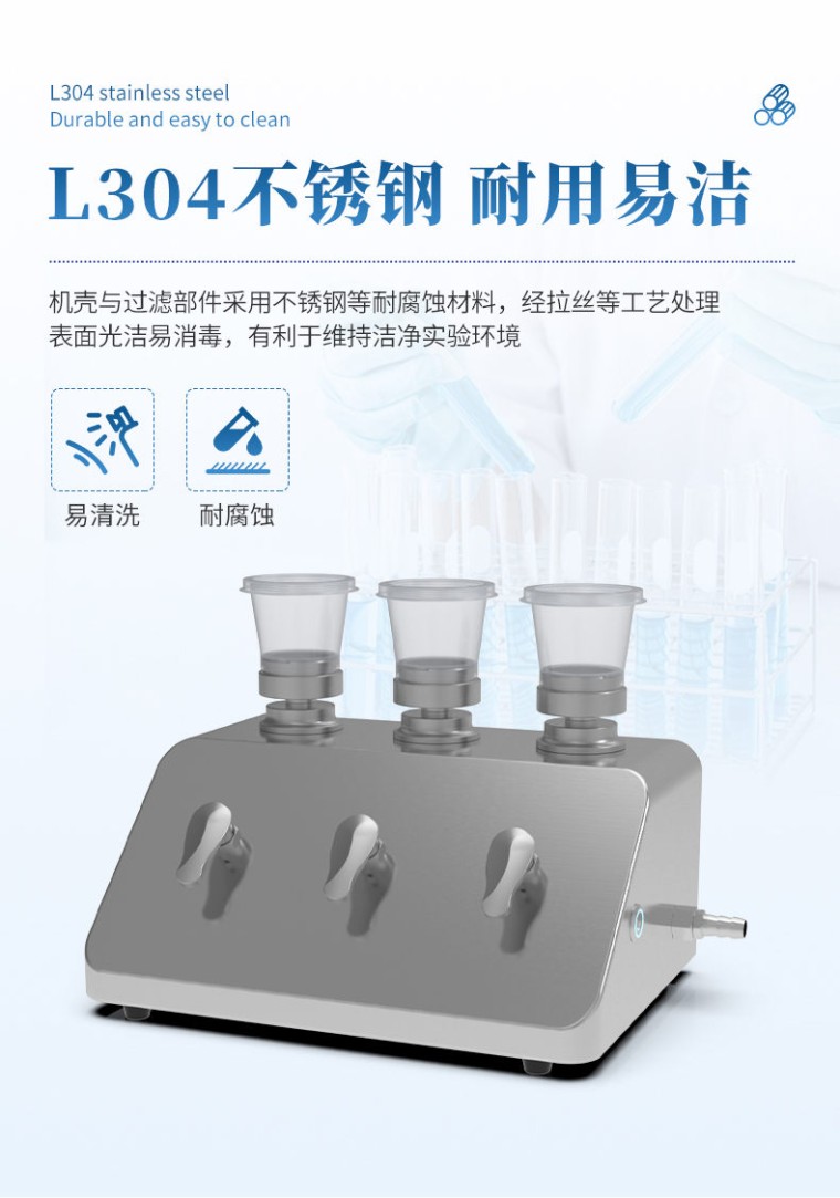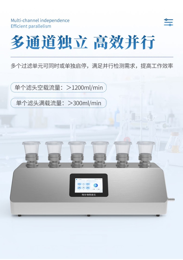 微生物限度过滤系统是依据《中国药典》及相关行业标准设计制造的专用微生物检测设备。该设备通过负压抽滤方式将供试液中的微生物截留于滤膜上,经培养后形成可见菌落,并通过计数准确测定样品中的含菌量。适用于药品、食品、化妆品、化工等行业的微生物限度检查。 适用范围: 制药行业:适用于制药用水(纯化水、注射用水)、液体原料及非规定灭菌制剂药品的微生物限度检验。 医疗器械行业:适用于医疗器械生产用水(纯化水、注射用水)的微生物限度检测。 食品饮料行业:用于瓶装水、啤酒、白酒、果汁等饮料及生产过程中液体原料的微生物检测。 疾控领域:用于生活饮用水、空调冷凝水等水样的细菌总数及致病菌检测。 化工行业:适用于各类需进行微生物检测的水样。 一、主要特征: 1、 抽滤时间可设定:支持抽滤时间参数设定,有效避免因人为操作差异导致供试液抽滤不充分,提高检测一致性。 2、 多隔膜泵集成设计:内置多组高性能微型隔膜泵,运行噪音低,无需抽滤瓶,过滤后液体直接排放,操作更简便。 3、 灭菌方式灵活:过滤单元支持火焰快速灭菌及在线消毒;选用一次性滤杯时,泵头采用拔插式结构,便于拆装并适配多种灭菌方式。 4、 防逆流保护:采用新型防逆流技术,有效防止液体回流,减少误操作对实验结果的影响。 5、 多通道独立控制:多个过滤单元可同时或单独启停,满足并行检测需求,提高工作效率。 6、 易清洁结构设计:整机外壳采用不锈钢材质,经拉丝等工艺处理,表面光洁平整,便于日常清洁和消毒。 二、技术参数: 1、 电源:220V/50Hz 2、 功率:10W 3、 滤头数量:6个 4、 内置泵数量:6个 5、 排液方式:直排 6、 控制方式:5寸触屏 7、 适用滤杯尺寸:直径47mm (一次性)100ML 8、 单个滤头流量:>1200ml/min(空载),>300ml/min(满载) 9、 机壳材质:L304不锈钢材料 10、 尺寸:648x238x222(mm) 11、 重量:10.3kg